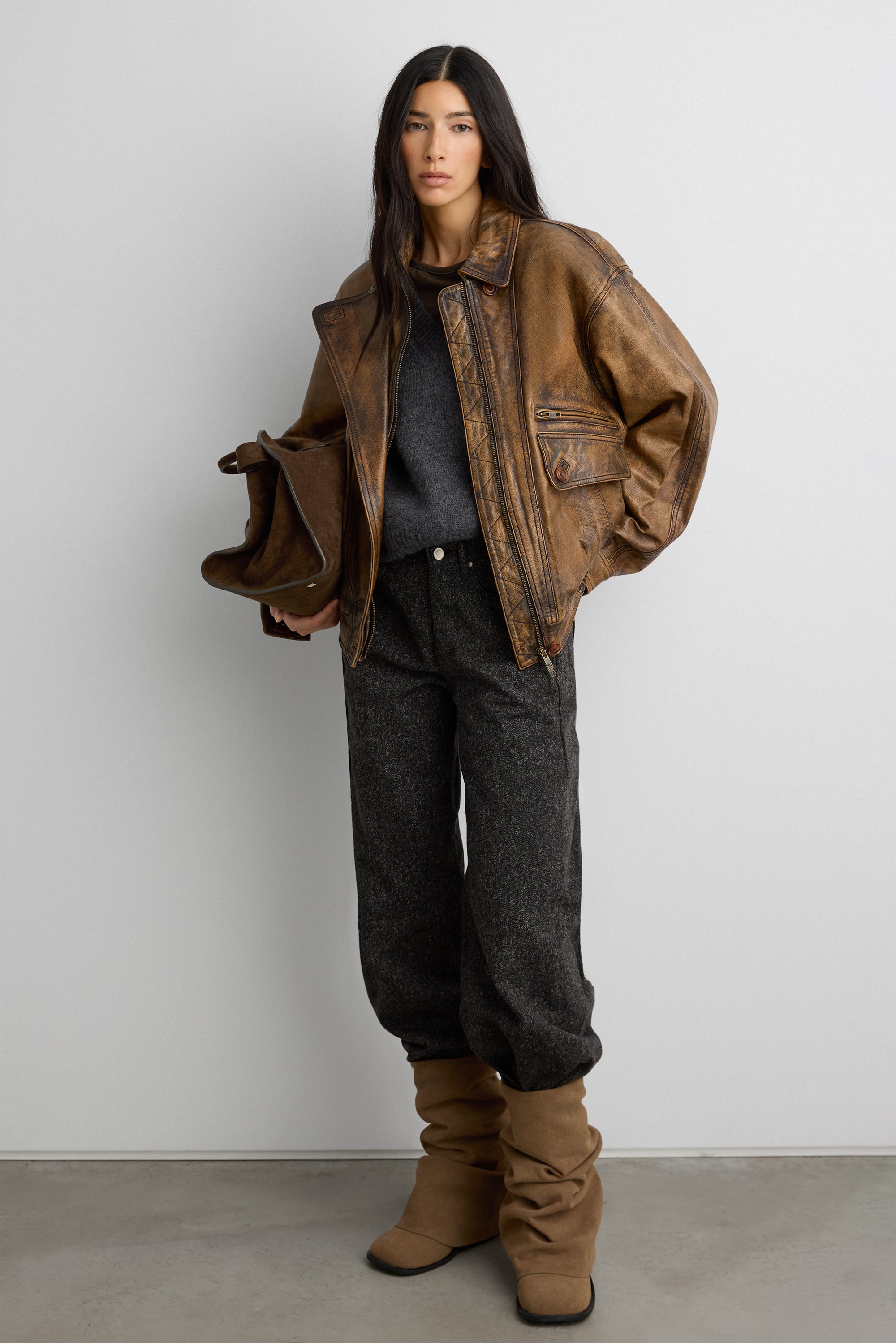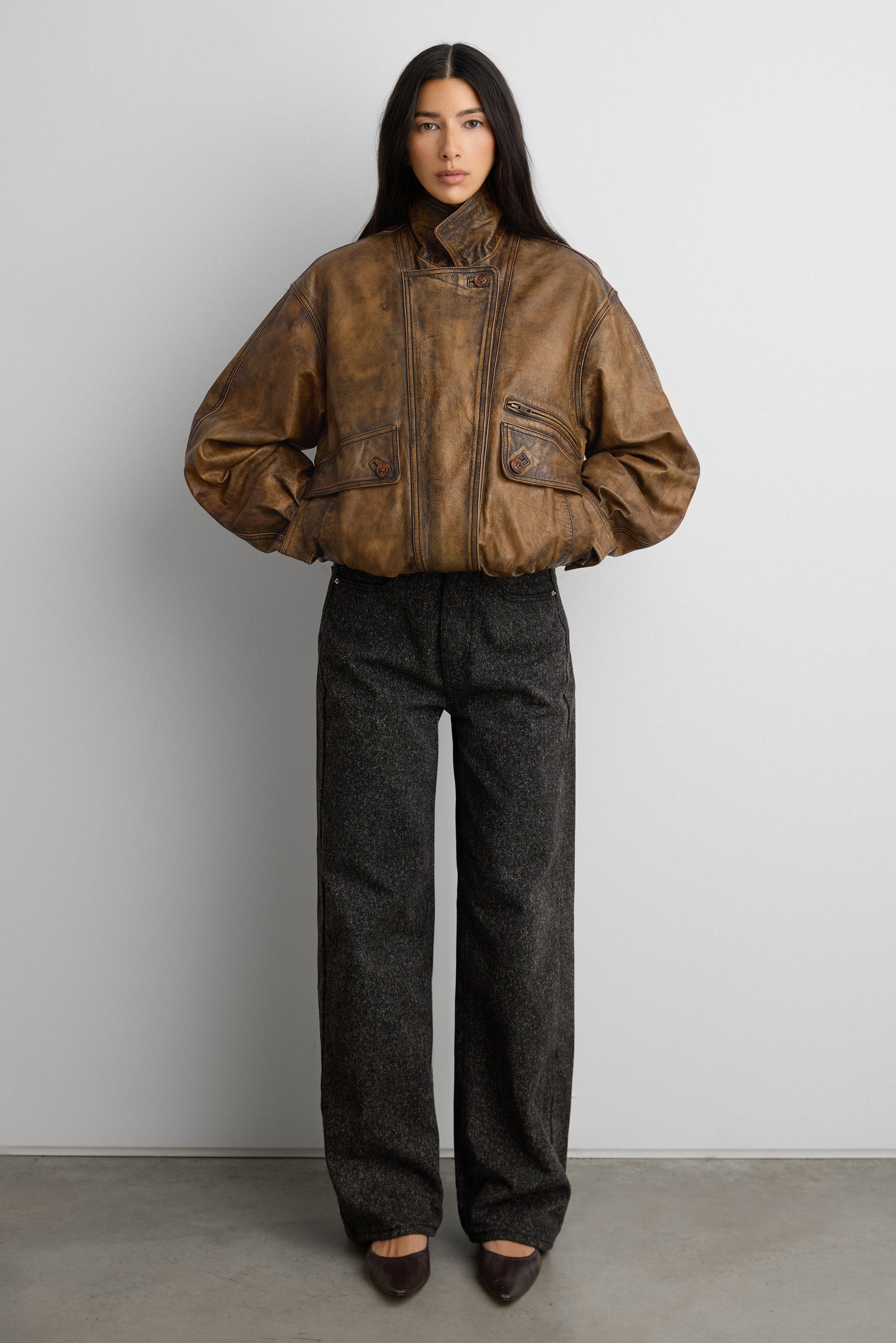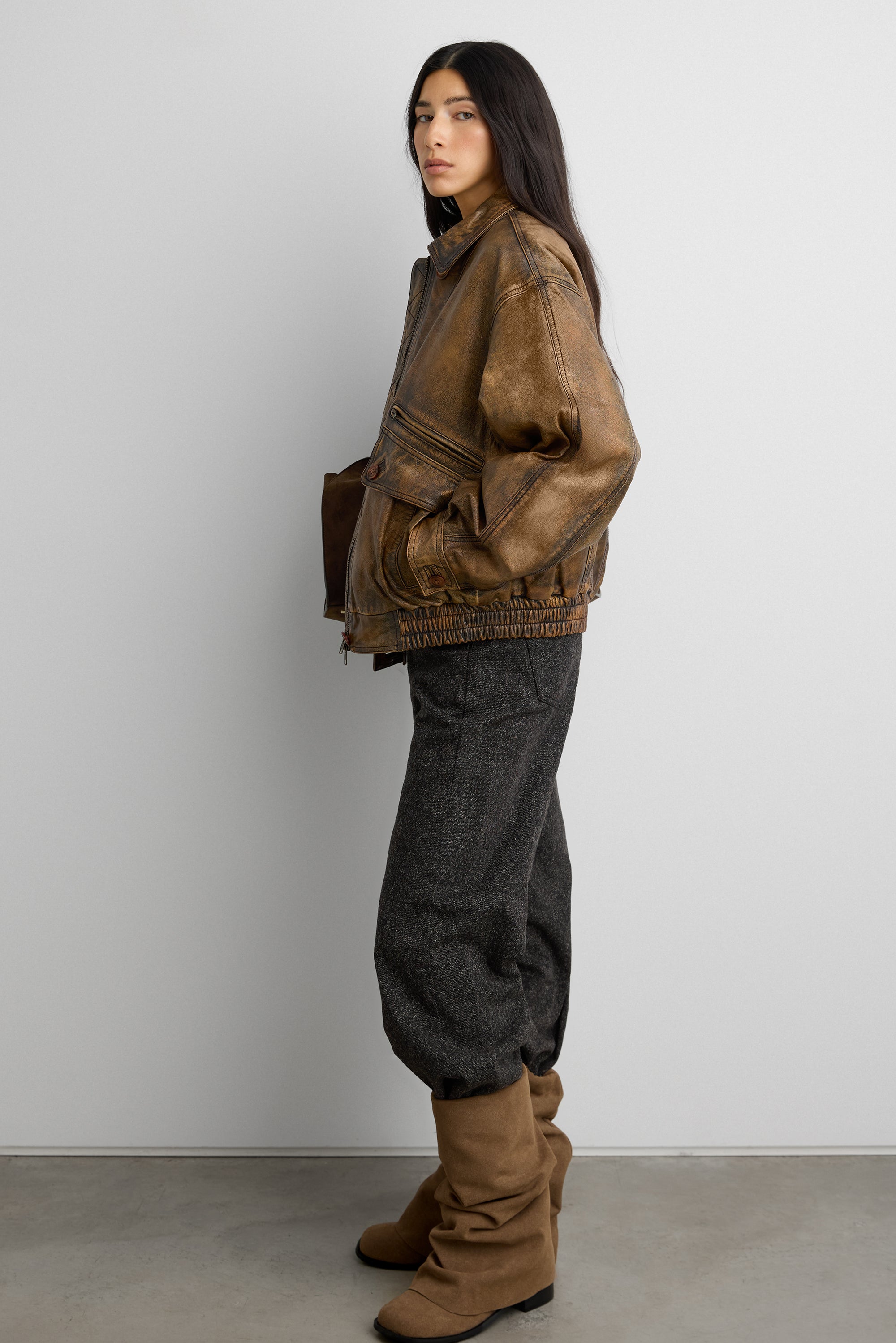 This brown vintage-inspired distressed bomber jacket is made from 100% genuine leather in relaxed fit. It features a front zip, pleats at the cuffs and front flap pockets for added function. A must-have to own in your wardrobe, wear yours with a fitted tank and jeans.