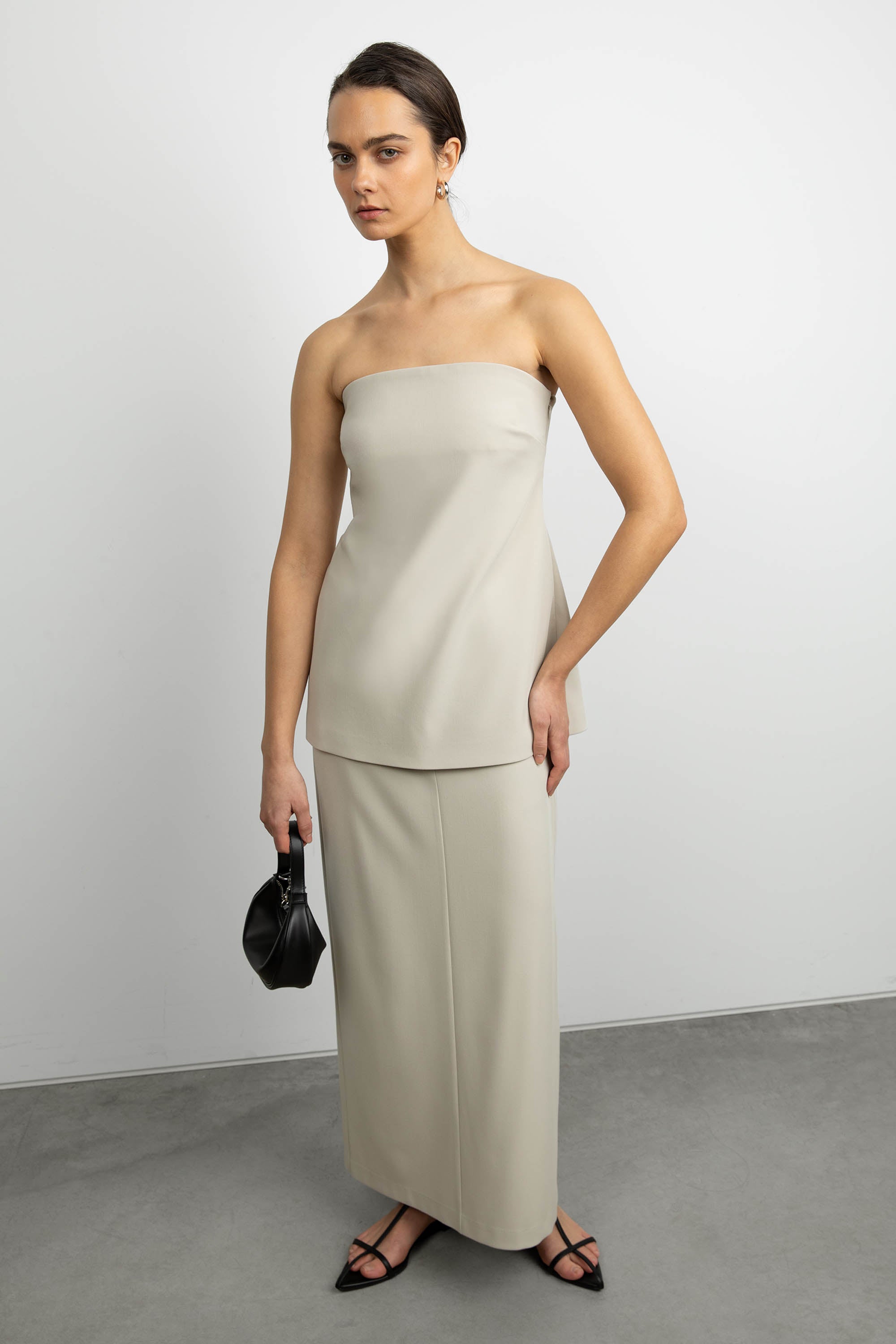 This maxi suiting skirt is cut from recycled materials that is GRS certified —a climate-friendly approach to production which reduces the harmful impact on environment. It has a relaxed fit with a high-rise waist with belt loops and side pockets. Wear it as a set with the Suiting Tube Top (WT-12484-W).