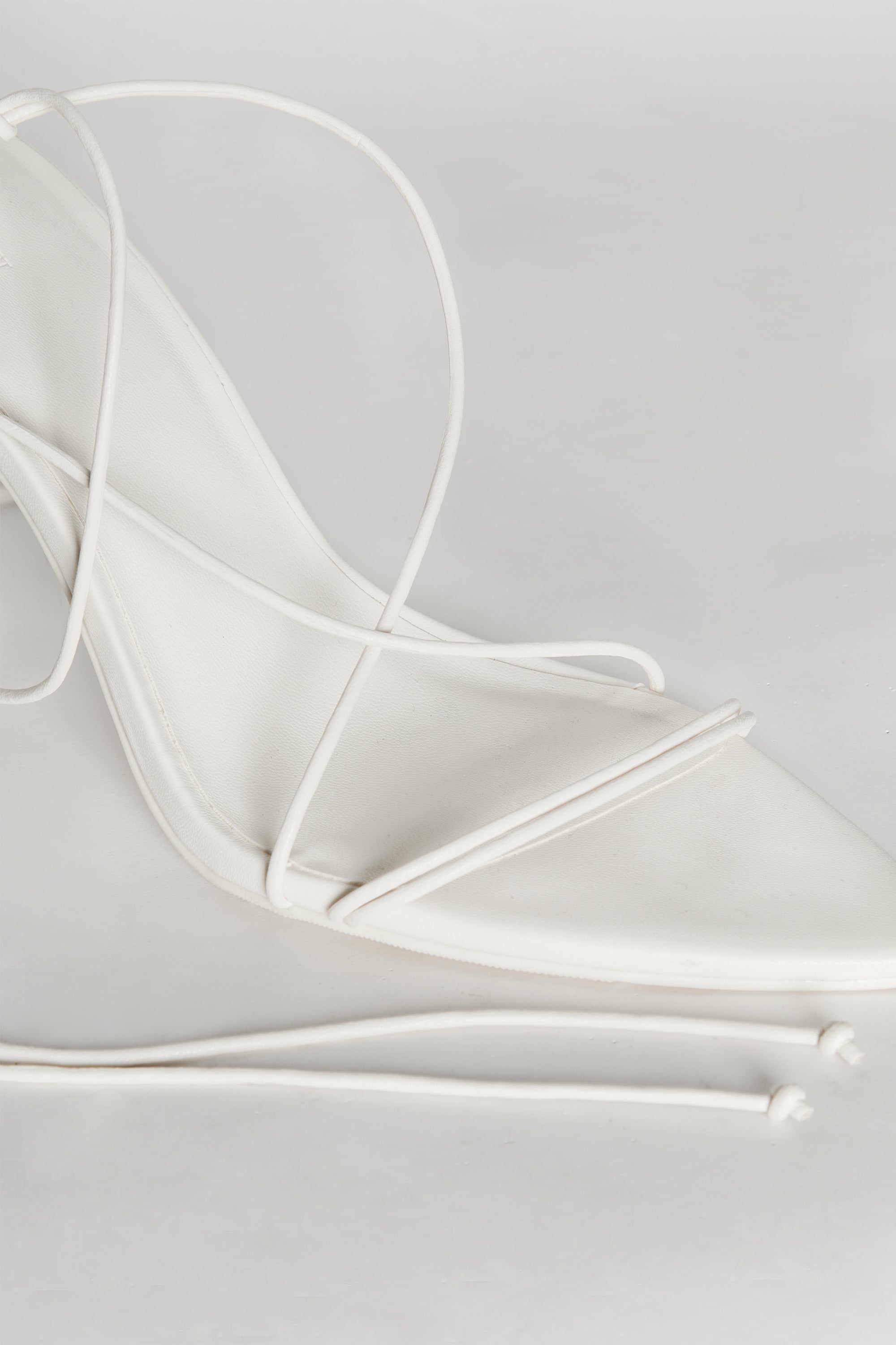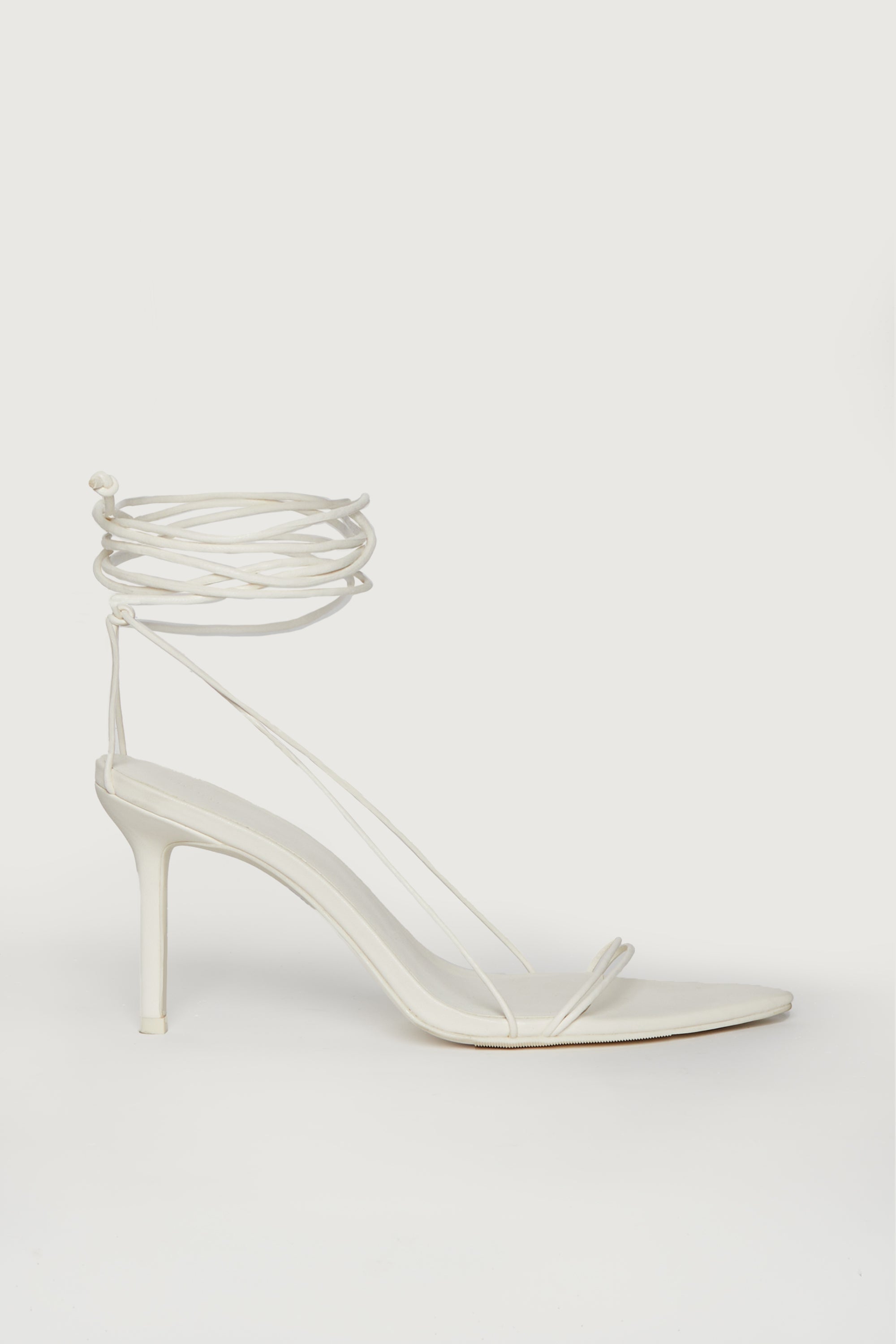 These adjustable strappy heels feature a 3.5" stiletto heel and a pointy toe with metal tip. Your new favourite heels to pair with any elevated look. (White colour does not have metal tip.)