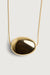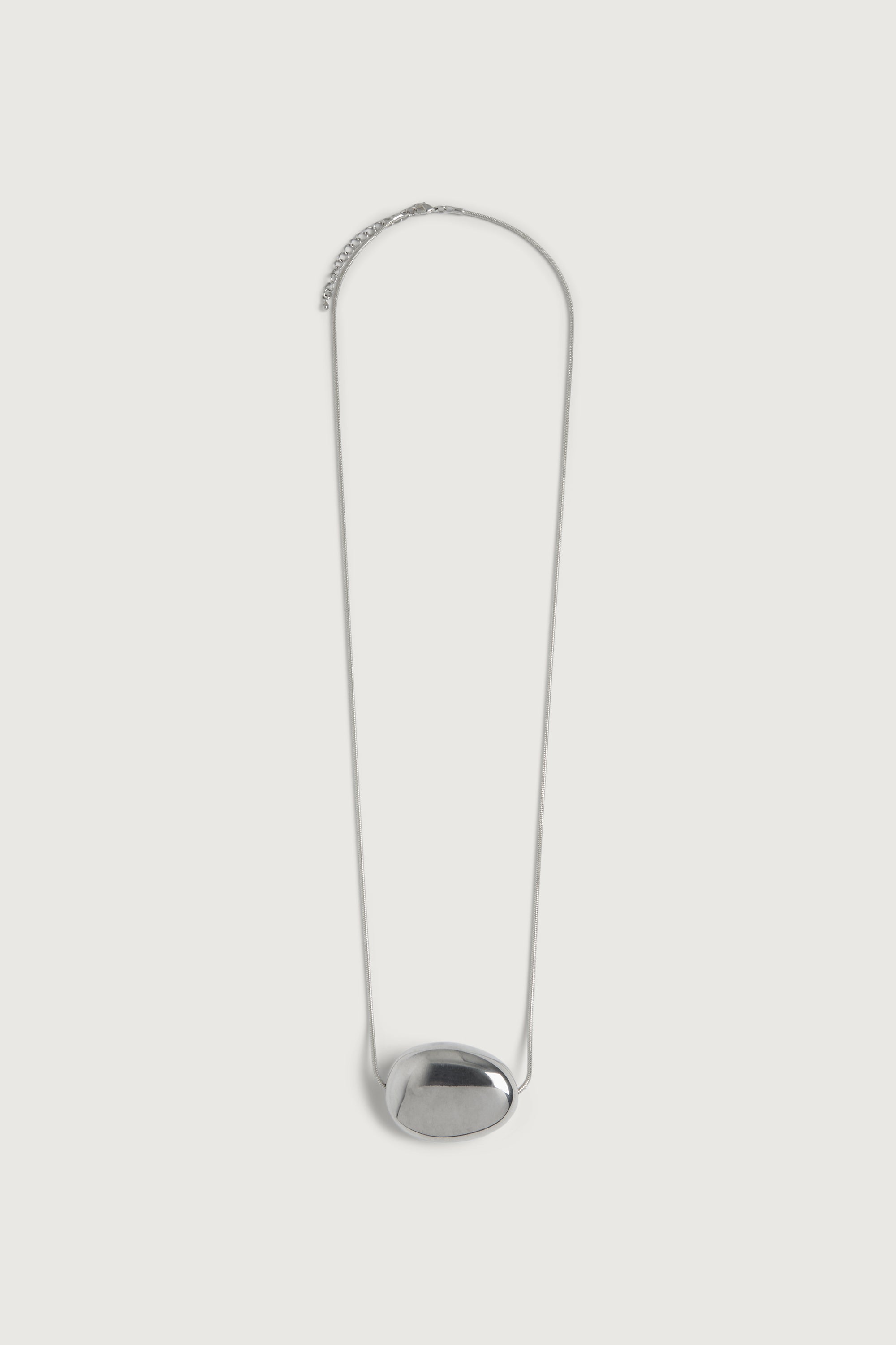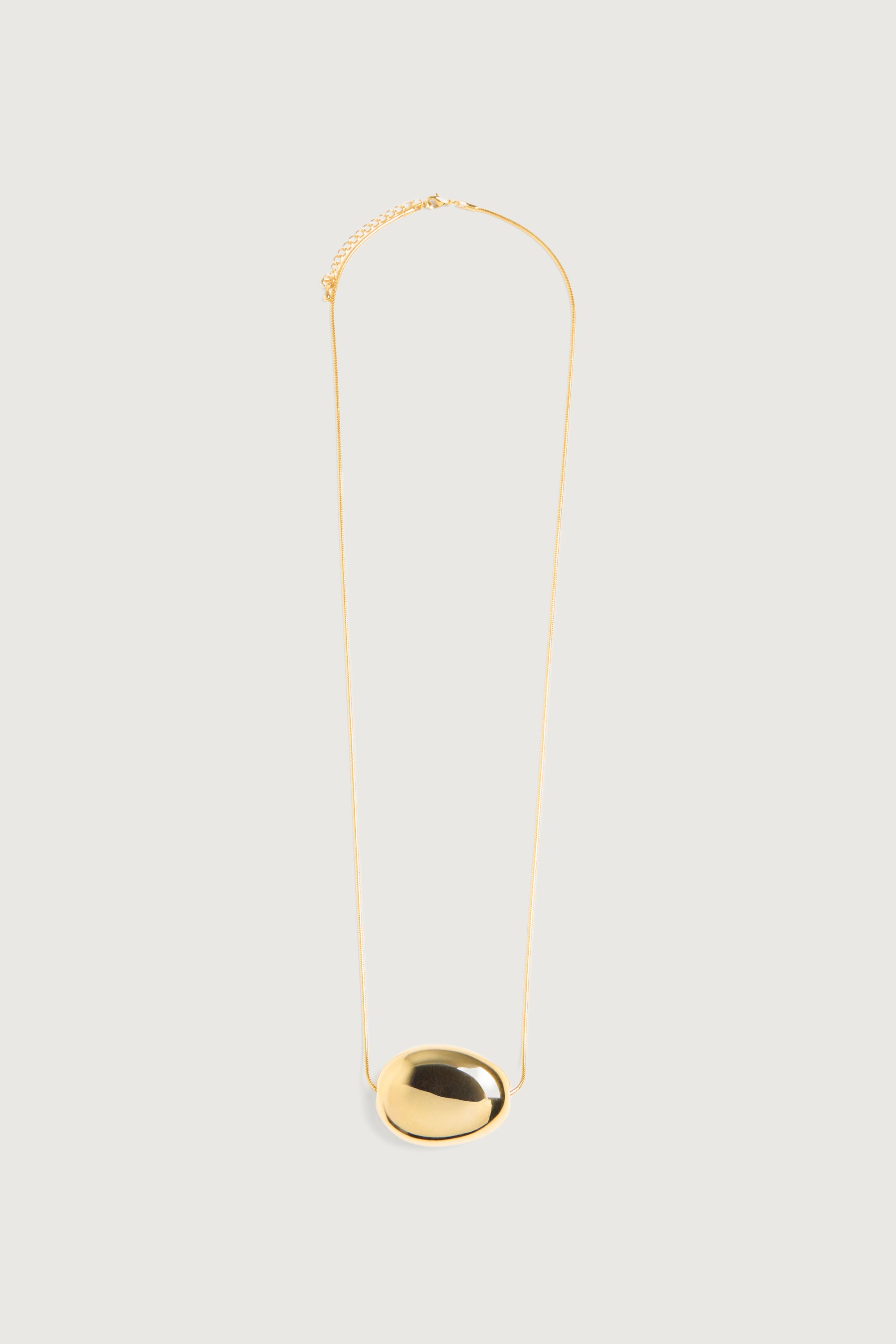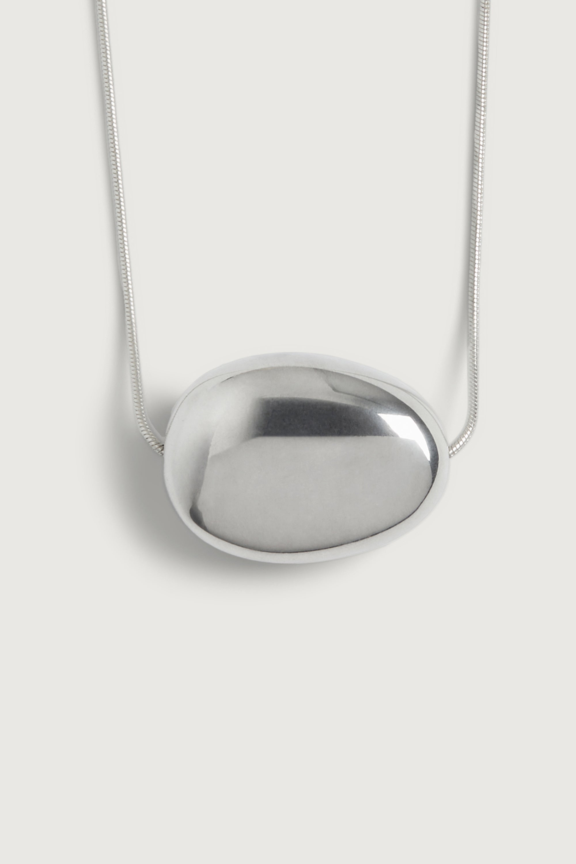 This necklace features a snake bone chain and a high shine pebble shaped pendant. You can wear this for any occasion, and can be styled alone or layered.