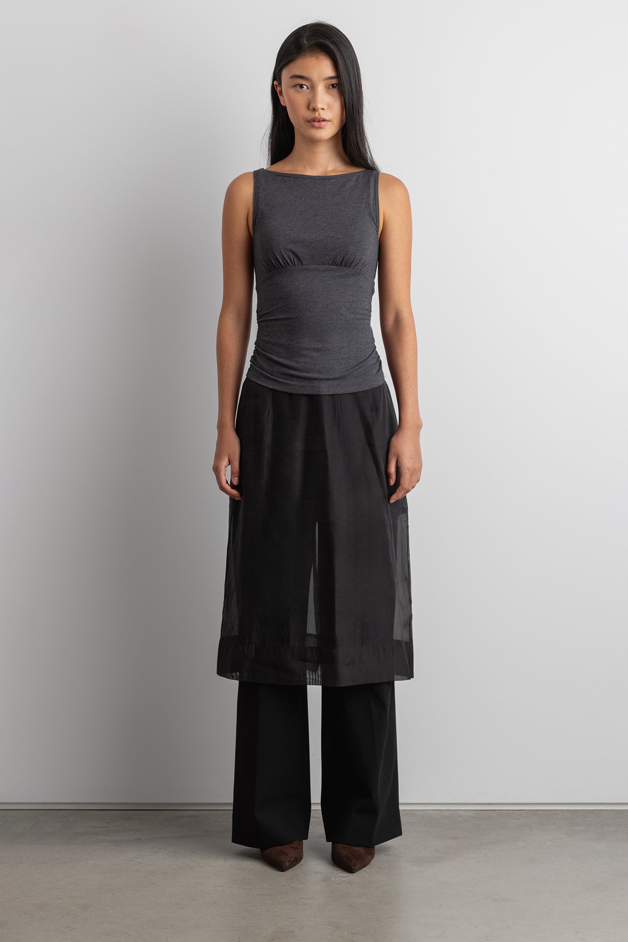 Cotton modal. Enzyme wash effect. High boat neckline. Ruching at sides at bust.