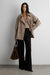 Double-breasted front. Belt with buckle at waist and sleeves. Notched lapels. Back vent and slit. Side pockets.