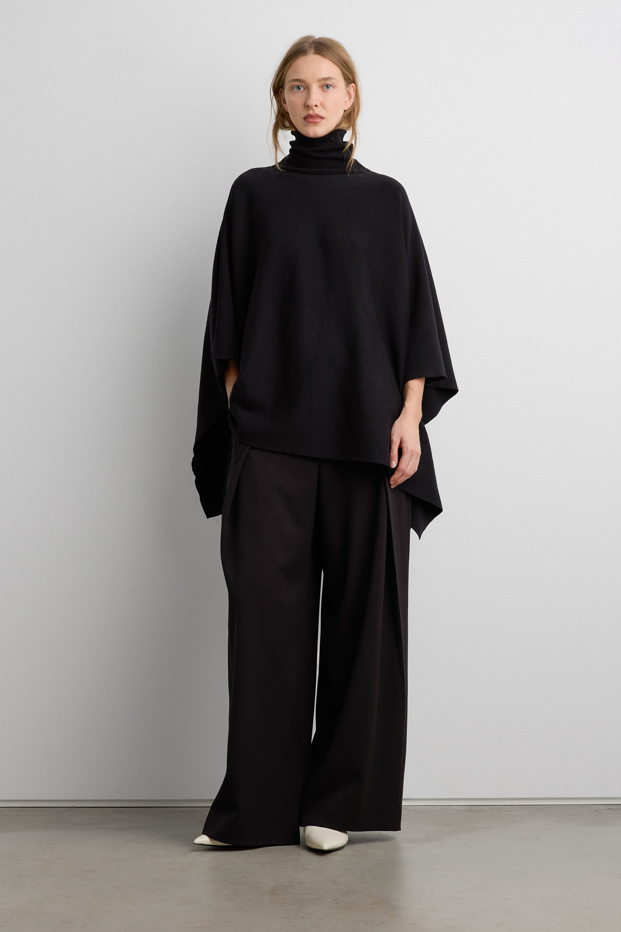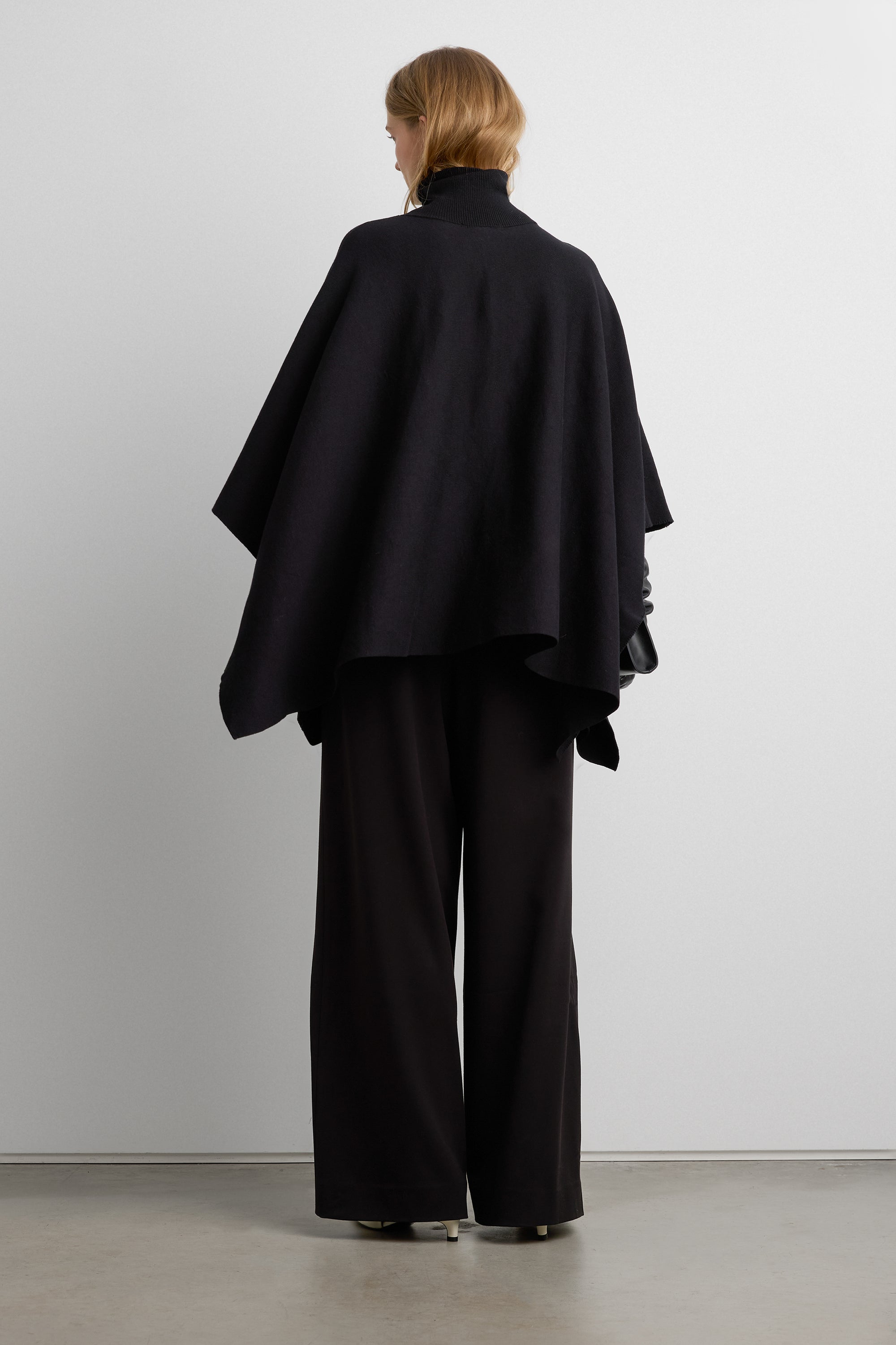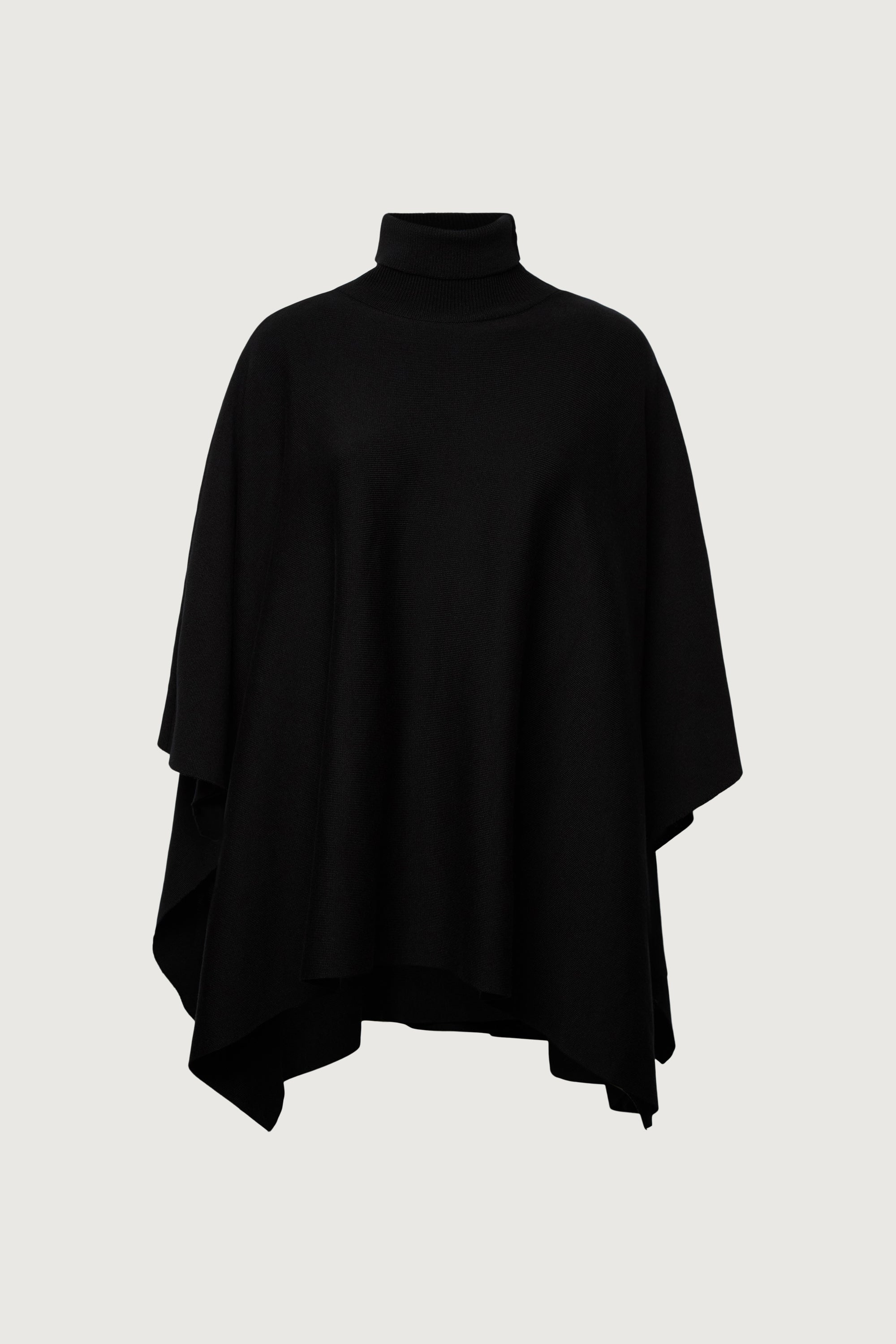 Knit fabric. Turtleneck design. Cape silhouette.