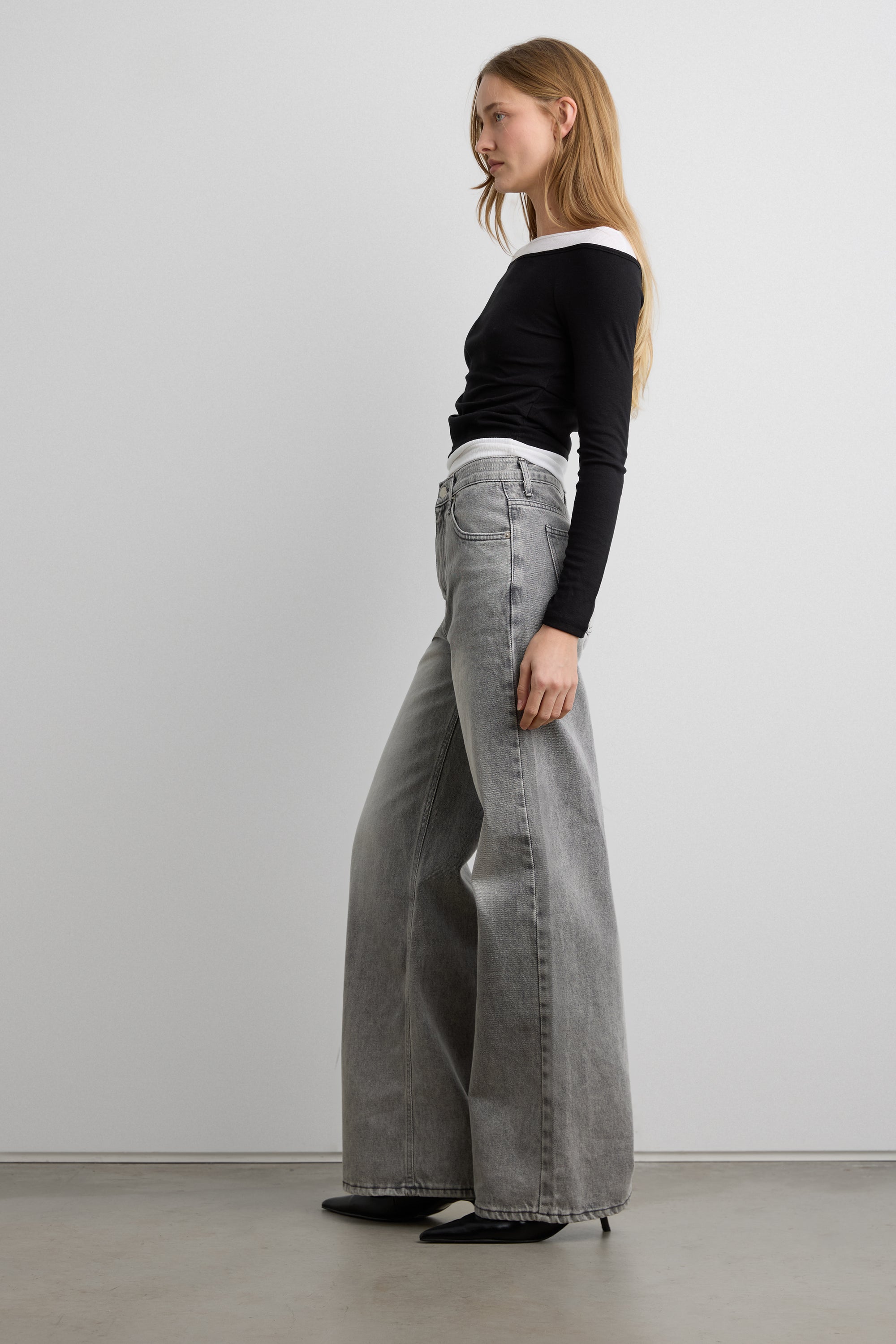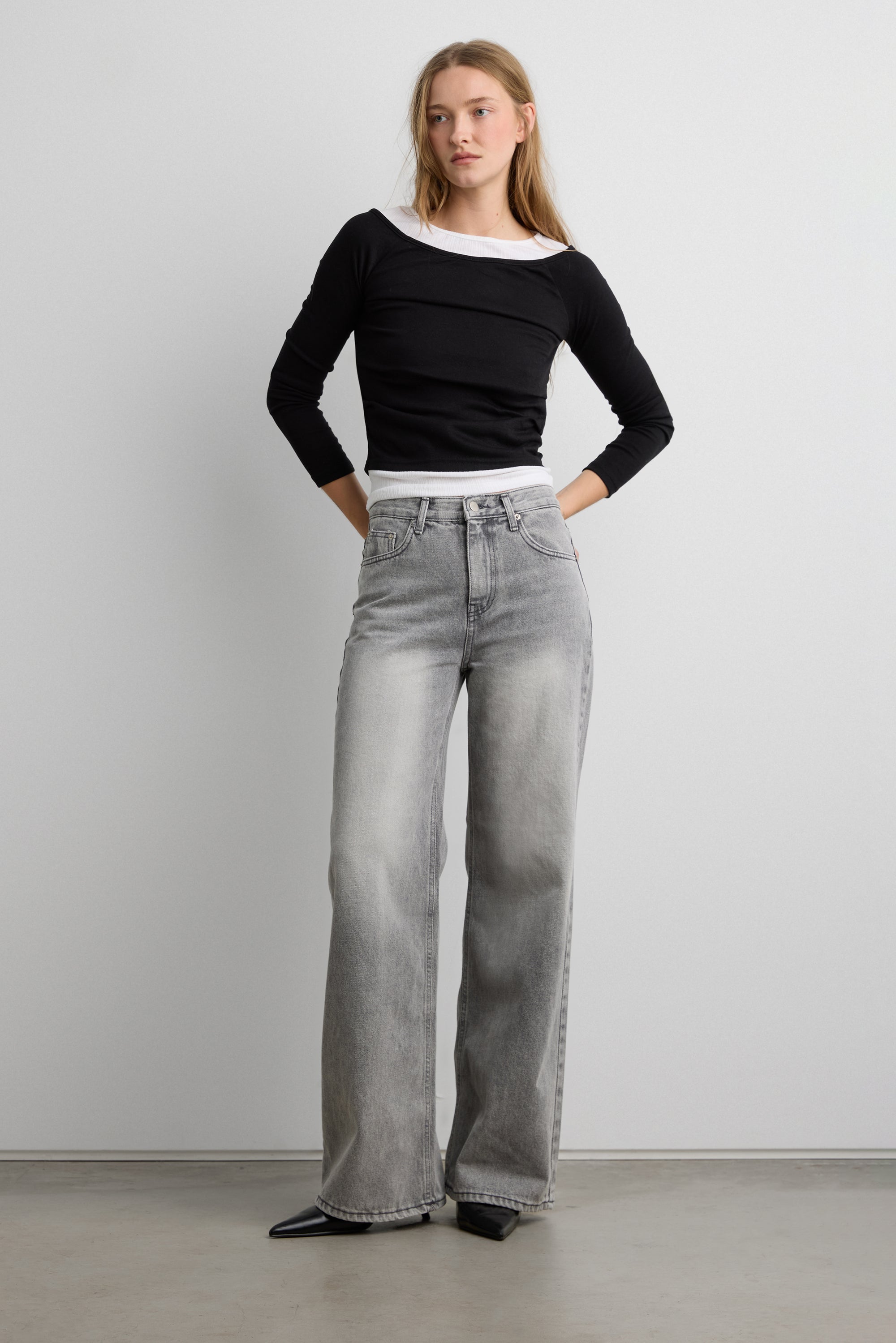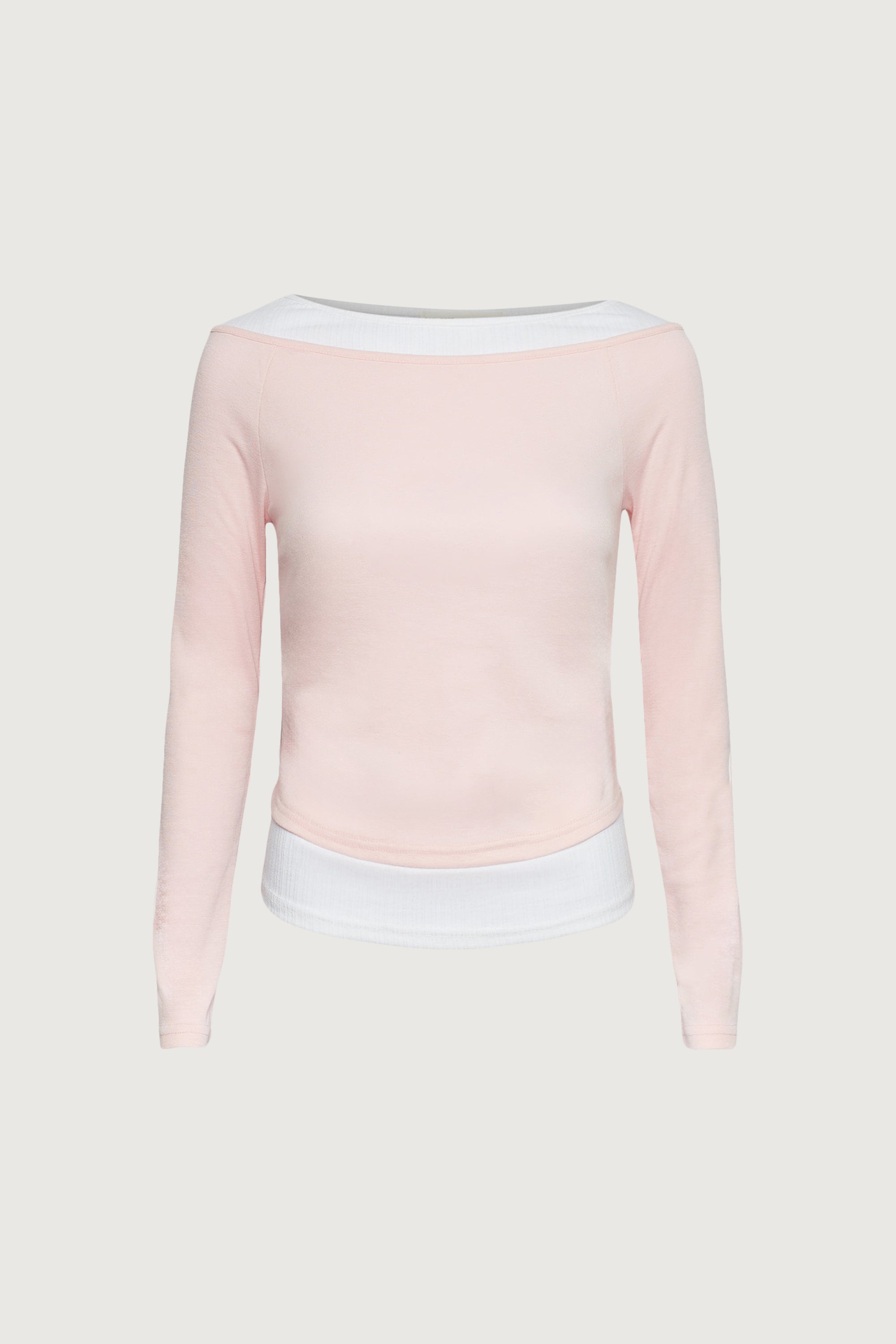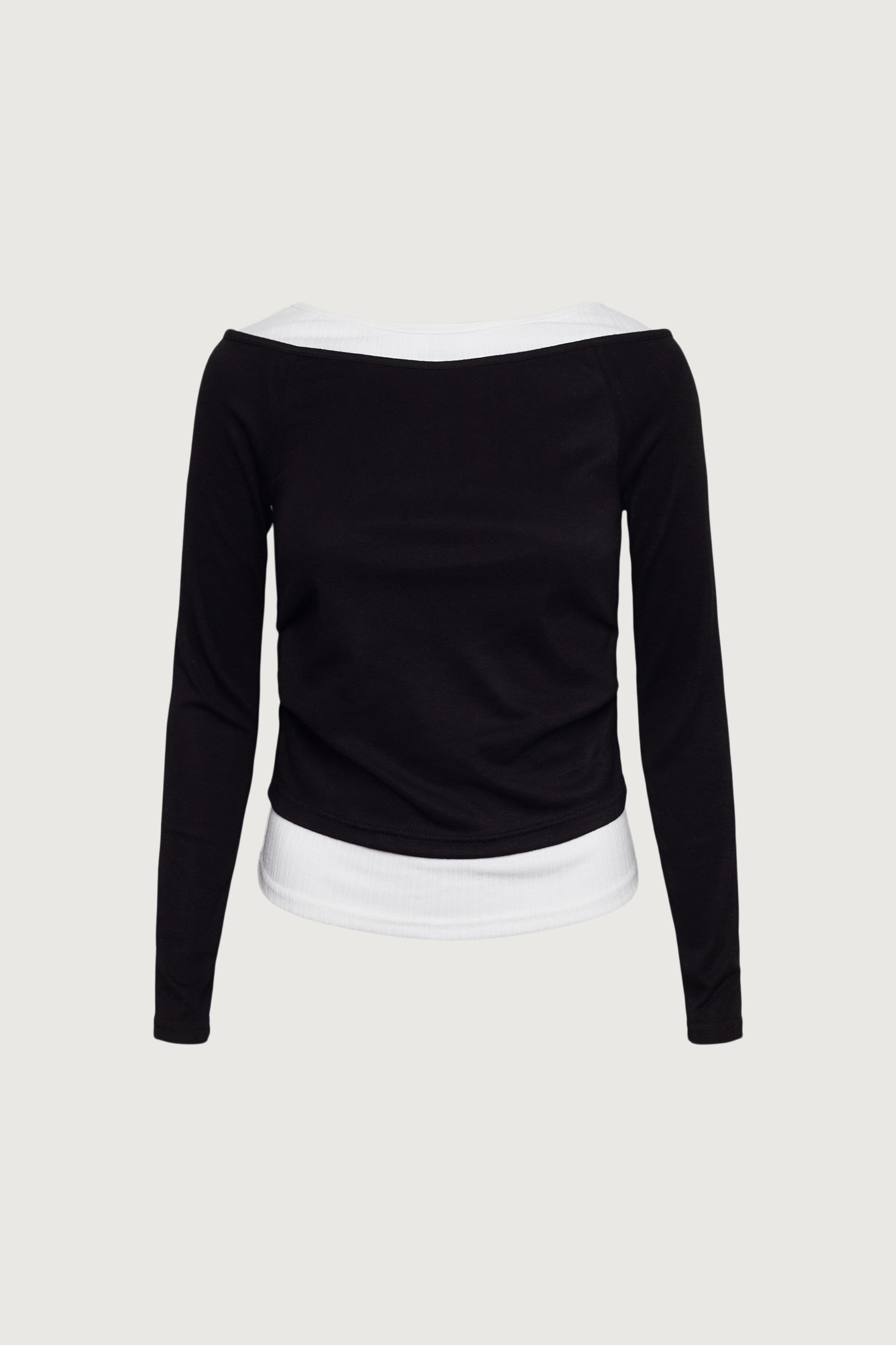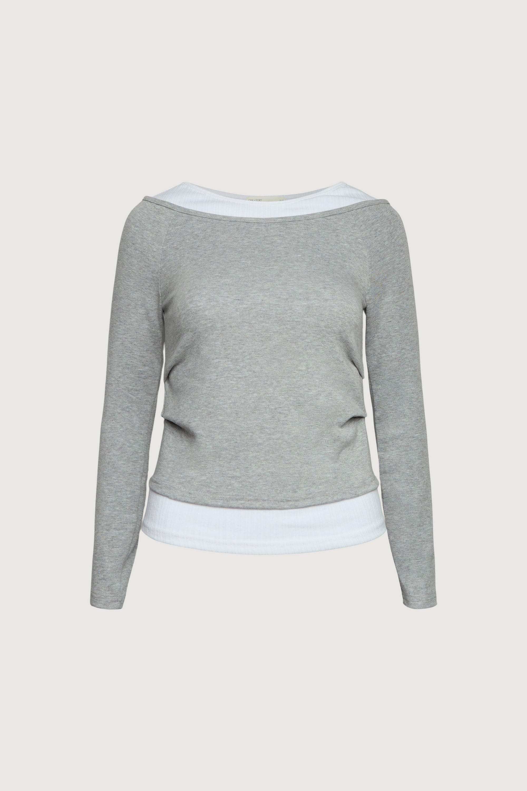 This long sleeve top has boat neckline and features side ruching and a layered effect over a white top. Wear it casually with shorts or a skirt this season.