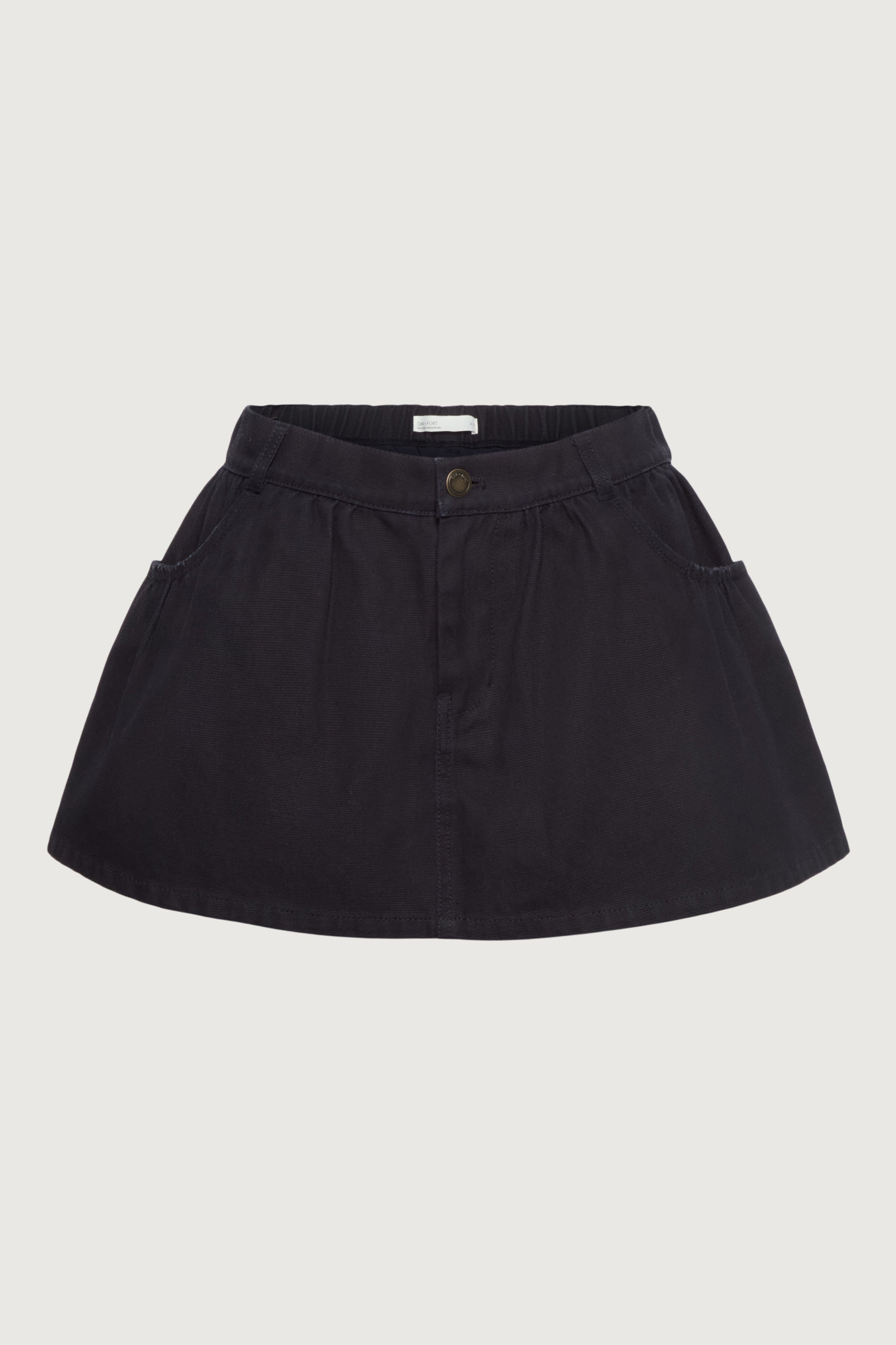 This ultra mini skirt is cut from a cotton canvas in a relaxed fit. It has an elasticated waist, back patch pockets and is lined with shorts. Wear yours as a set with the matching chore jacket and boots.