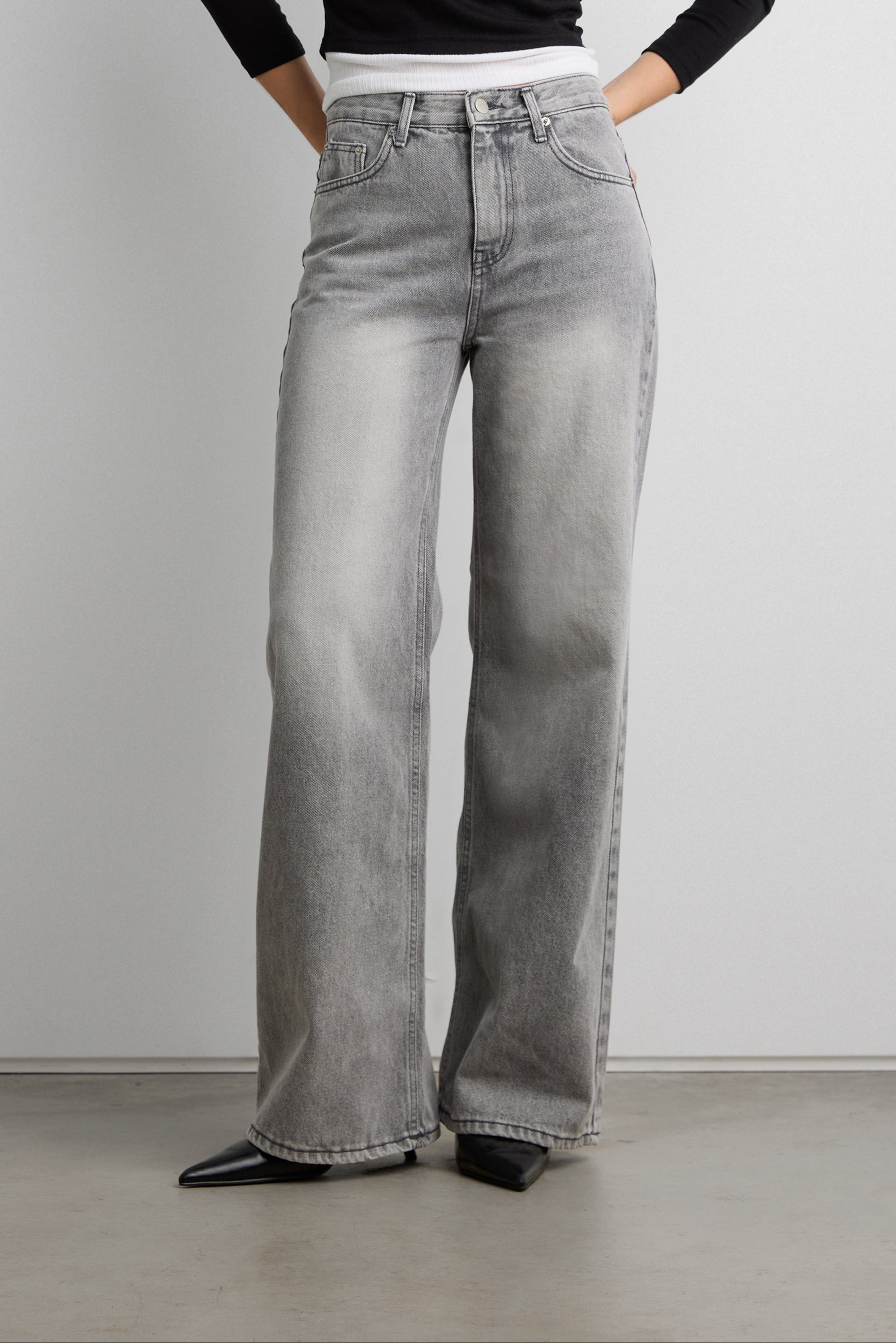 These grey wash denim jeans are made in a relaxed fit and straight leg cut with a subtle flare. It features fading on each leg, a mid-rise waist and a 5-pocket design.
