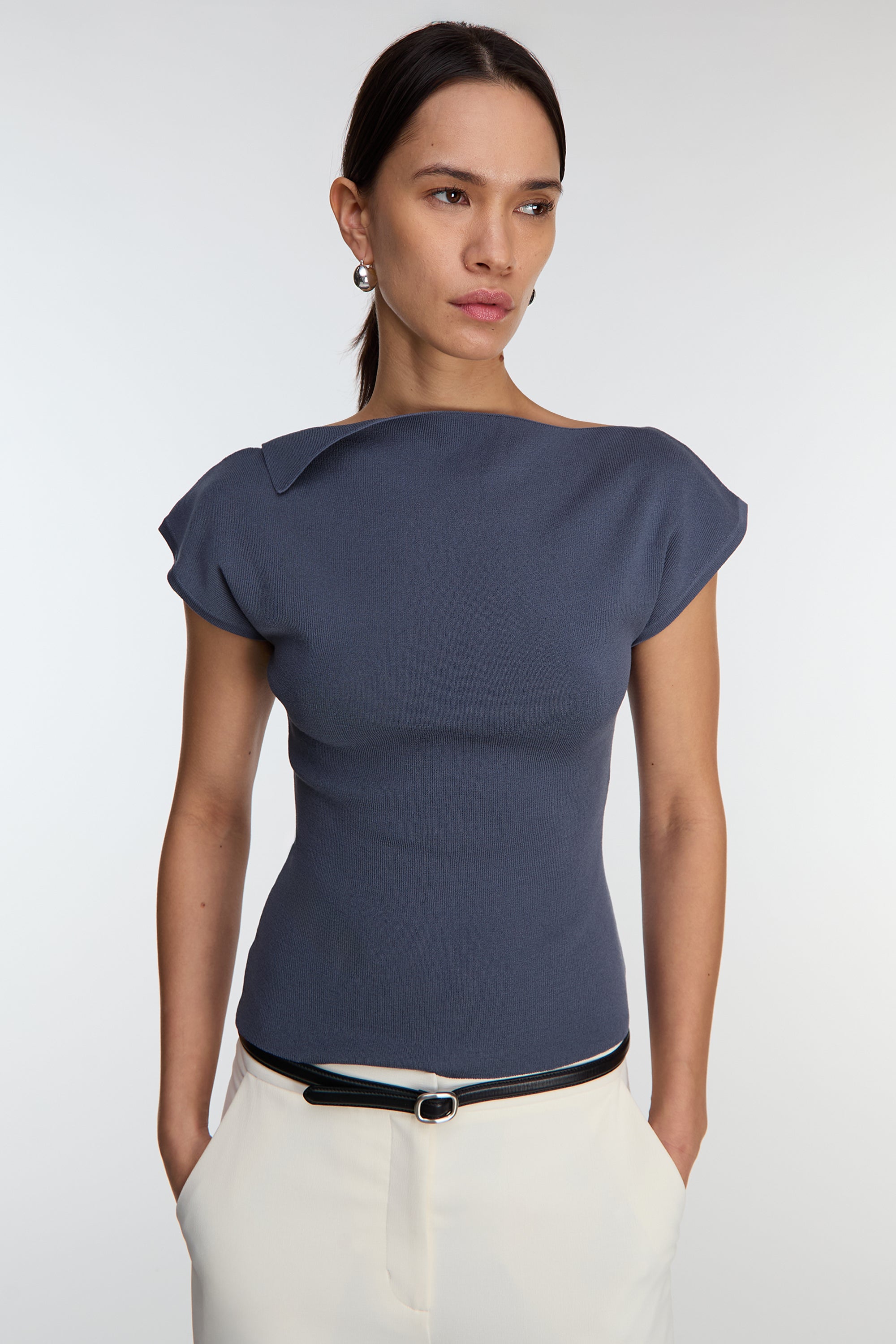 This cap sleeve sweater is made in a slim fit and is detailed with an asymmetrical neckline. An elegant and effortless top you can style with any bottoms from trousers to wide leg jeans.