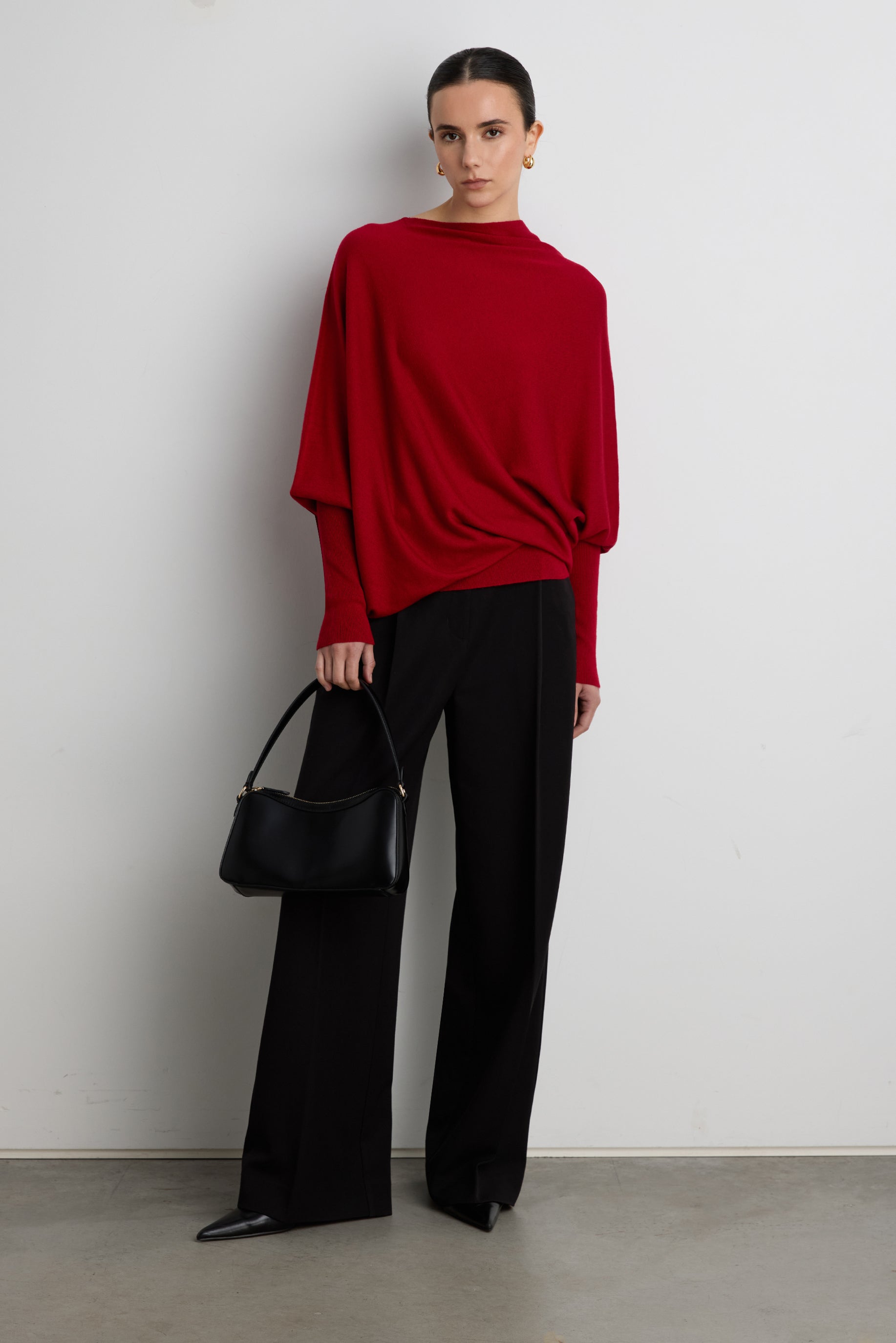 This asymmetrical sweater features a relaxed fit with subtle draping through the body and a refined cuffed sleeve detail for added structure. It has touches of wool for added softness and it's an easy, modern knit designed to elevate everyday looks with minimal effort. You can ever wear yours as a mini dress.