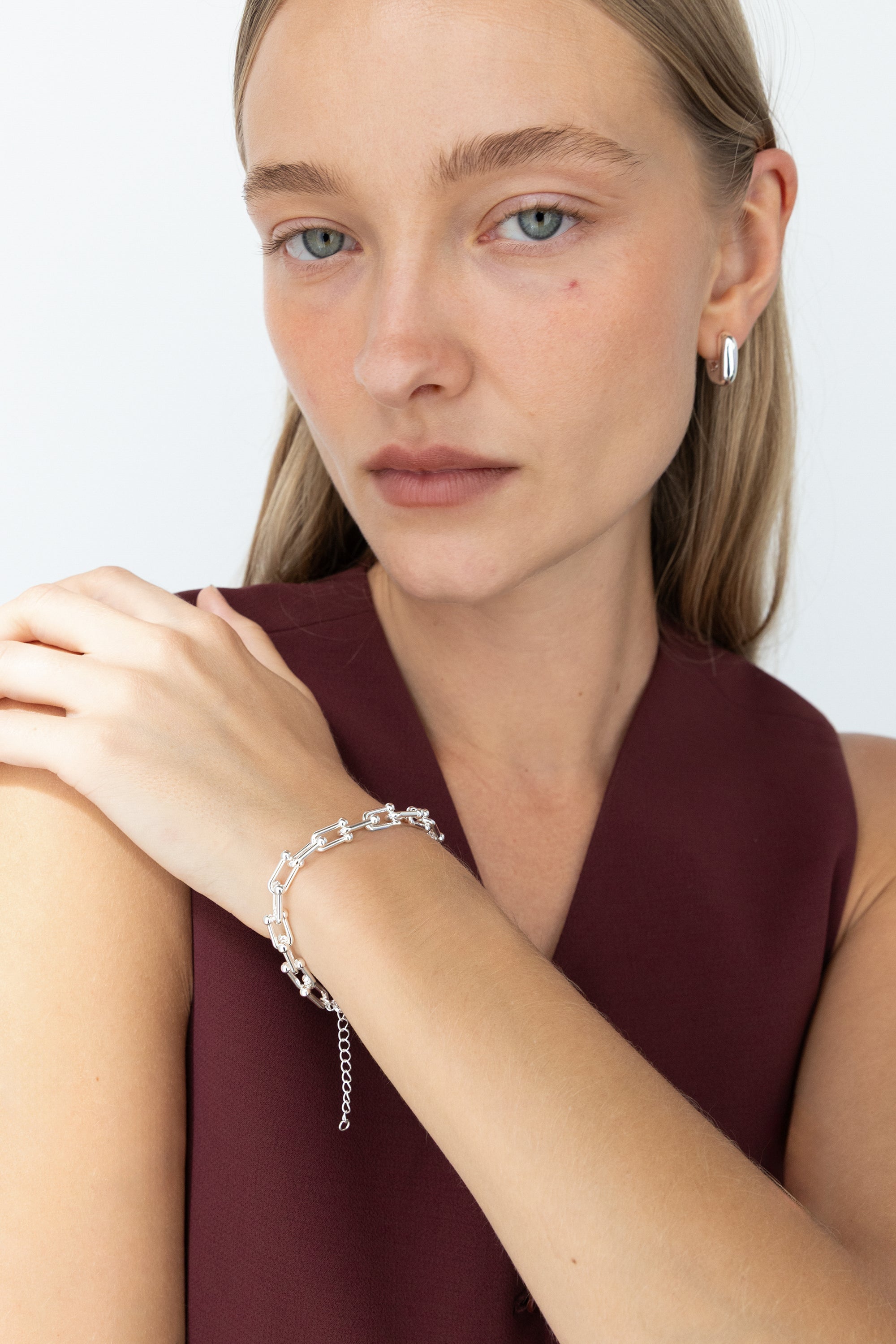 This bracelet features a unique u-lock ball chain design. Stack them with other bracelets, or wear it alone for a more minimal look.