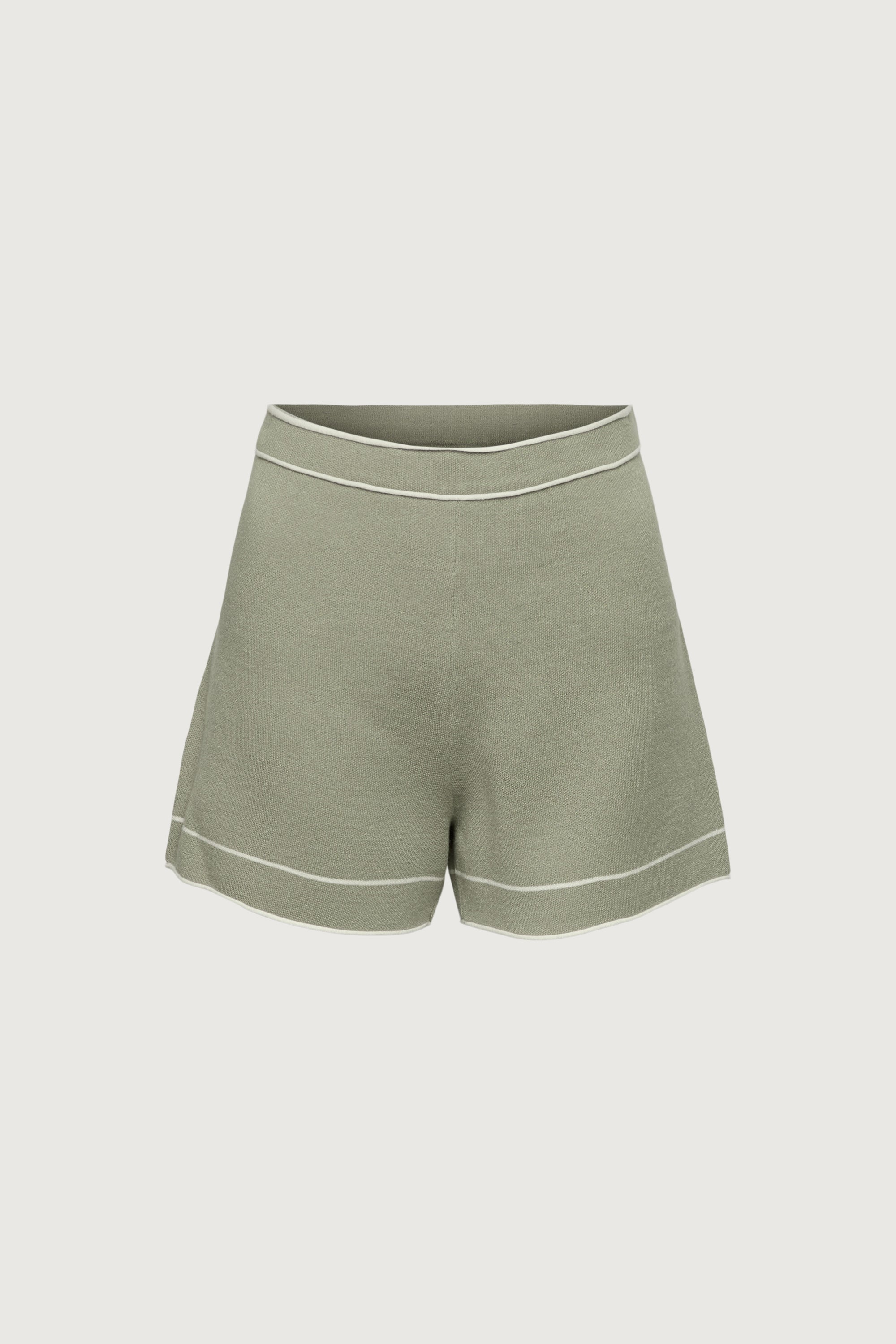 These knit shorts are made in a body-hugging fit with a high-rise, elasticated waist. The trims are detailed with contrast edges for a Parisian feel. A comfortable choice you can style with a graphic tee or wear it as a set with a cropped knit sweater (SW-8525-W).