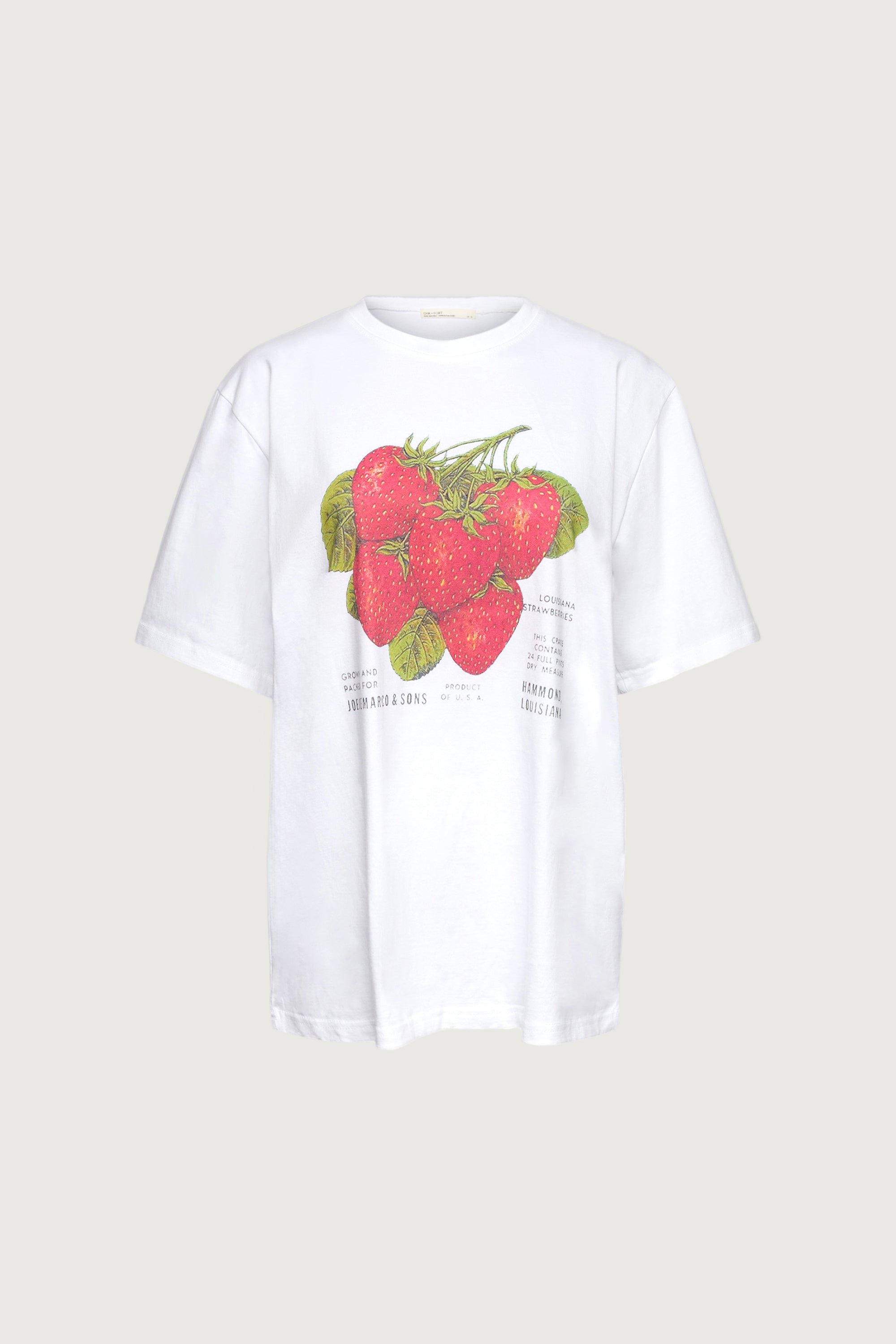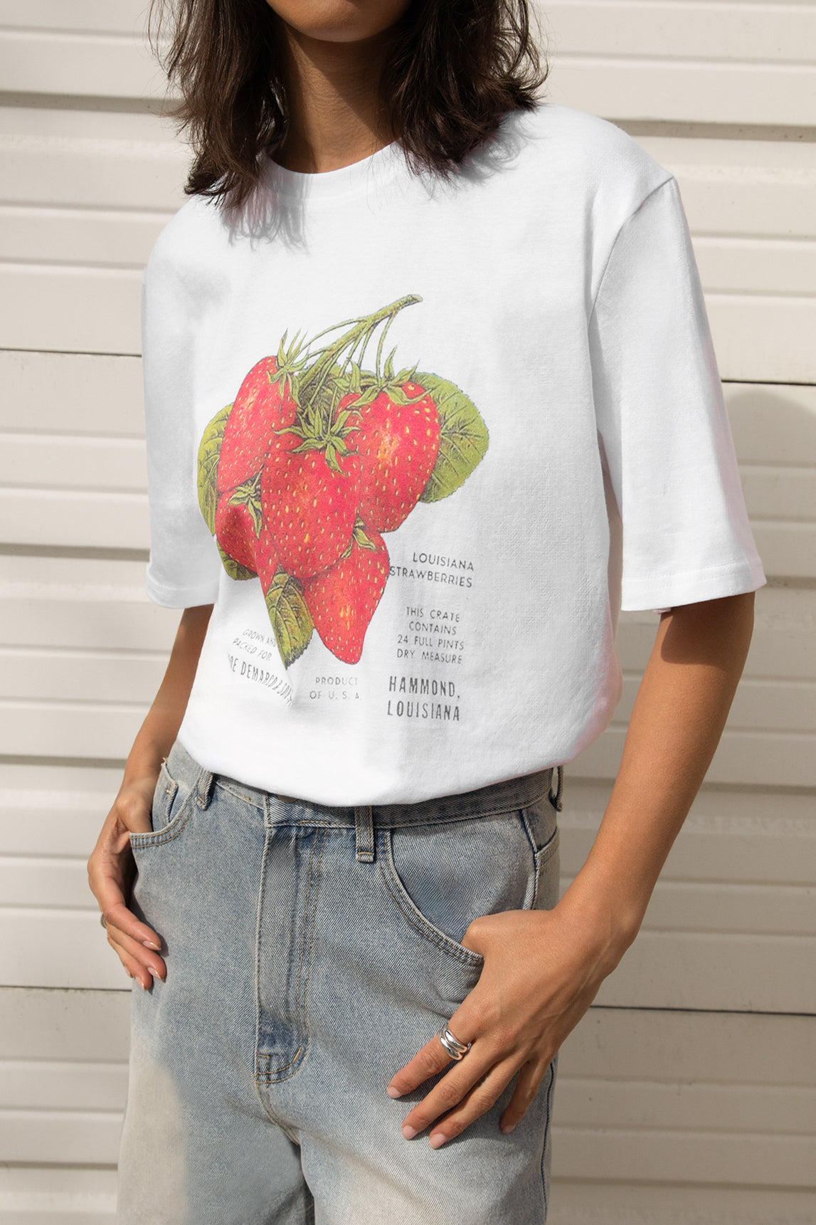 This short sleeve t-shirt features a strawberry graphic on the front. Wear yours with a red gingham skirt or classic denim jeans this season.