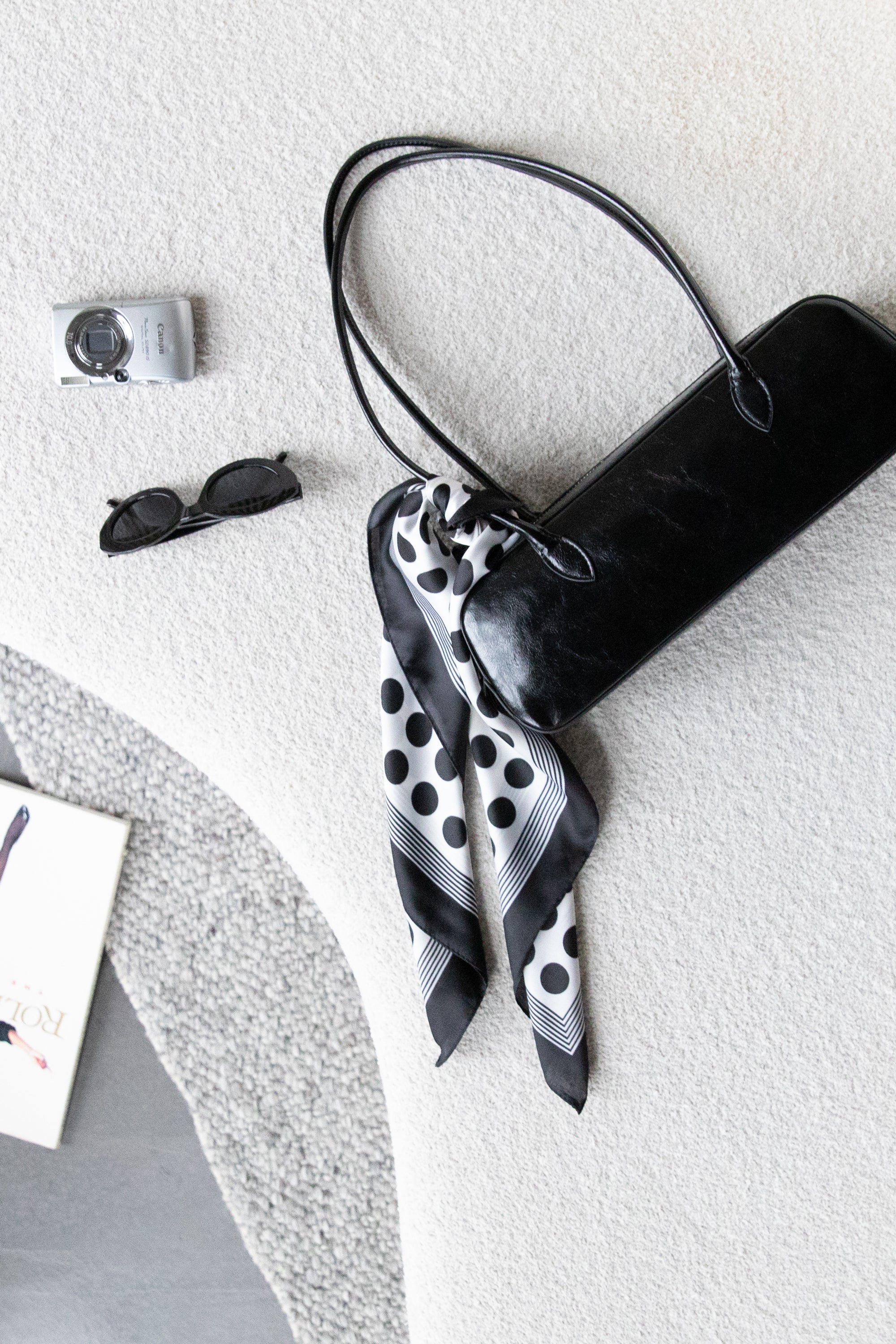 Wear this polka dot printed head scarf around your head for a chic look. Or even tie around your shoulders or tie on your bag.