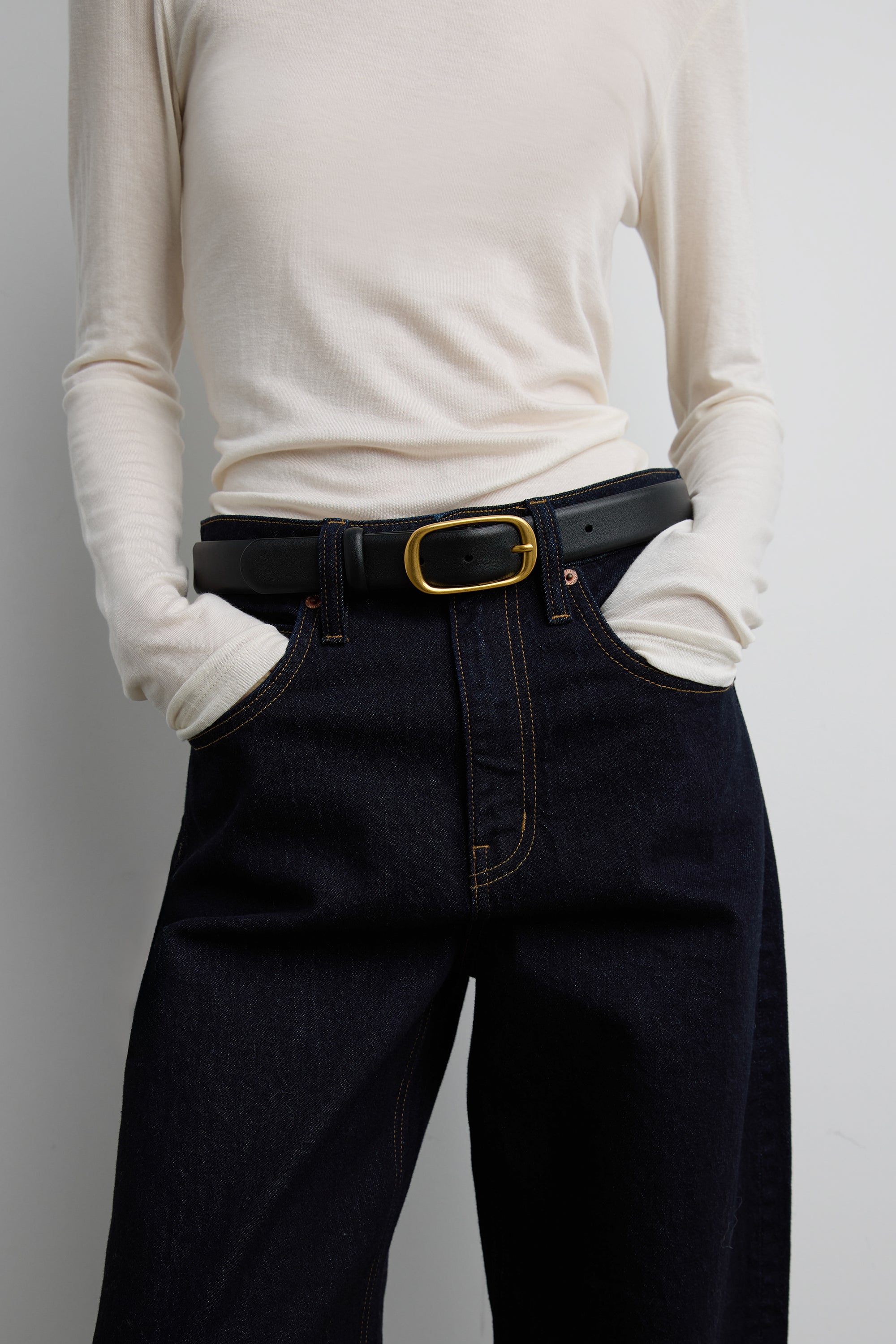 A timeless belt crafted from genuine nappa lambskin leather. Designed with a rounded brushed metal buckle, this piece balances polish and versatility. Whether styled over tailored trousers or denim, it offers a refined finish that complements any look.
