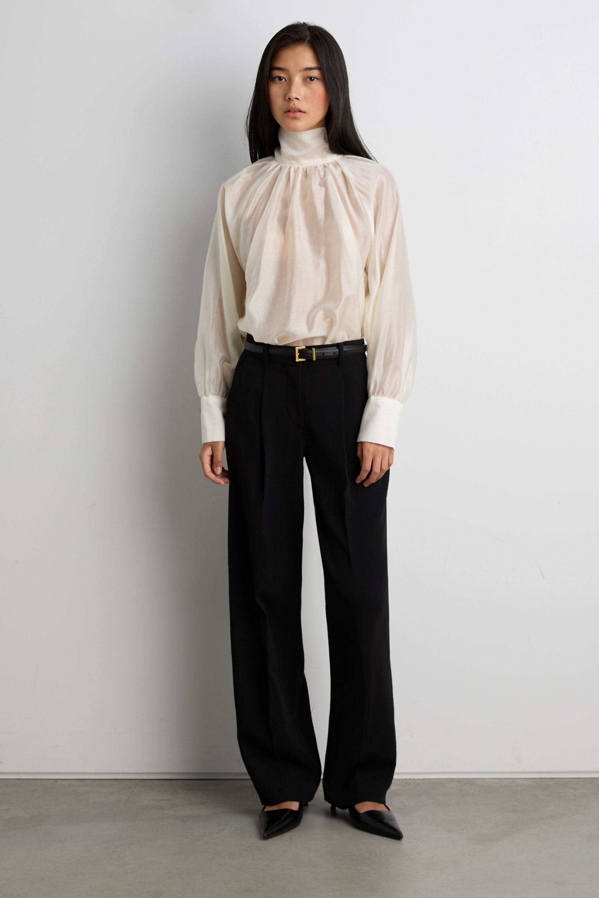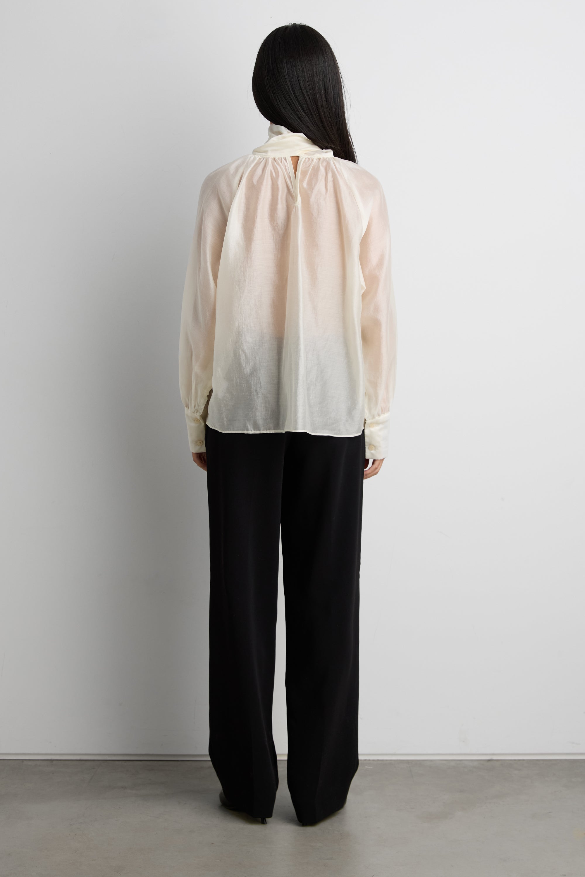 This blouse features a relaxed silhouette with a tie neck detail for a soft, feminine finish. Crafted from a glossy fabric, it drapes easily through the body and works well styled loose or partially tucked. Wear with trousers or skirts for an effortless outfit.