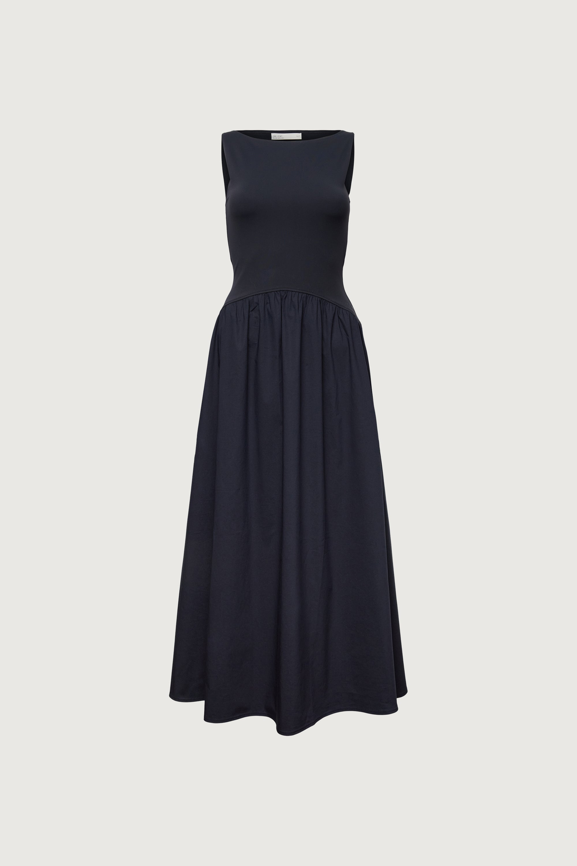 This boat neck midi dress will be your next go-to this season—both effortless and timeless. It has a sleeveless bodice that's super soft and hugs the body to accentuate the slim fit and is balanced with a curved gathered drop waist and subtle A-line skirt made from a cotton blend.