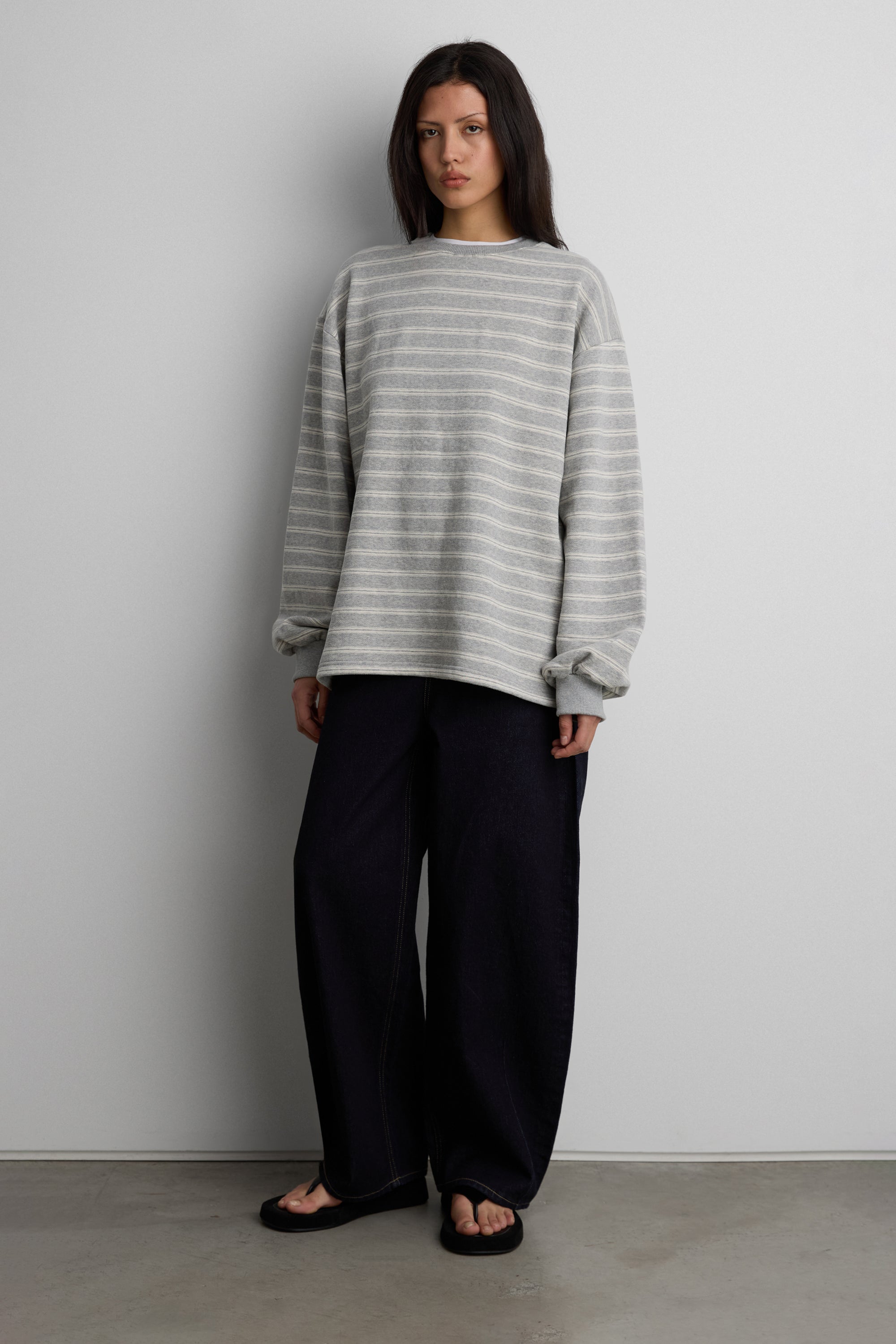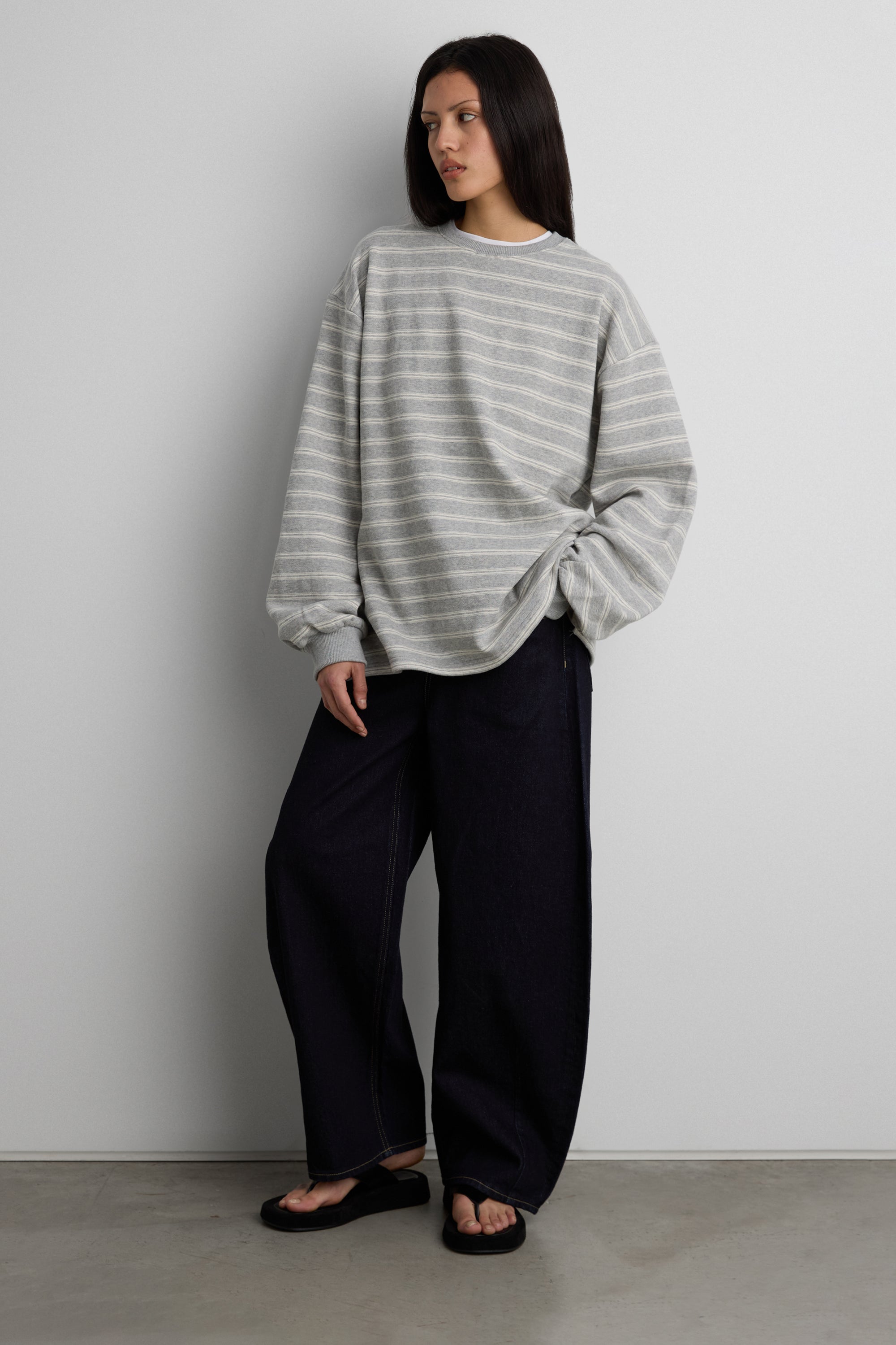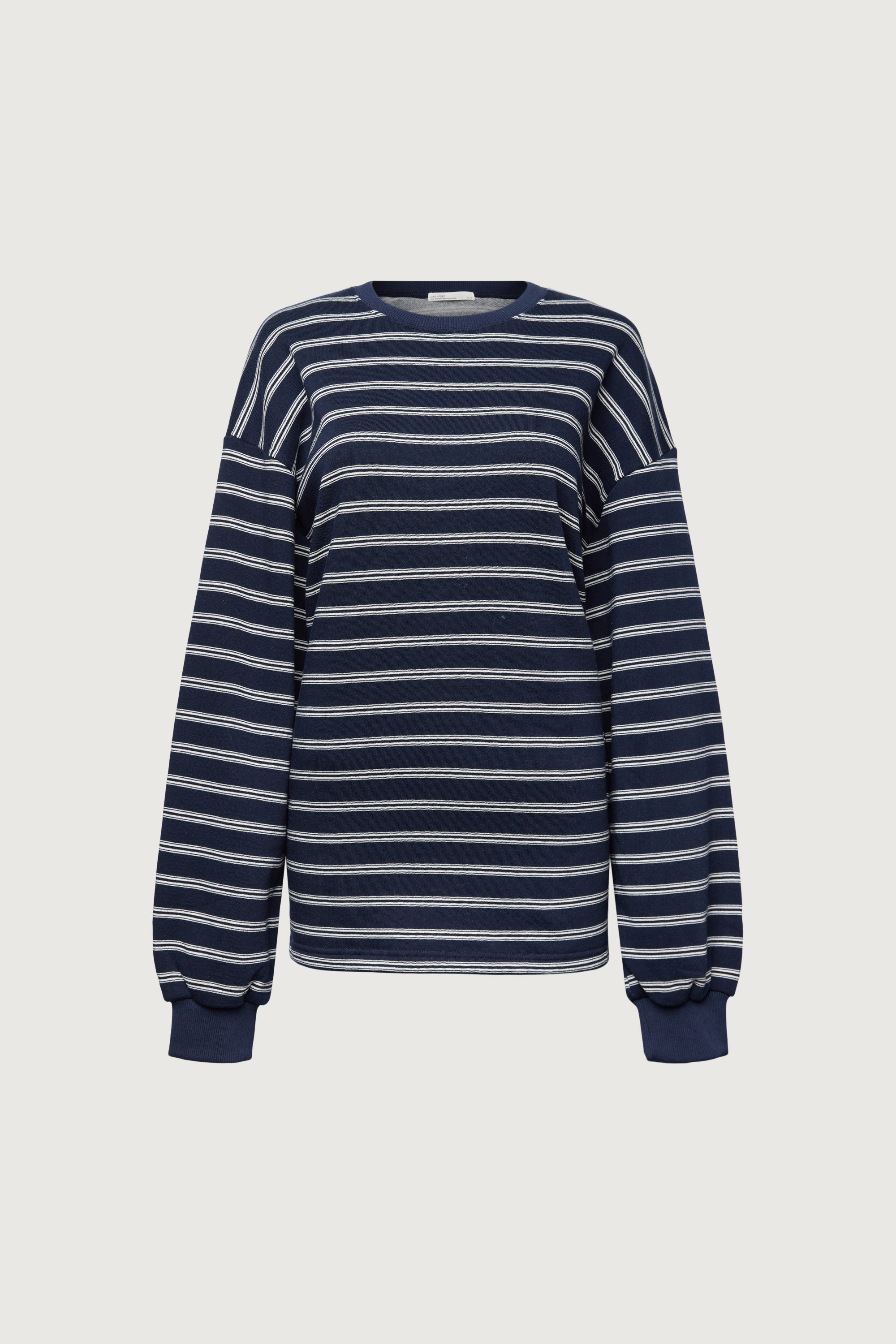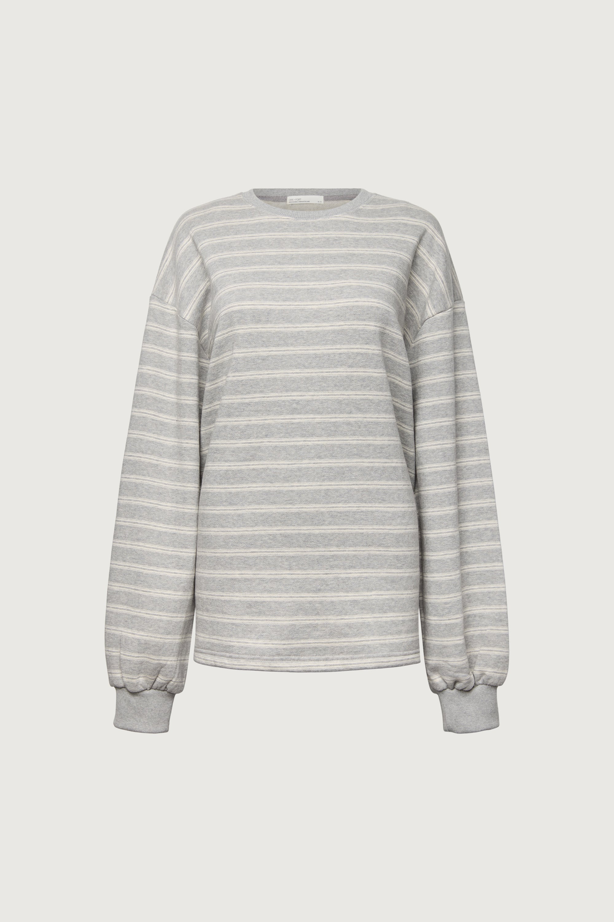 This brushed fleece pullover is designed with a oversized silhouette and classic stripe pattern for an easy, everyday look. Crafted from a soft fleece fabric with a cozy hand feel, it offers warmth without feeling heavy. Finished with a crew neckline and ribbed trims, it's a versatile layer suited for casual, off-duty styling.