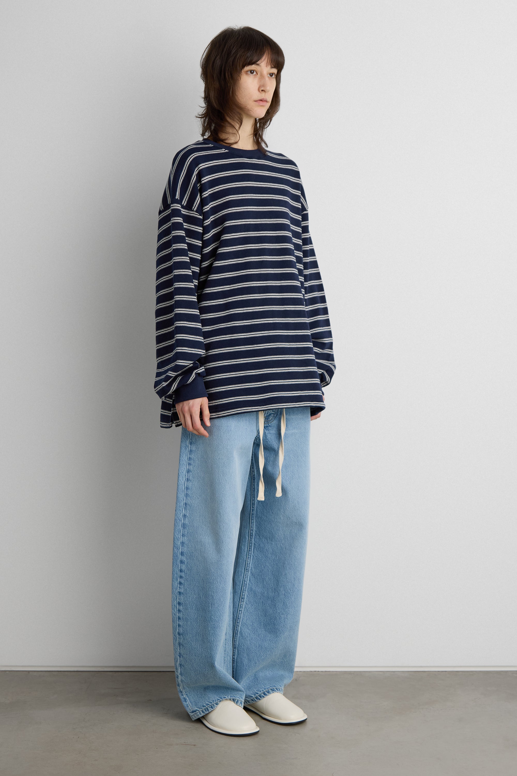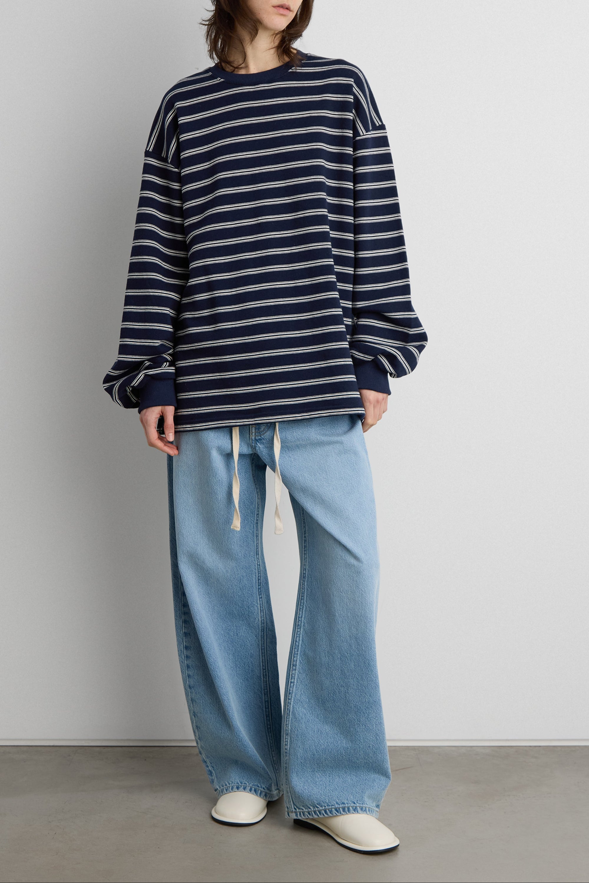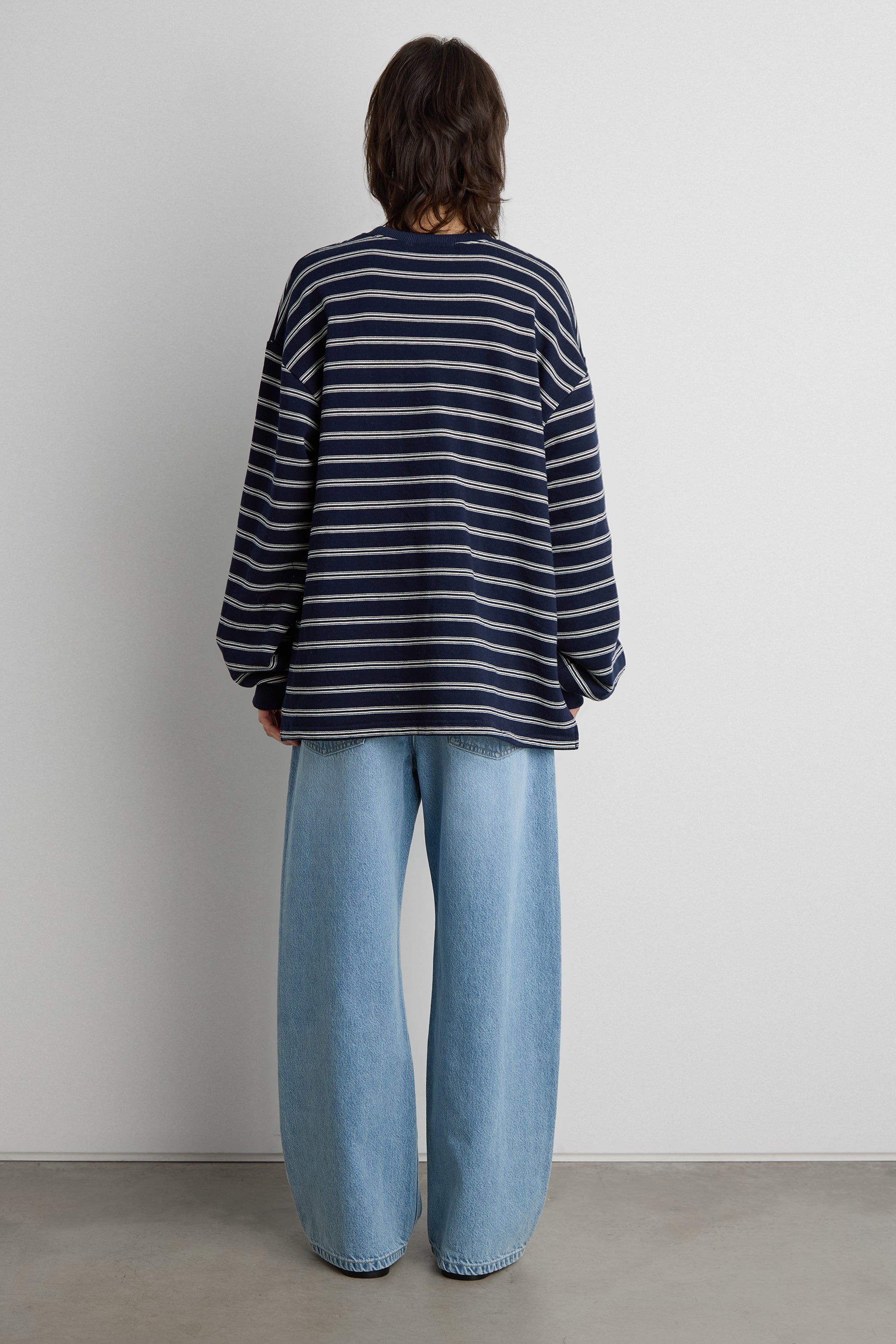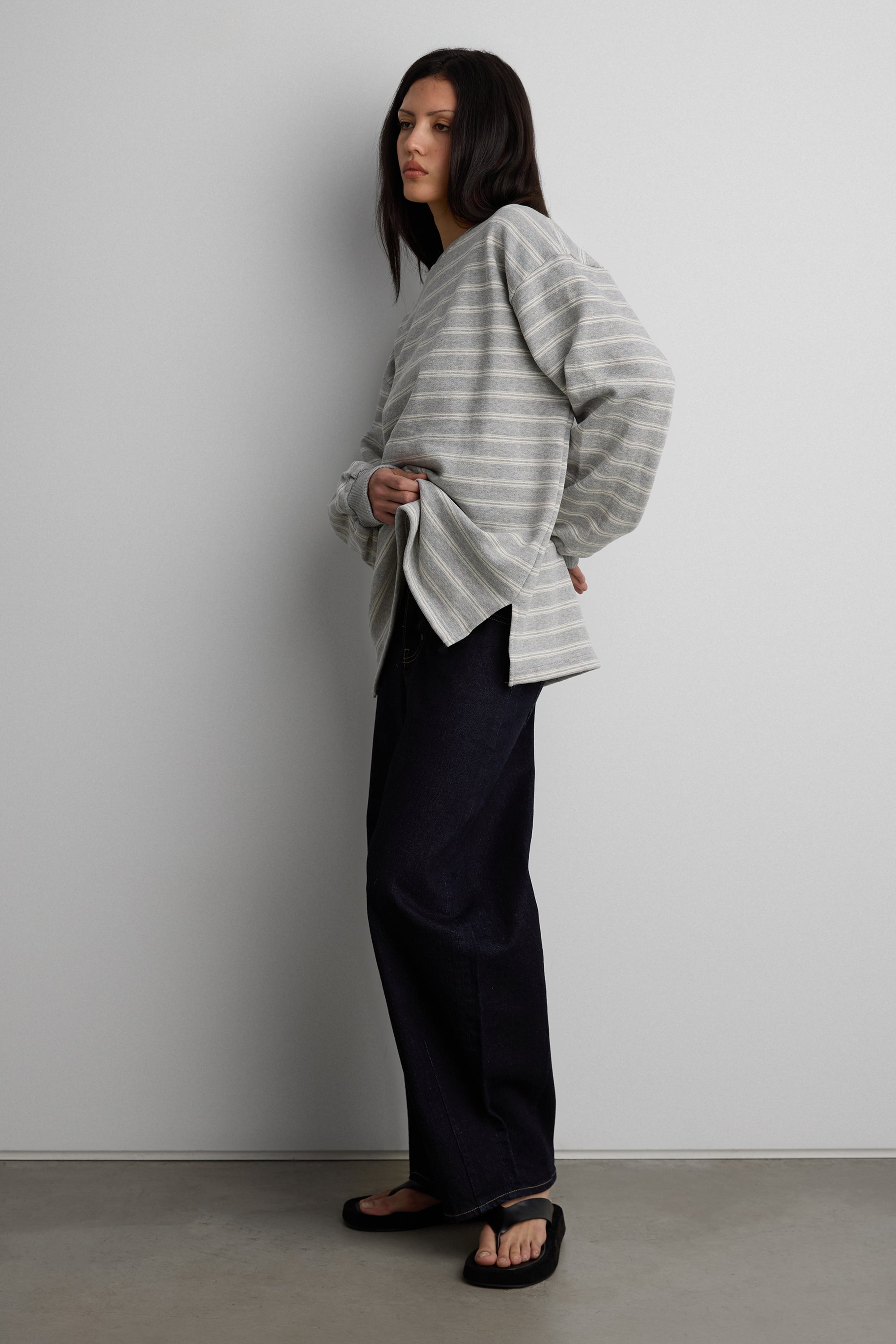 This brushed fleece pullover is designed with a oversized silhouette and classic stripe pattern for an easy, everyday look. Crafted from a soft fleece fabric with a cozy hand feel, it offers warmth without feeling heavy. Finished with a crew neckline and ribbed trims, it's a versatile layer suited for casual, off-duty styling.