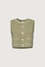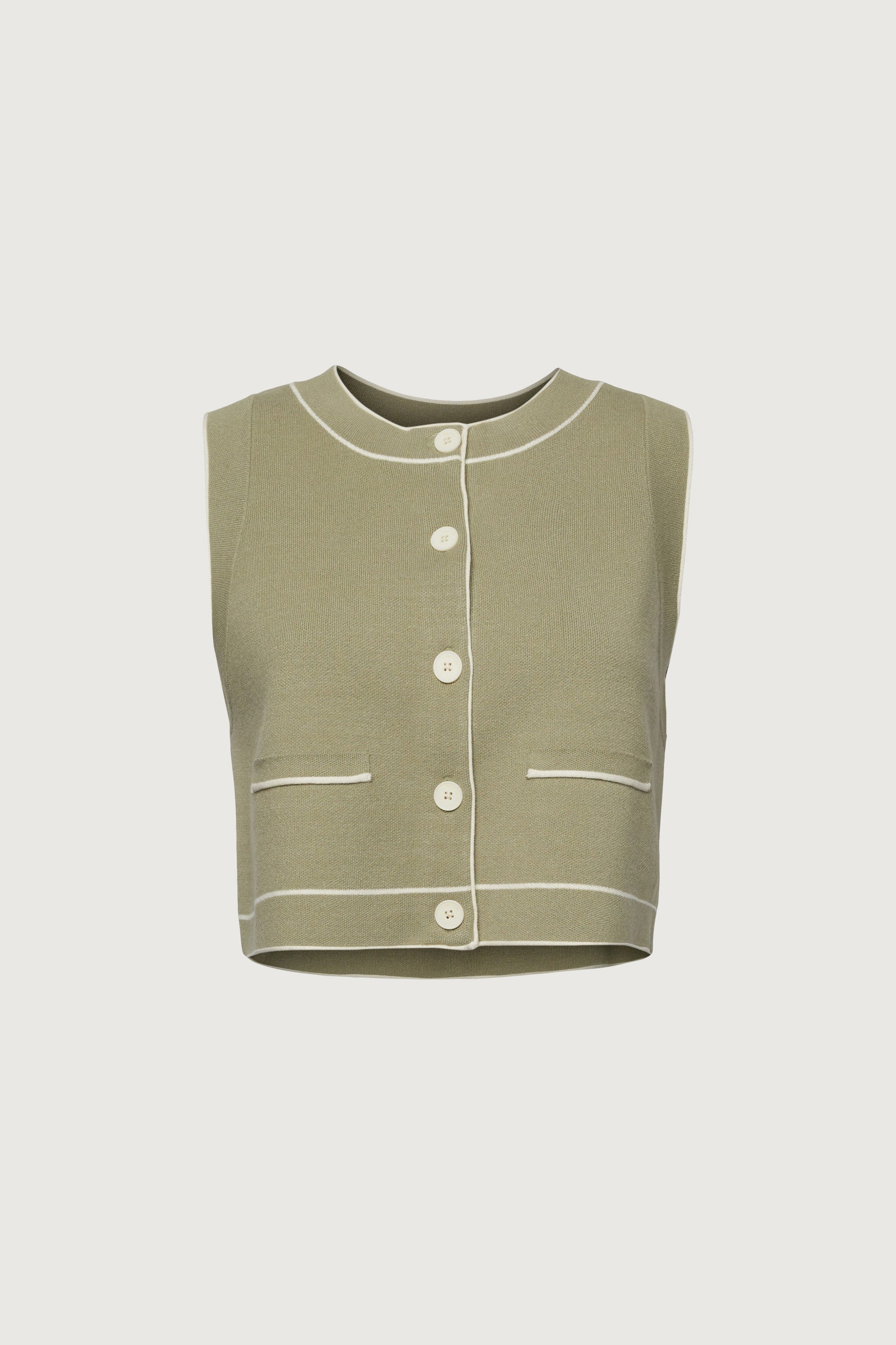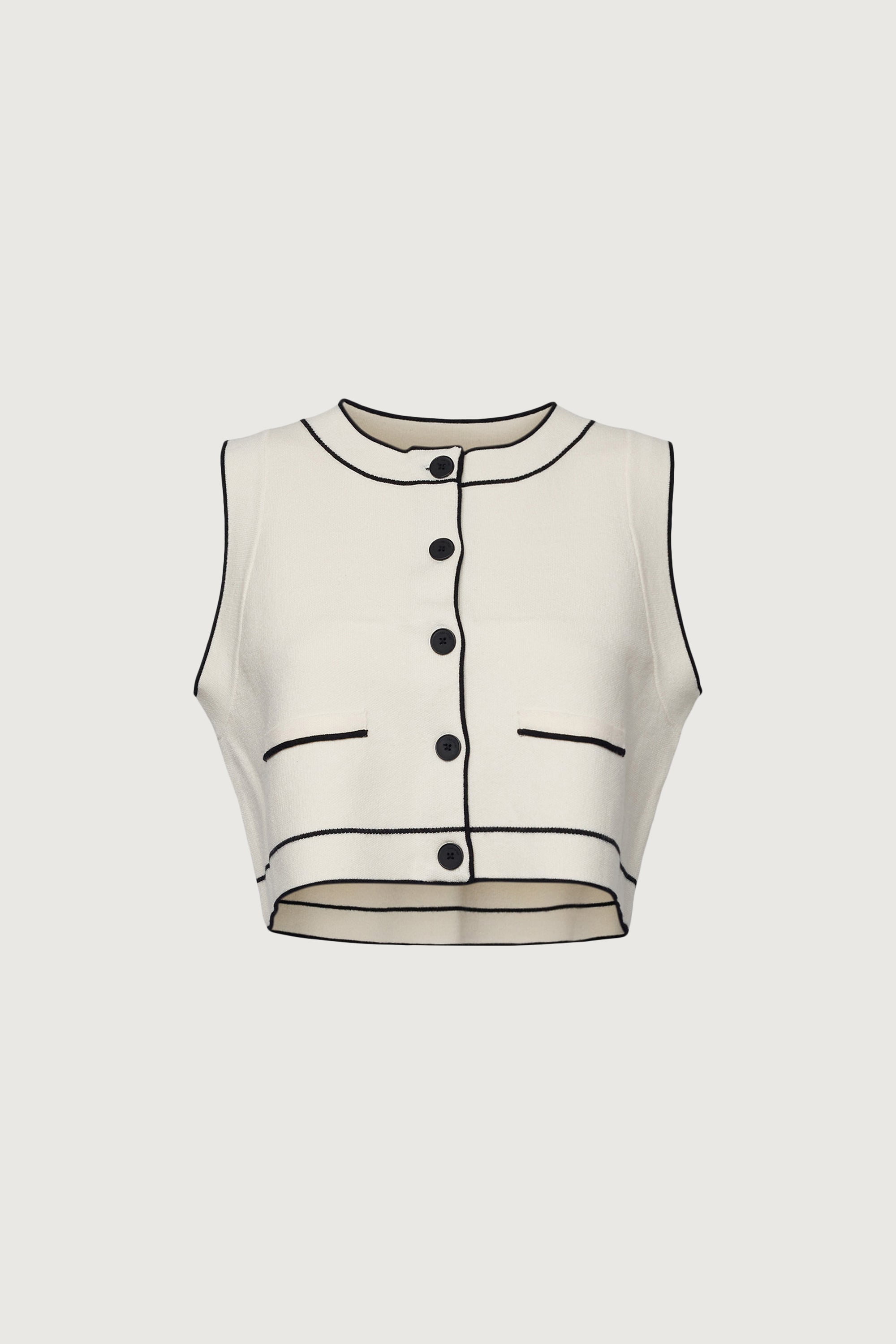 This button up sweater vest is inspired by Parisian styles and is designed with contrast buttons and piping along the trims. It's made in a cropped length to wear with high-rise bottoms from mini skirts to trousers.