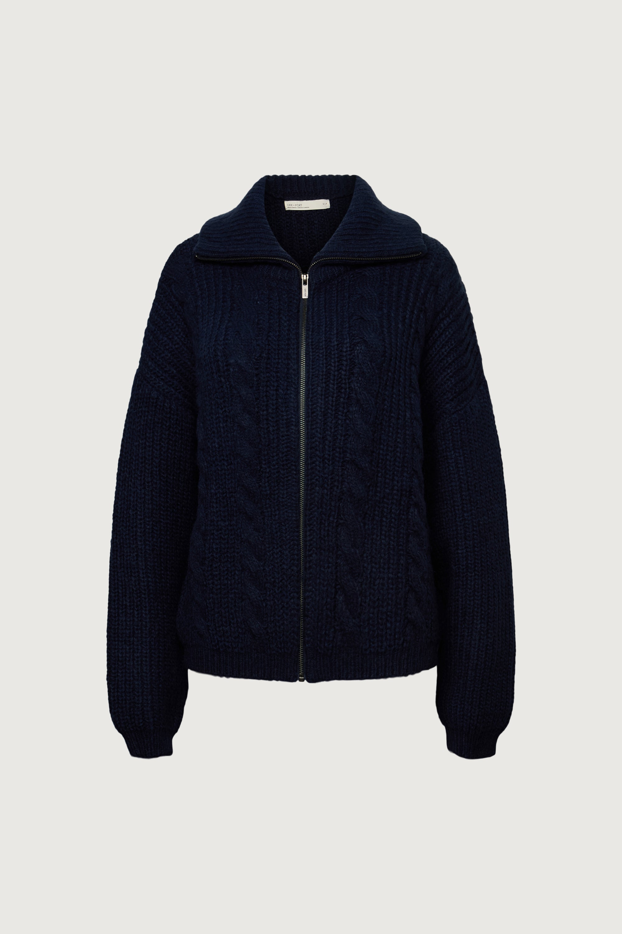 Cable knit. Collared neckline. Zip-up design. Dropped shoulders.