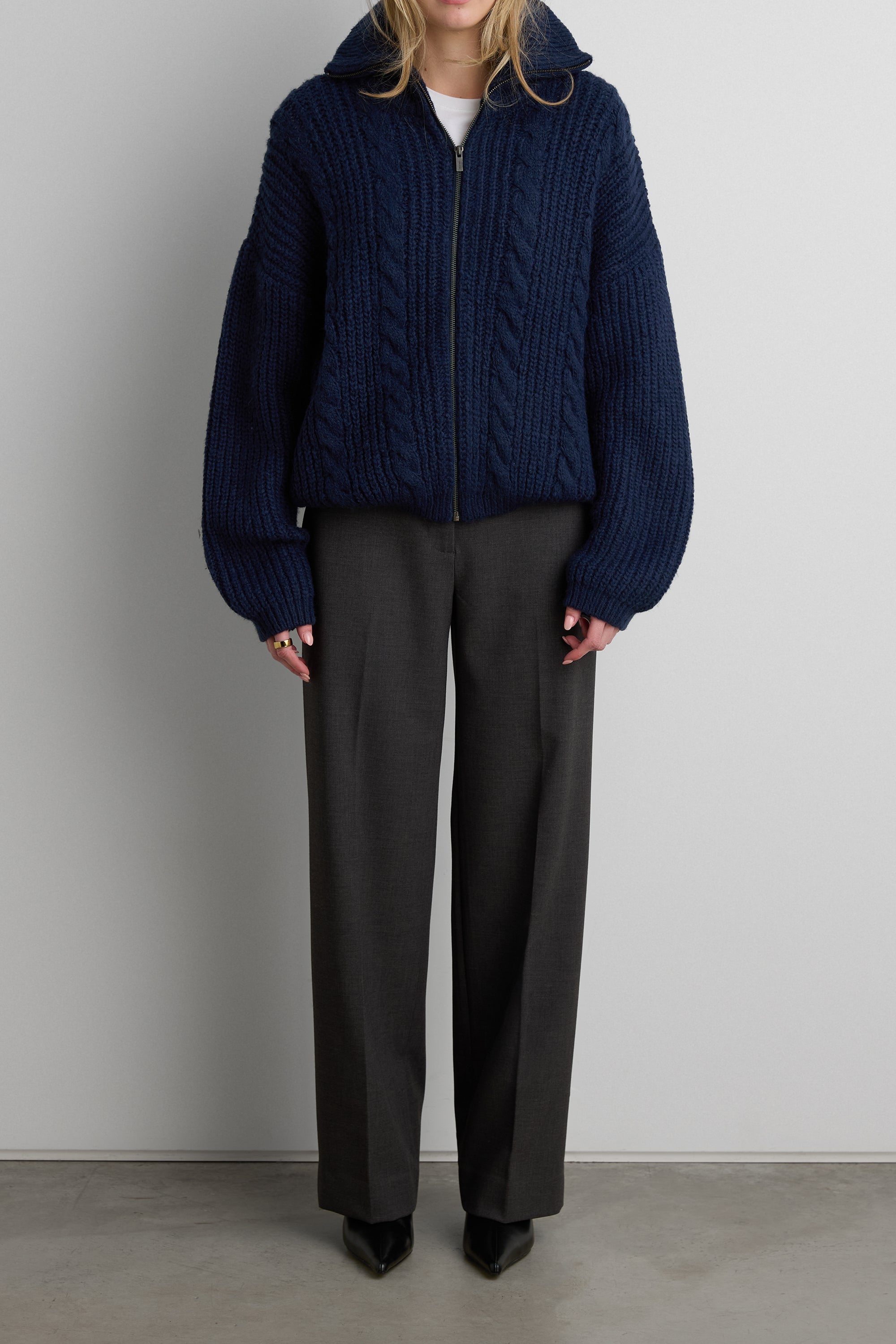 This collared zip-up cardigan features a cable knit design, dropped shoulders and slouchy sleeves. A cozy go-to knitwear piece you can wear with knit pants for lounging or pair it with a bodysuit and high-rise trousers for the office.