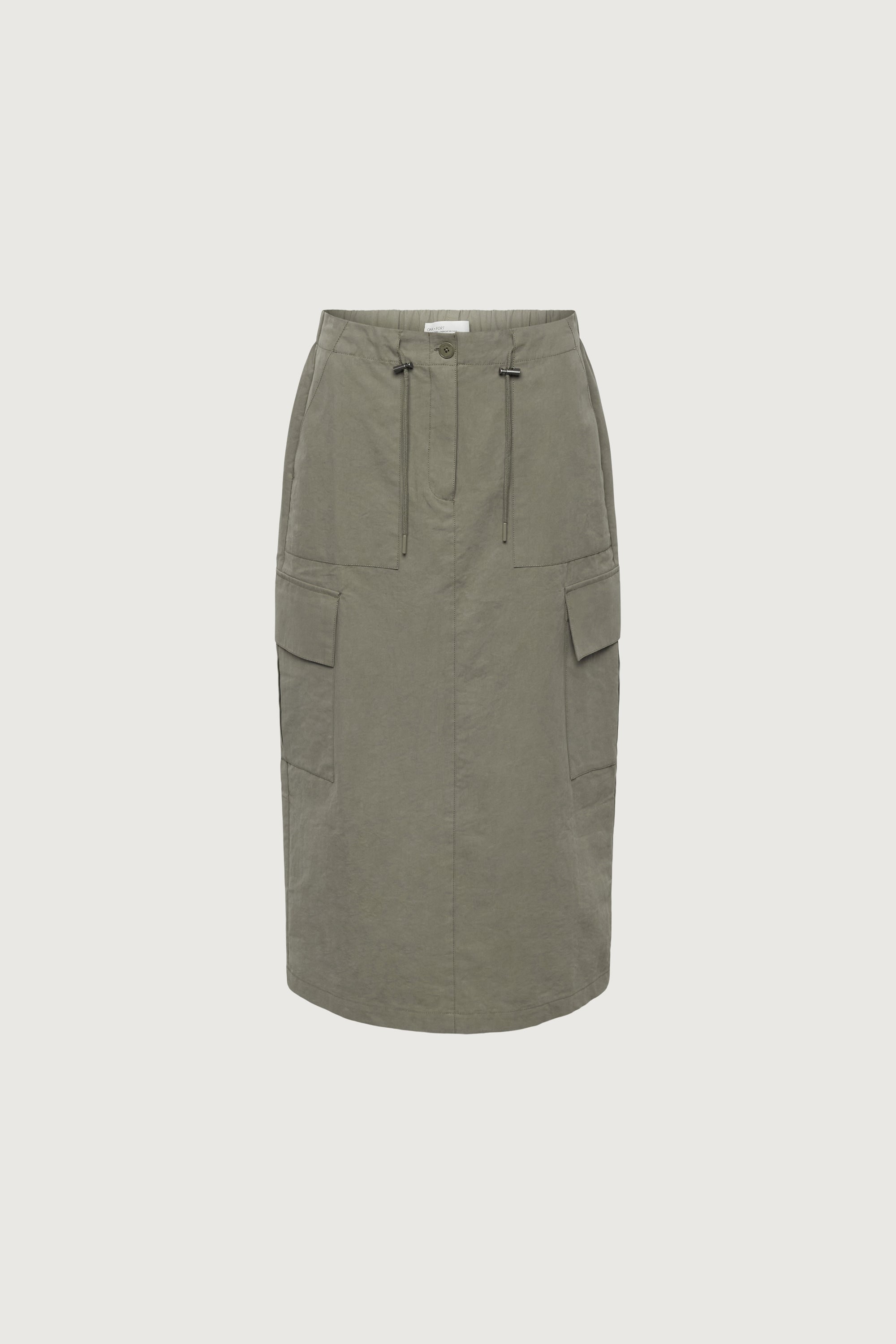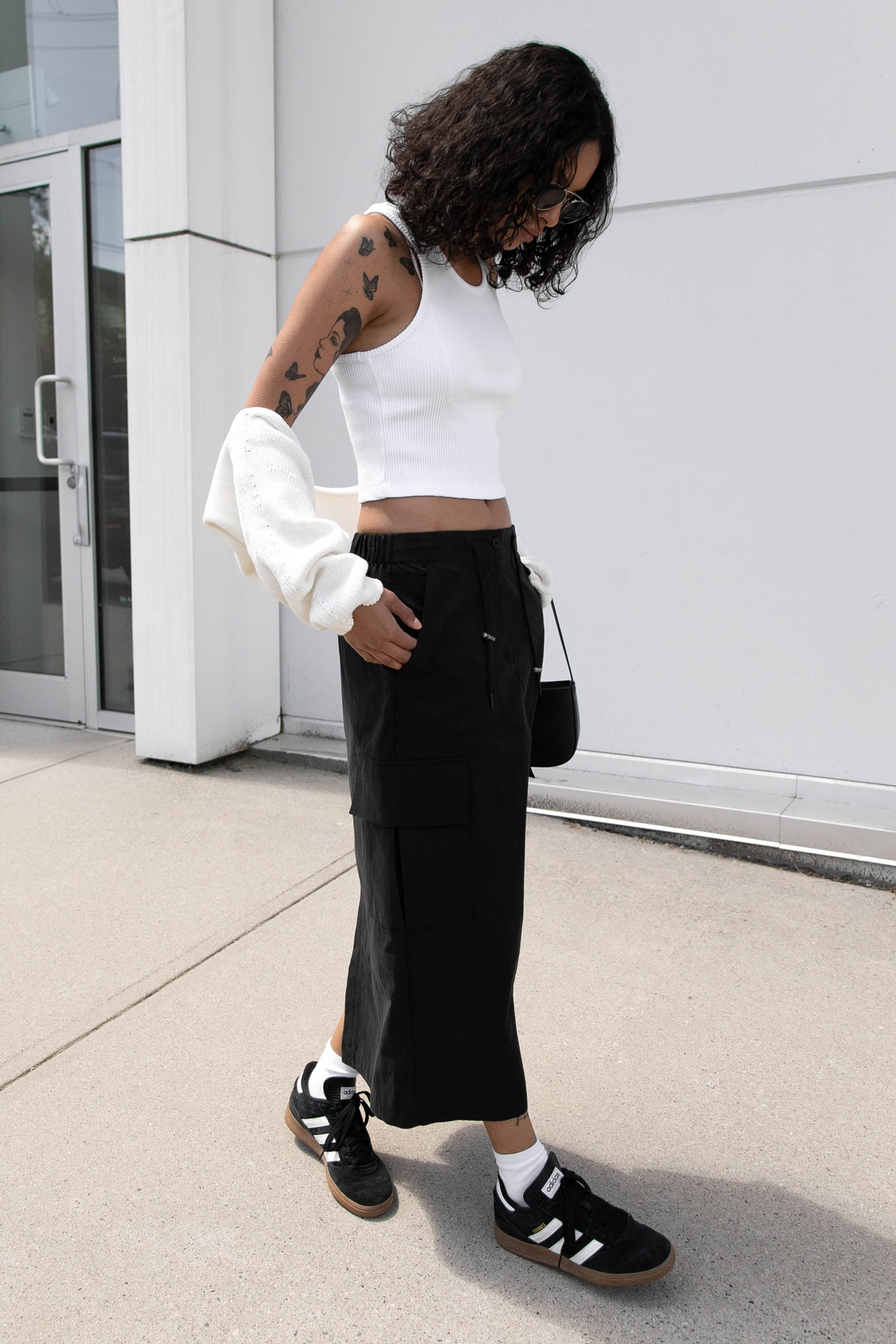 This cotton nylon midi cargo skirt is made in a relaxed fit. It's detailed with an elasticated drawstring waist, cargo pockets and a back slit. Pair yours with a tank top and sneakers.