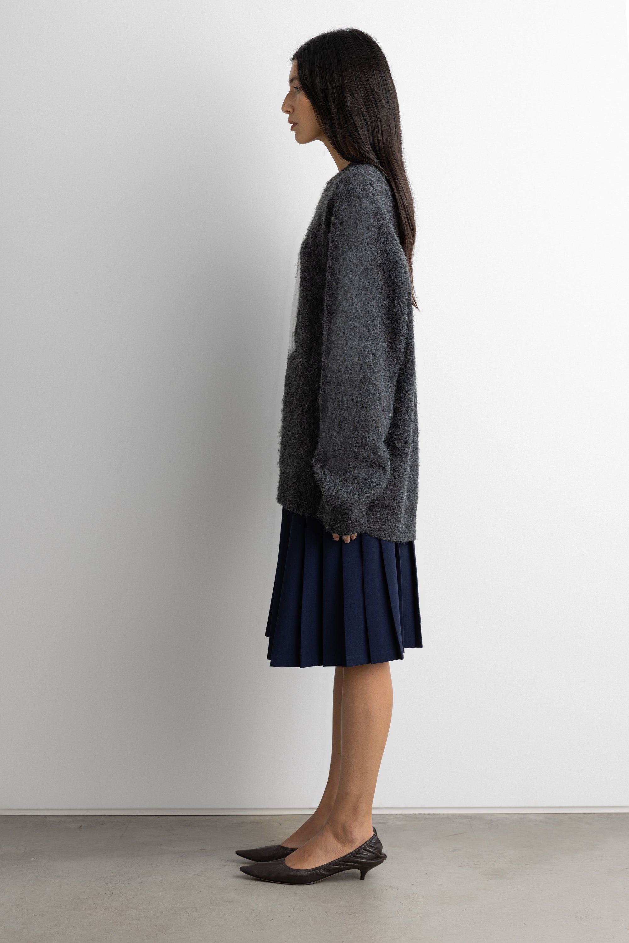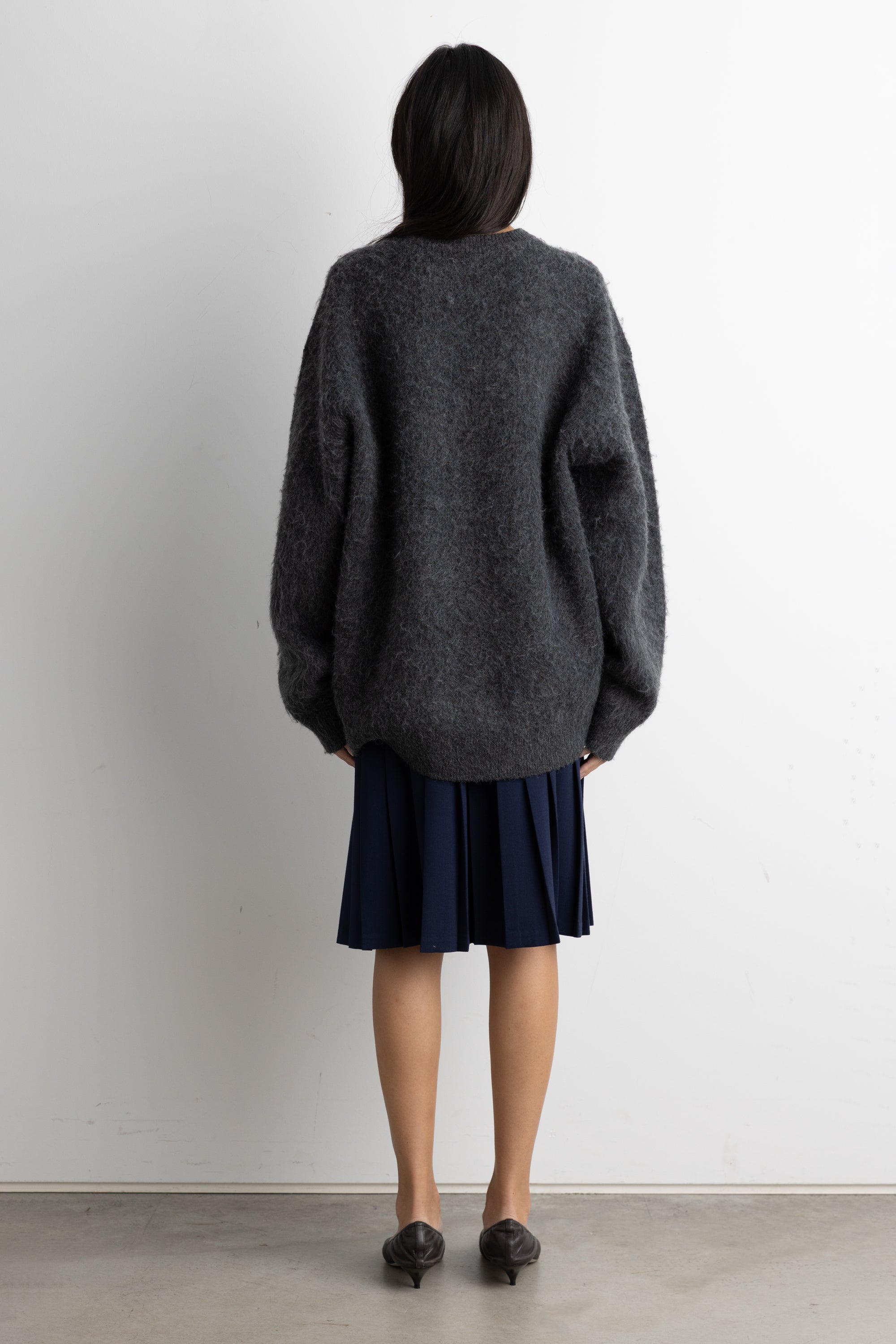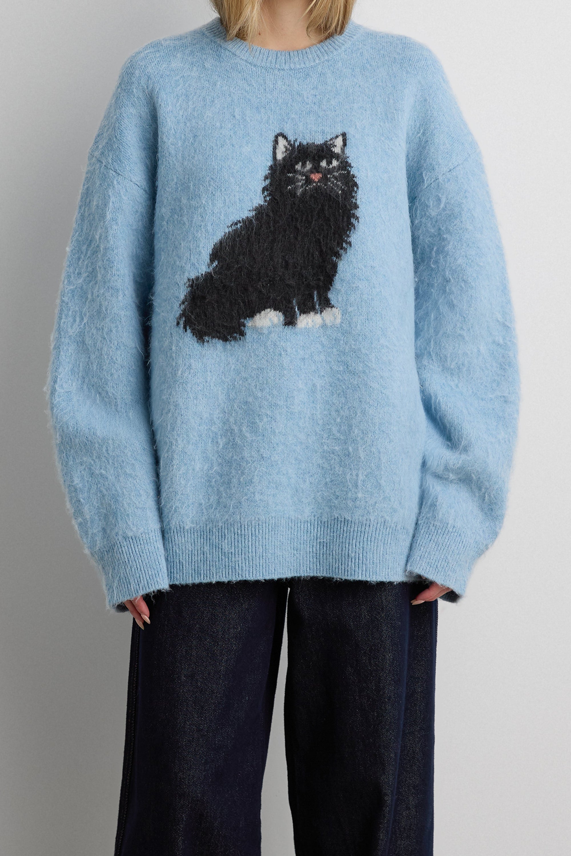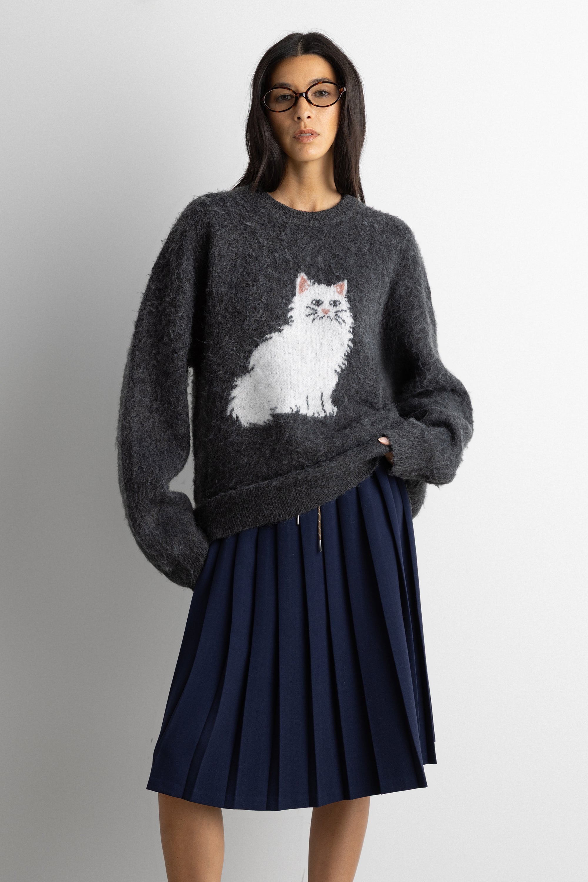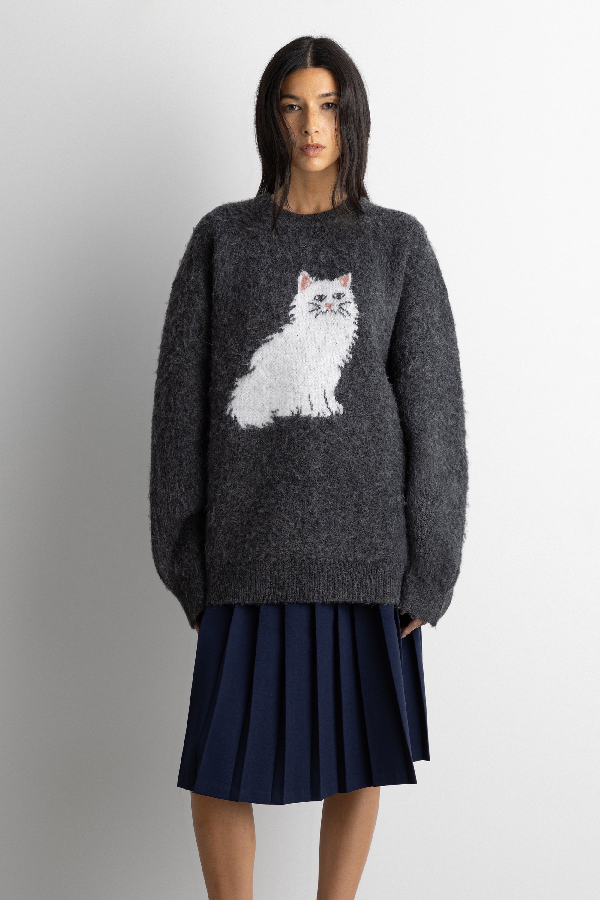 Relaxed fit. Crew neckline. Cat knit design. 28" length based on size M.