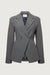 Suiting fabric. Padded shoulders. Double-breasted front. Lined. Cinched waist silhouette. Faux welt pocket.