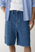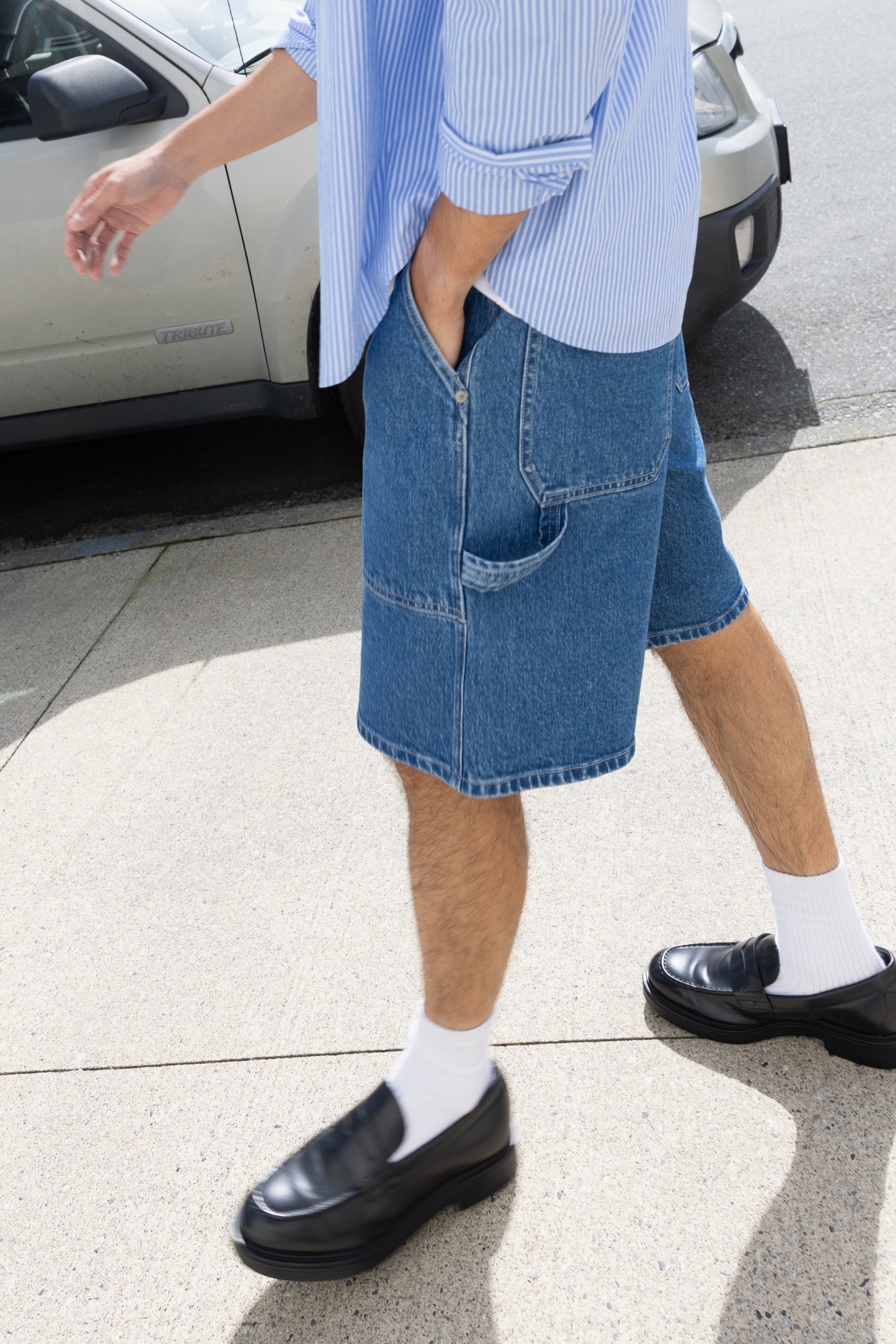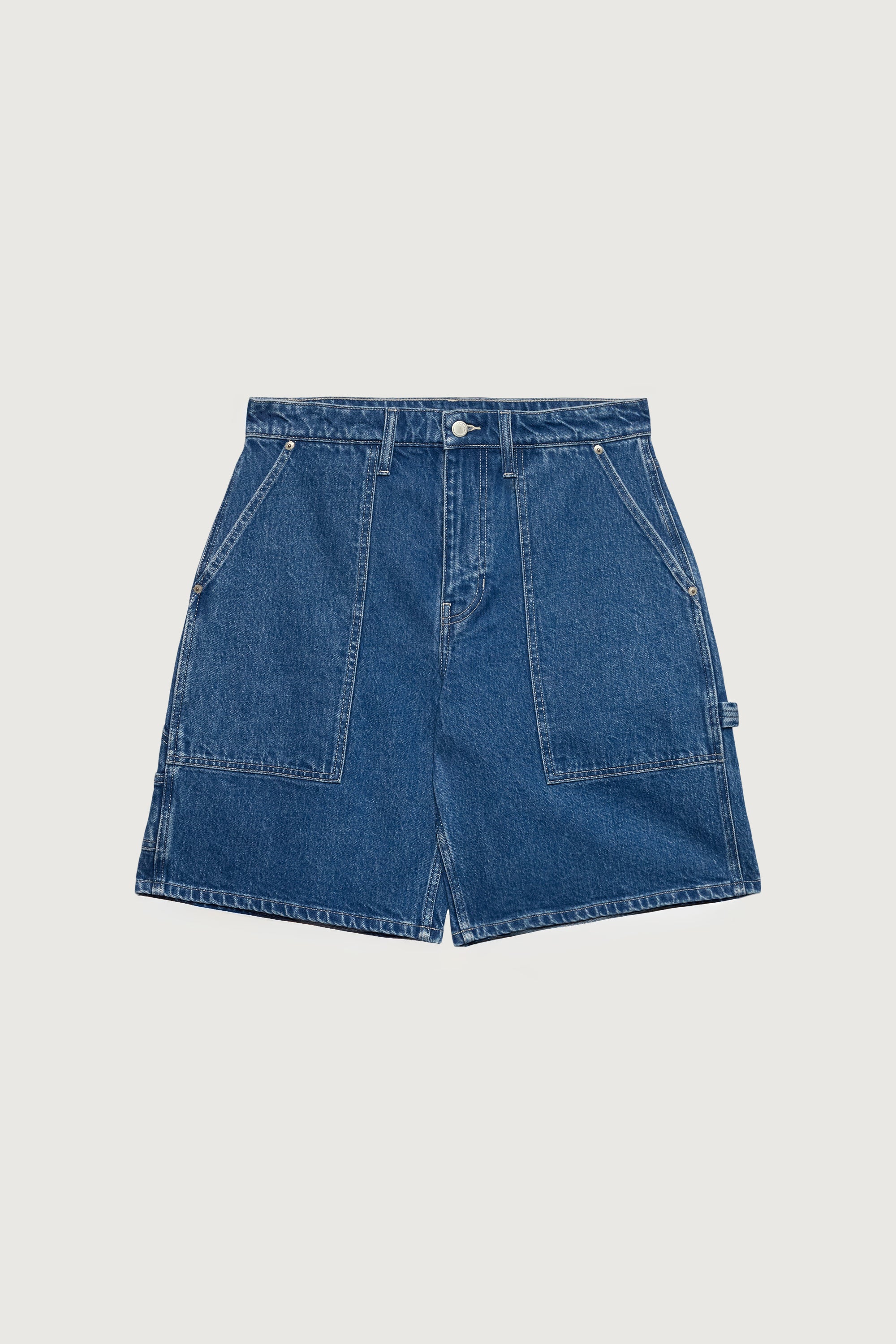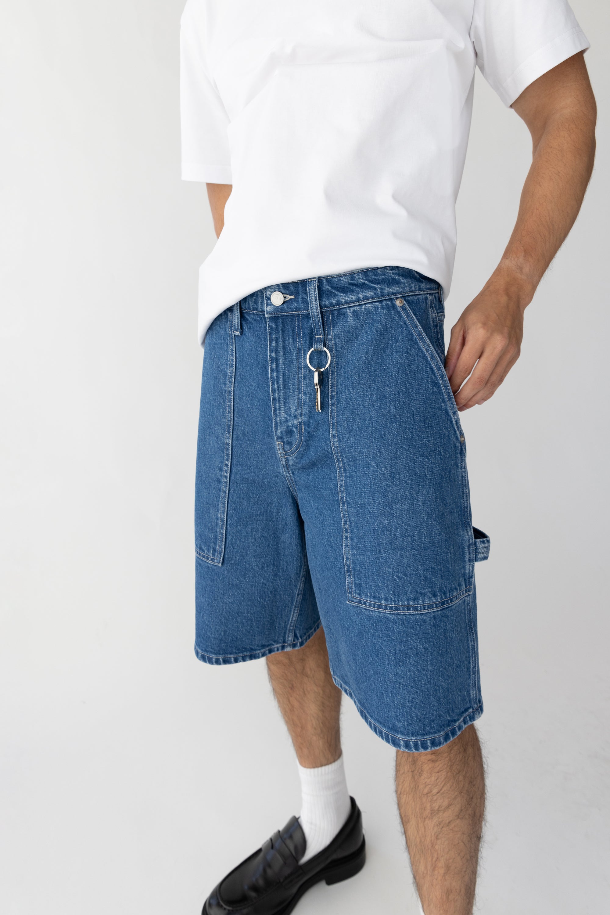 Classic fit. Denim. Carpenter style detailing. Mild stretch. 10" inseam.