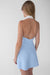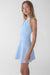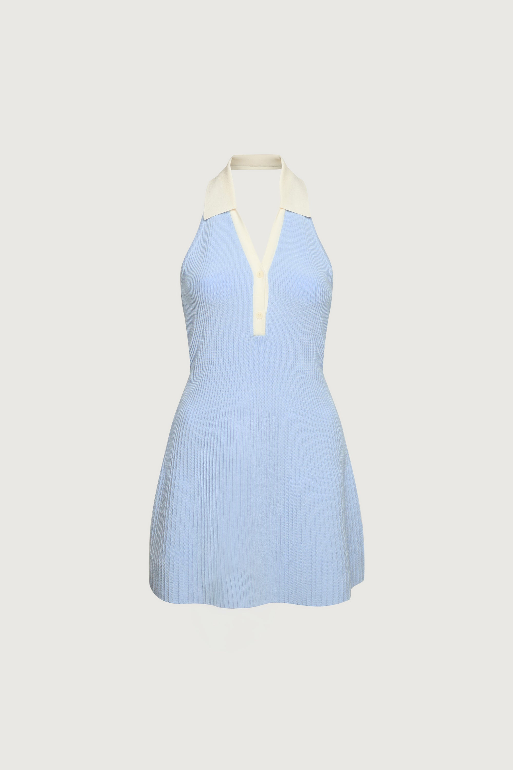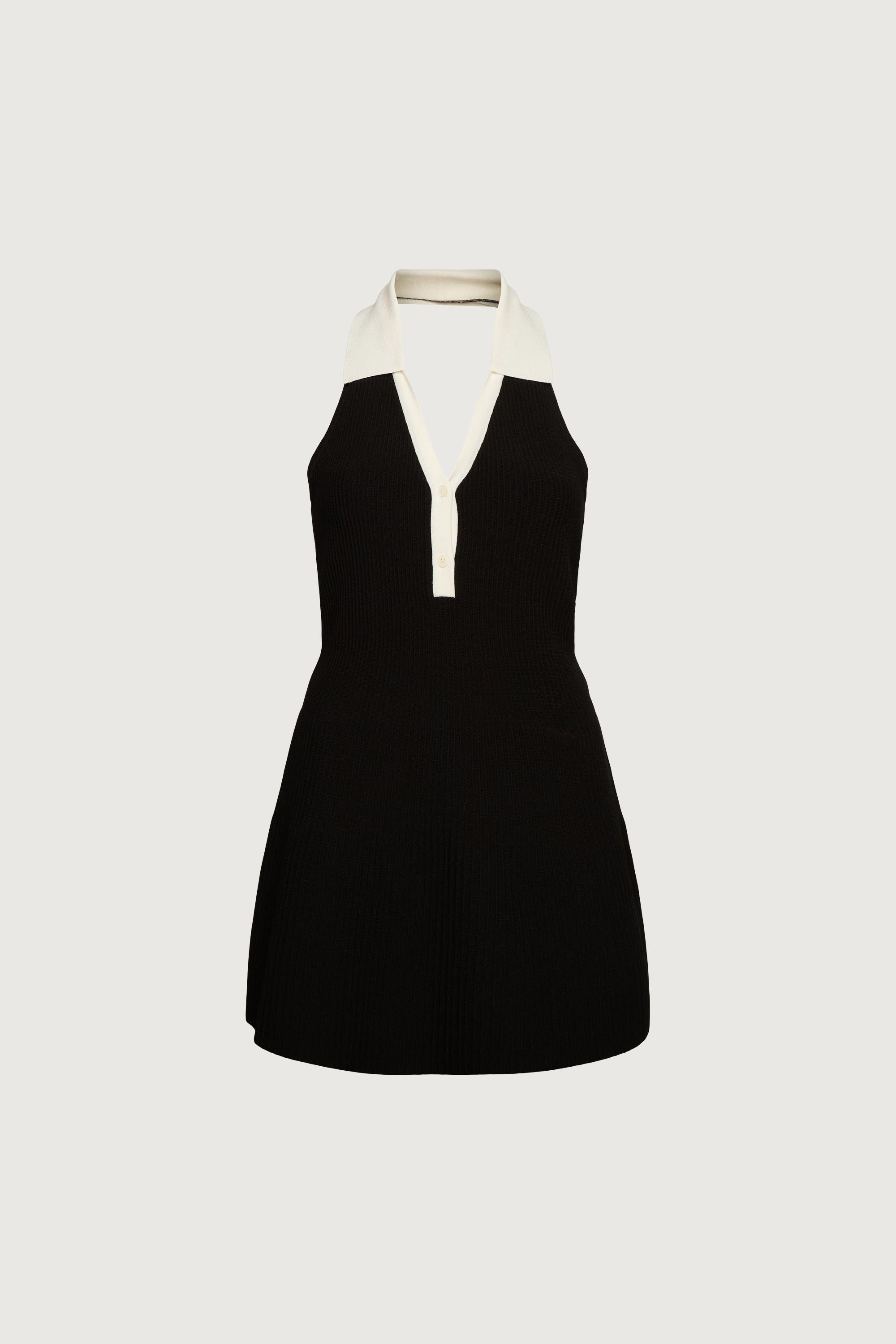 This halter neck mini dress is cut from a ribbed knit fabric in a slim fit. It has a fit and flare design and is detailed with a contrast collar and buttoned V-neckline. Highlight the open back and wear your hair up in a messy bun.