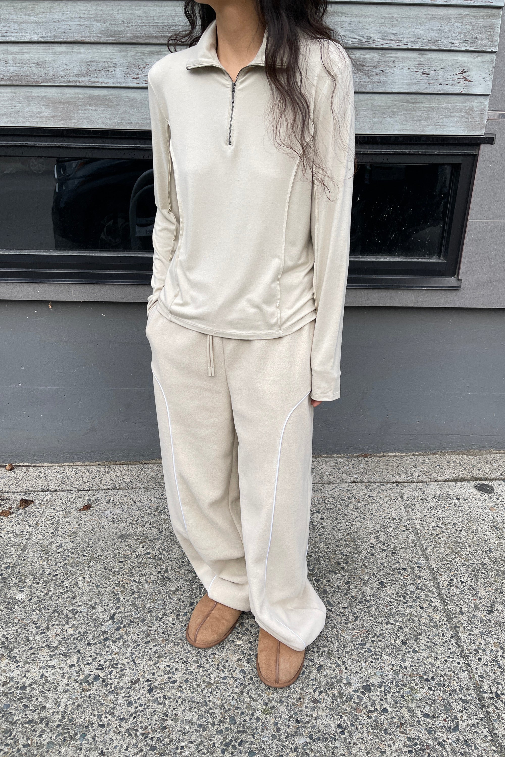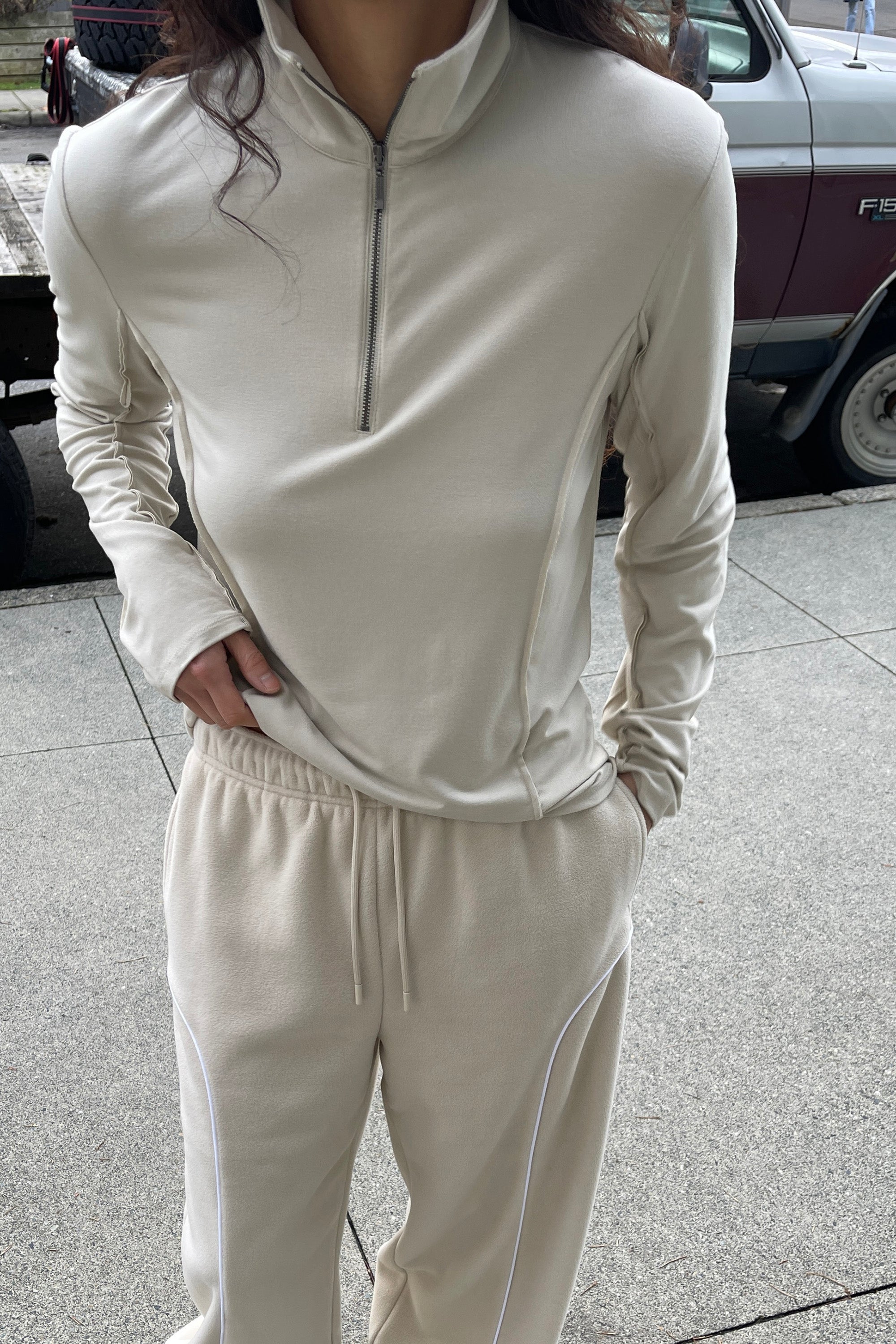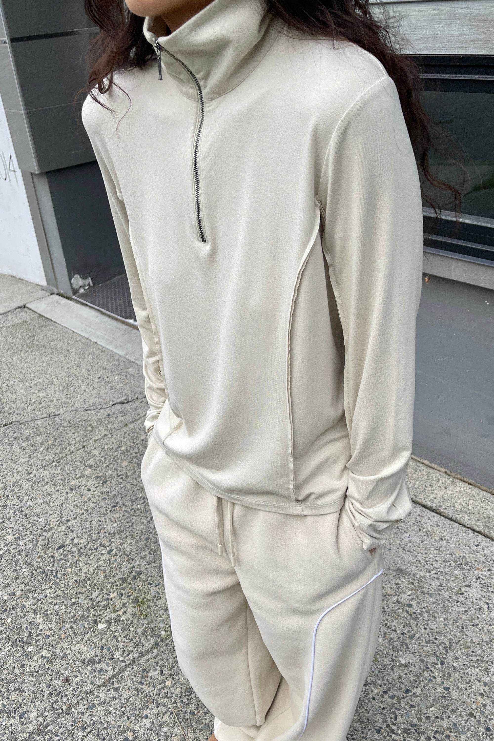 Classic fit. Quarter zip front. Front seam details. 22.5" length based on size S.