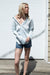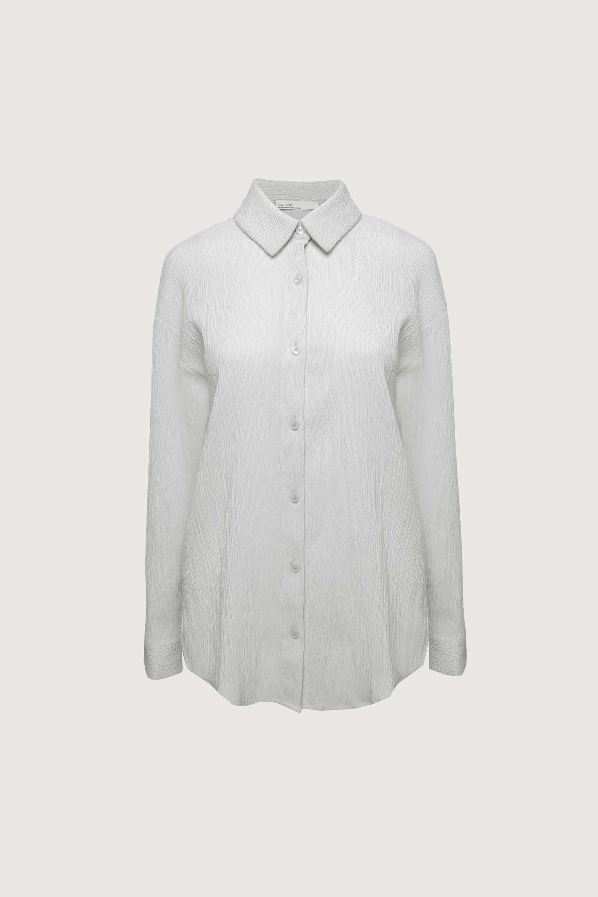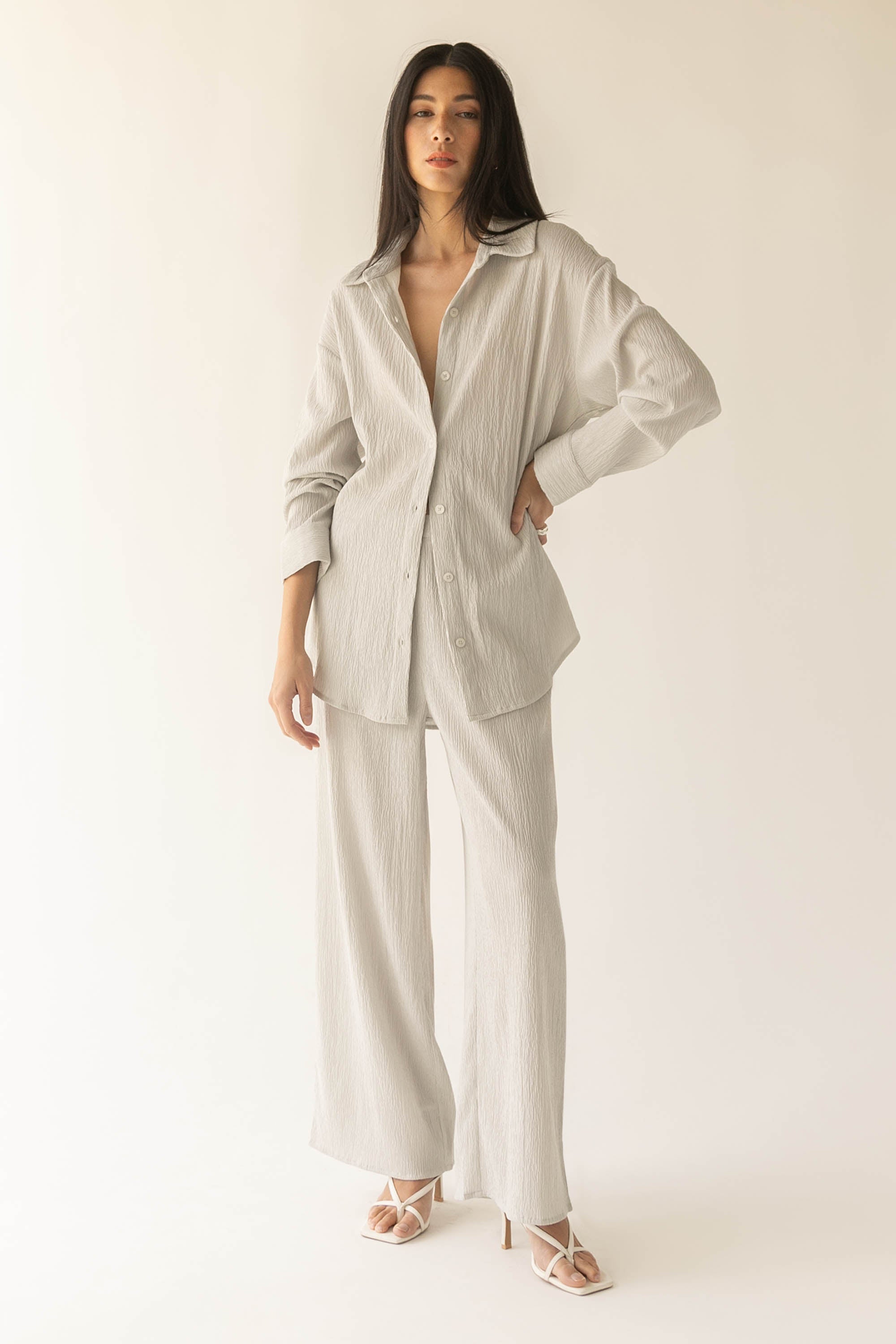 This crinkle button up top is made in a relaxed silhouette and is detailed with a collared neckline and curved hem. Both contemporary and versatile to wear unbuttoned over mini slip dresses or wear it fully buttoned as a set with matching Crinkle Pant (PT-8202-W).