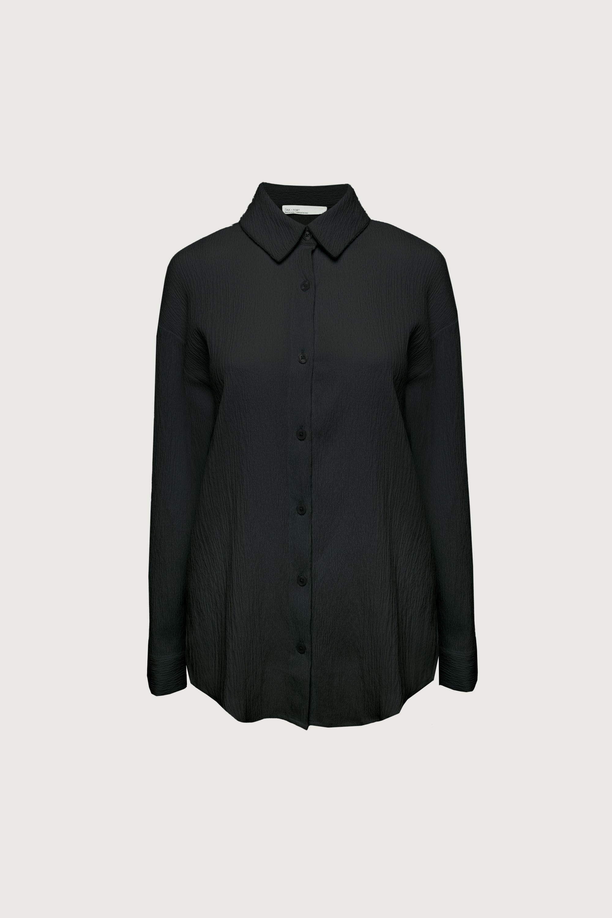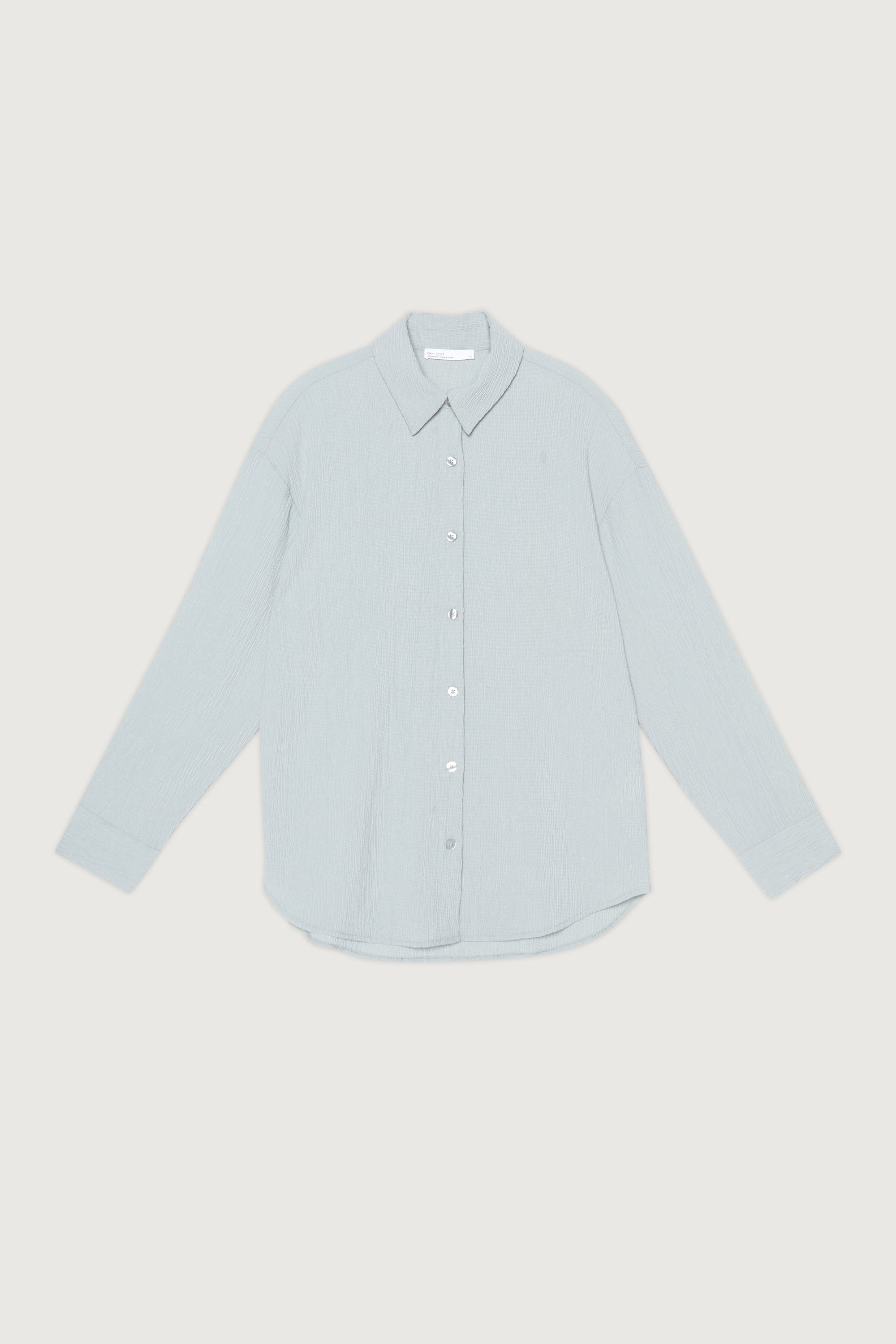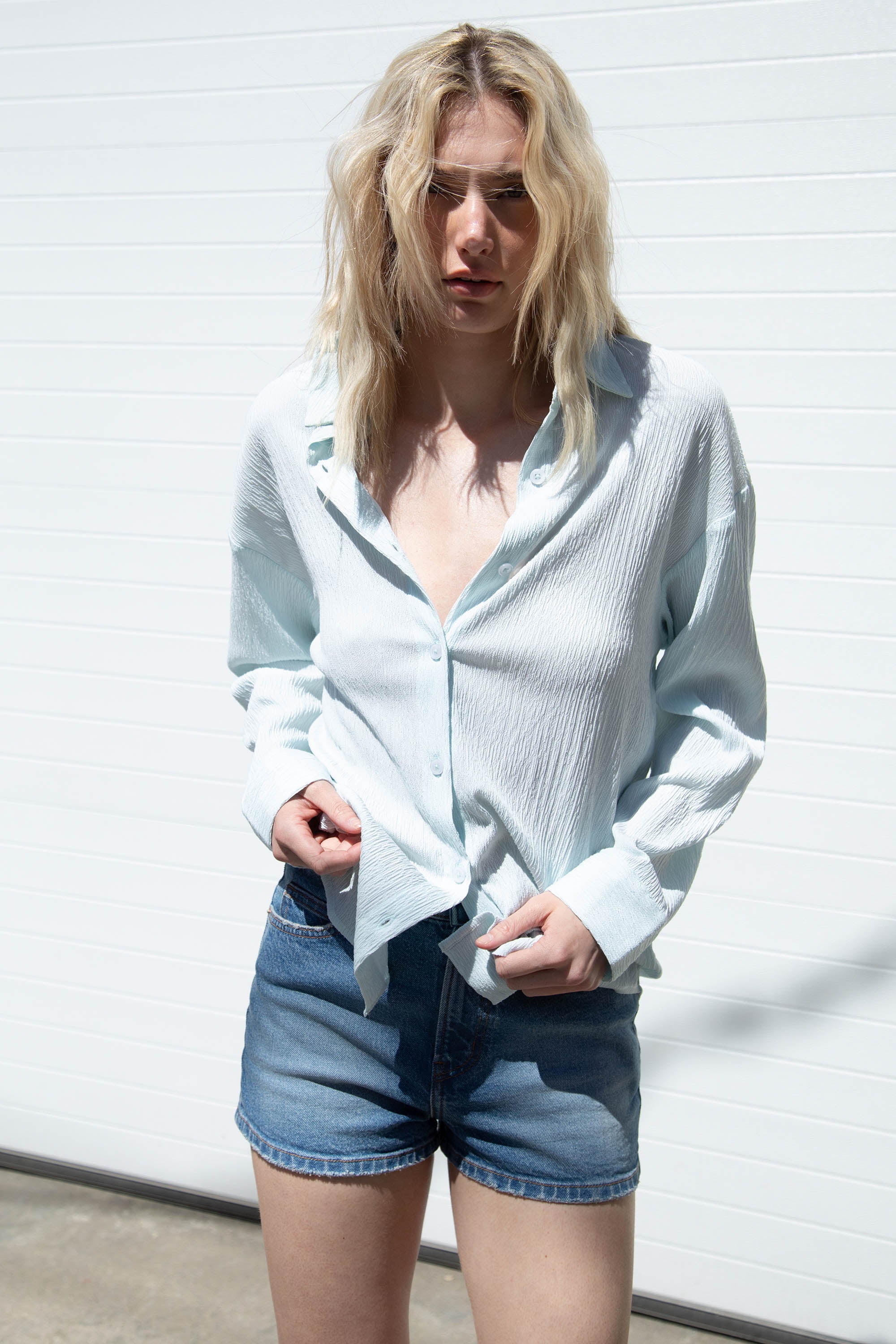 - Relaxed fit. Crinkled fabric. Collared neckline. Button front.