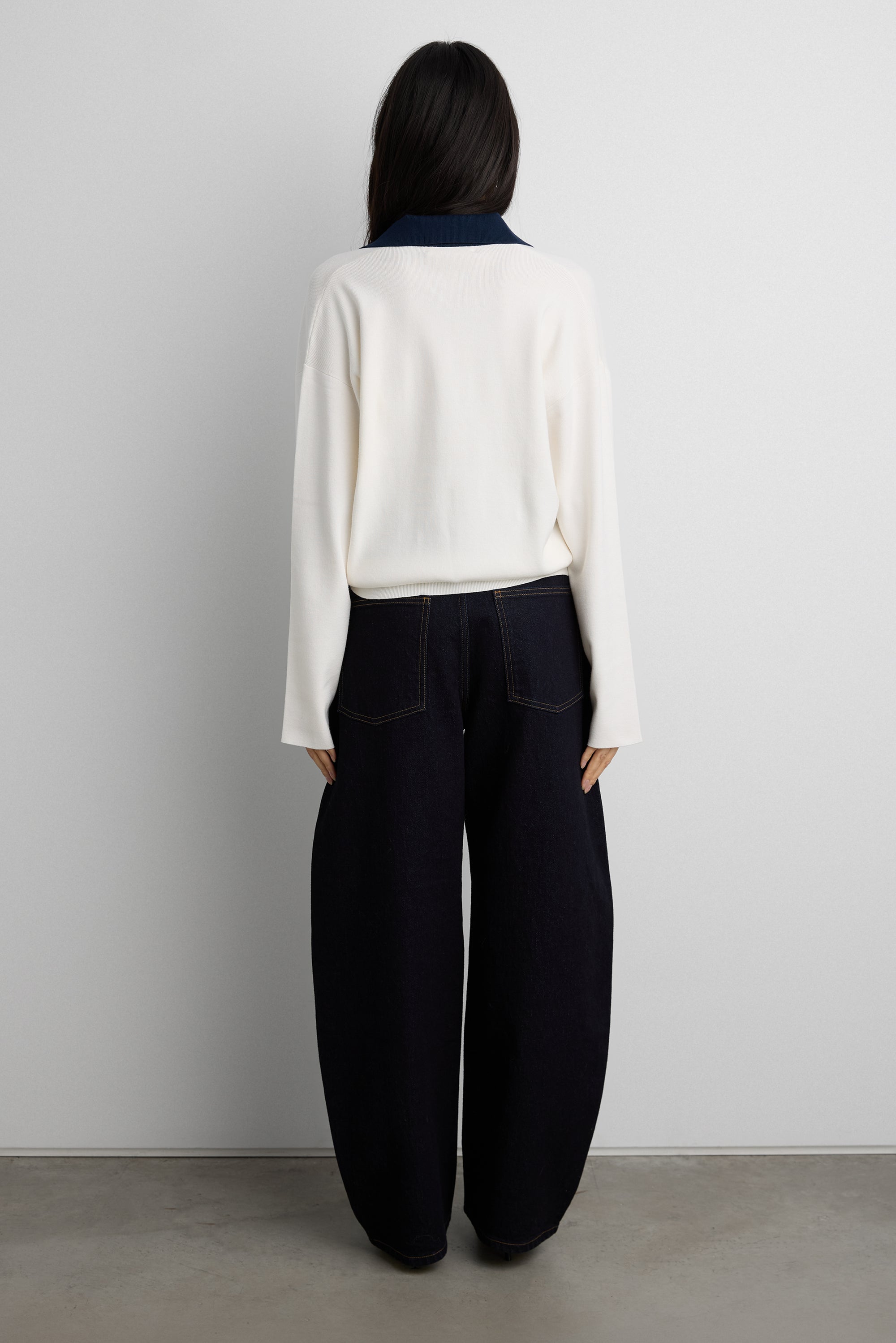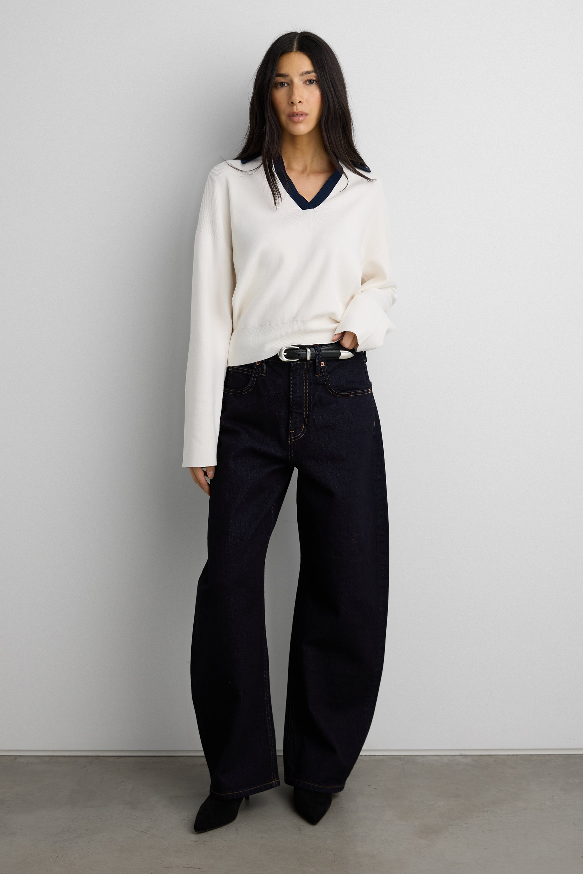 This V-neck sweater is made in a relaxed fit and is detailed with a contrast collared, V-neckline. A versatile knit you can wear from day to night, wear yours with straight leg trousers and boots.