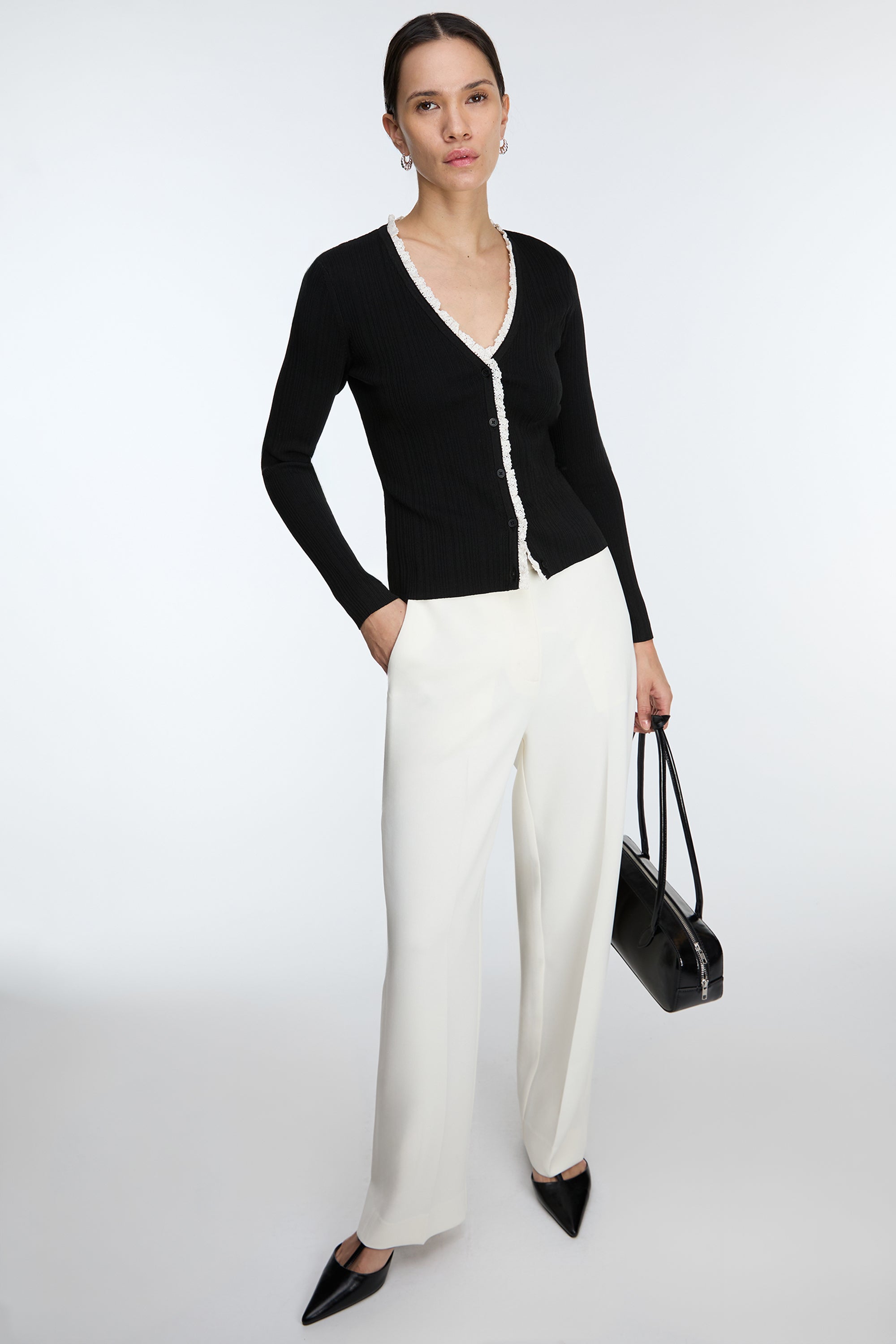This rib-knit cardigan is made in a slim fit and is detailed with scalloped lace trims along the button front and V-neckline. An updated take to your classic button up cardigan, wear yours under a double-breasted coat and high-rise trousers.