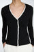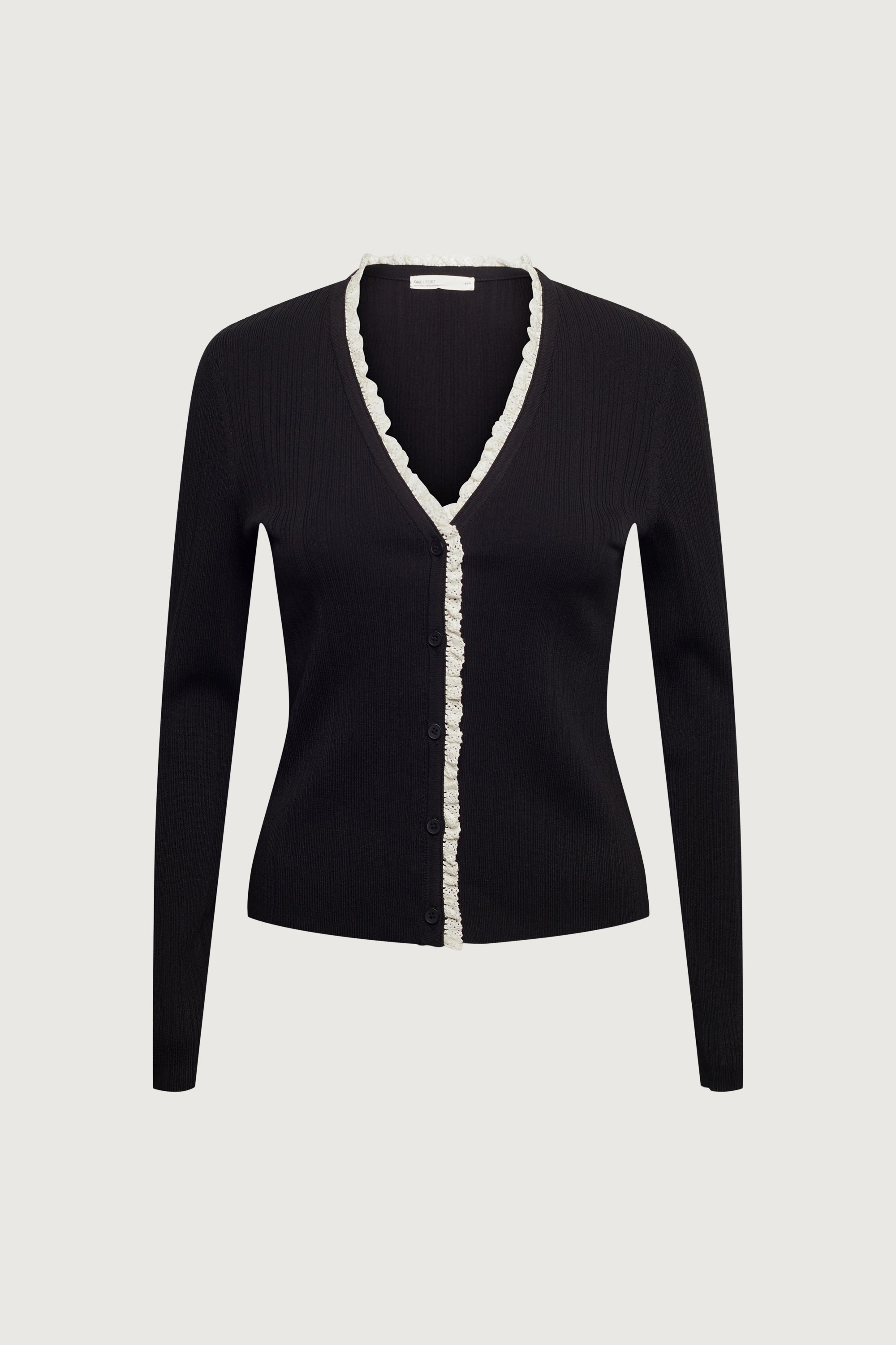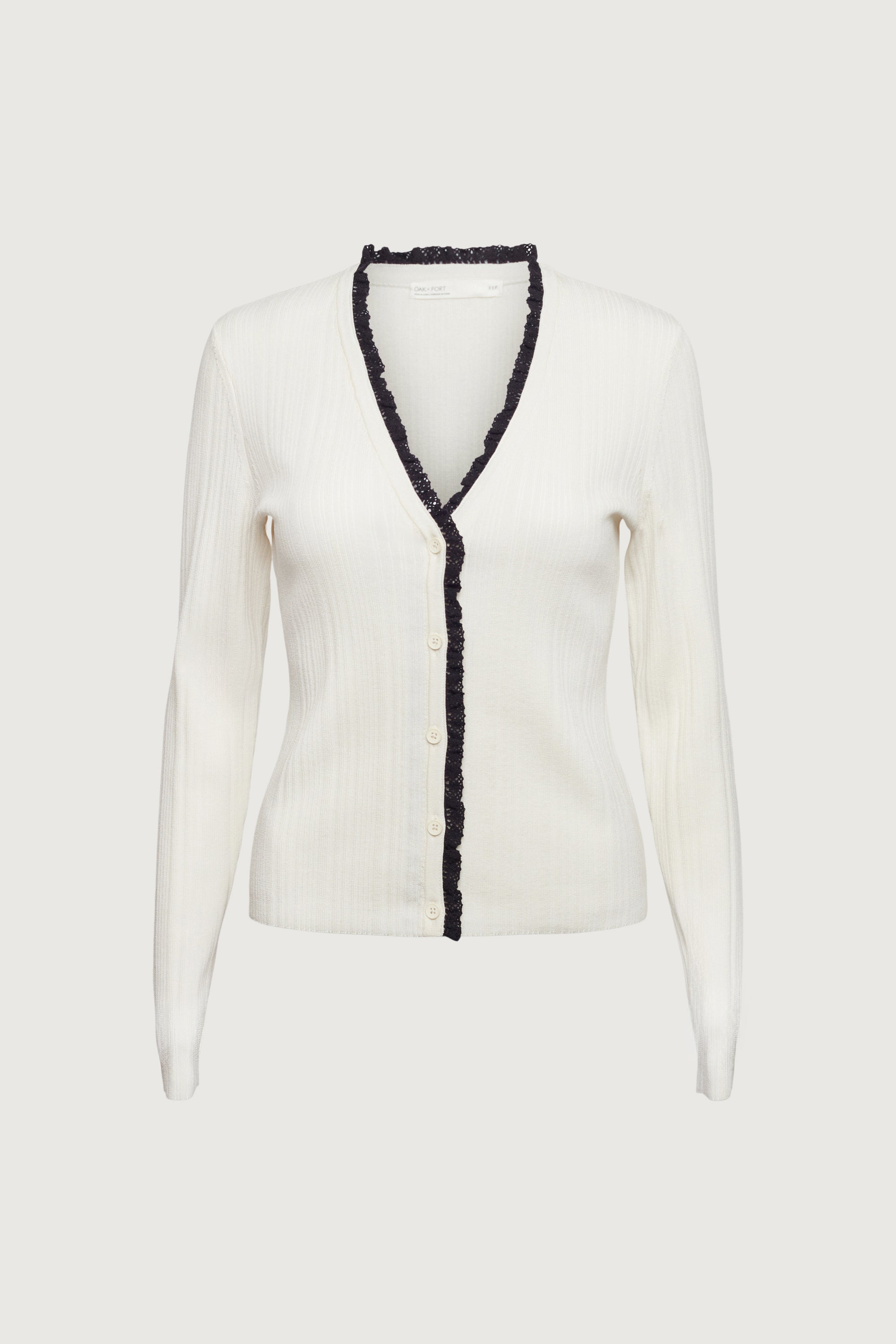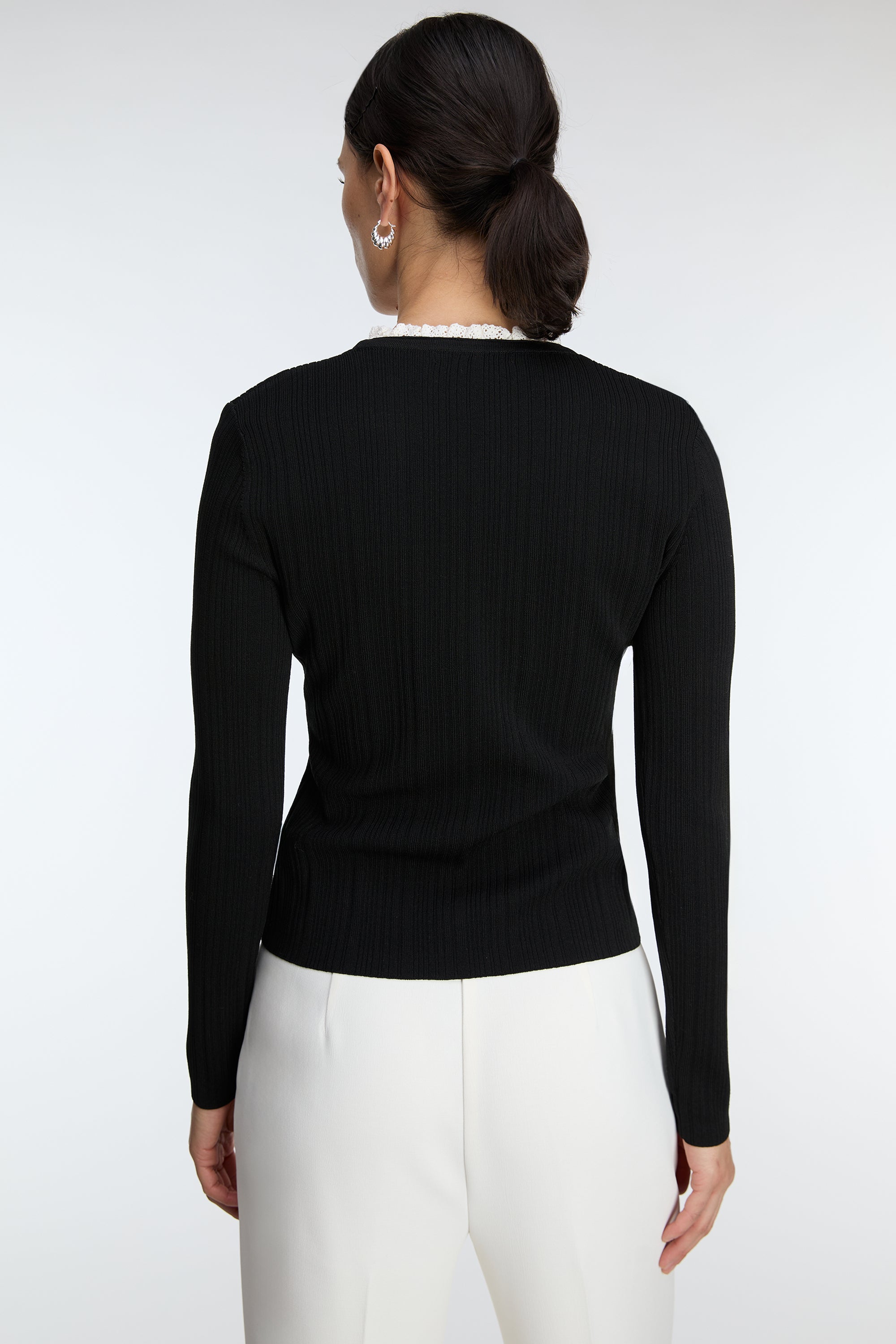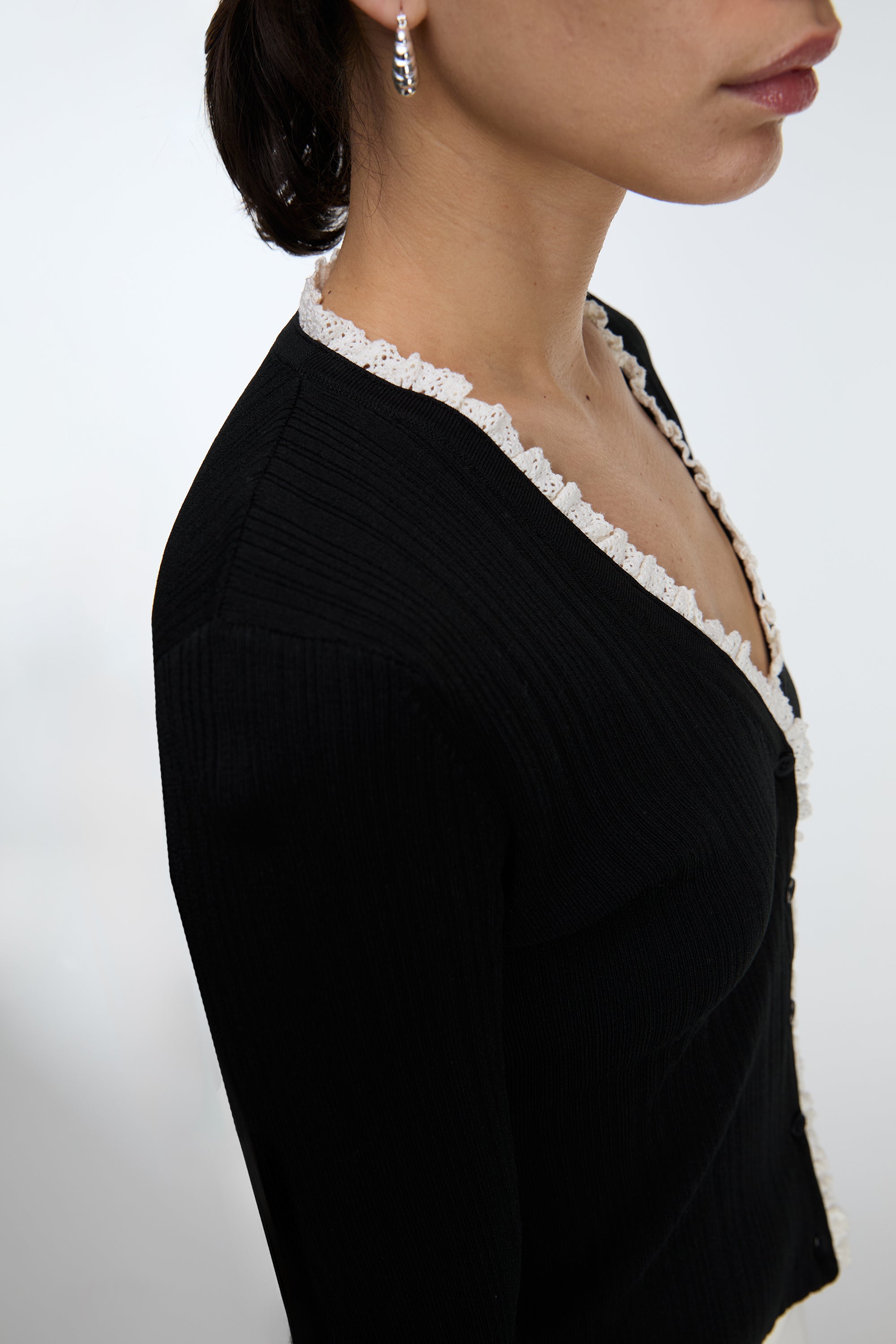 Rib-knit fabric. V-neckline. Button front with lace trims.