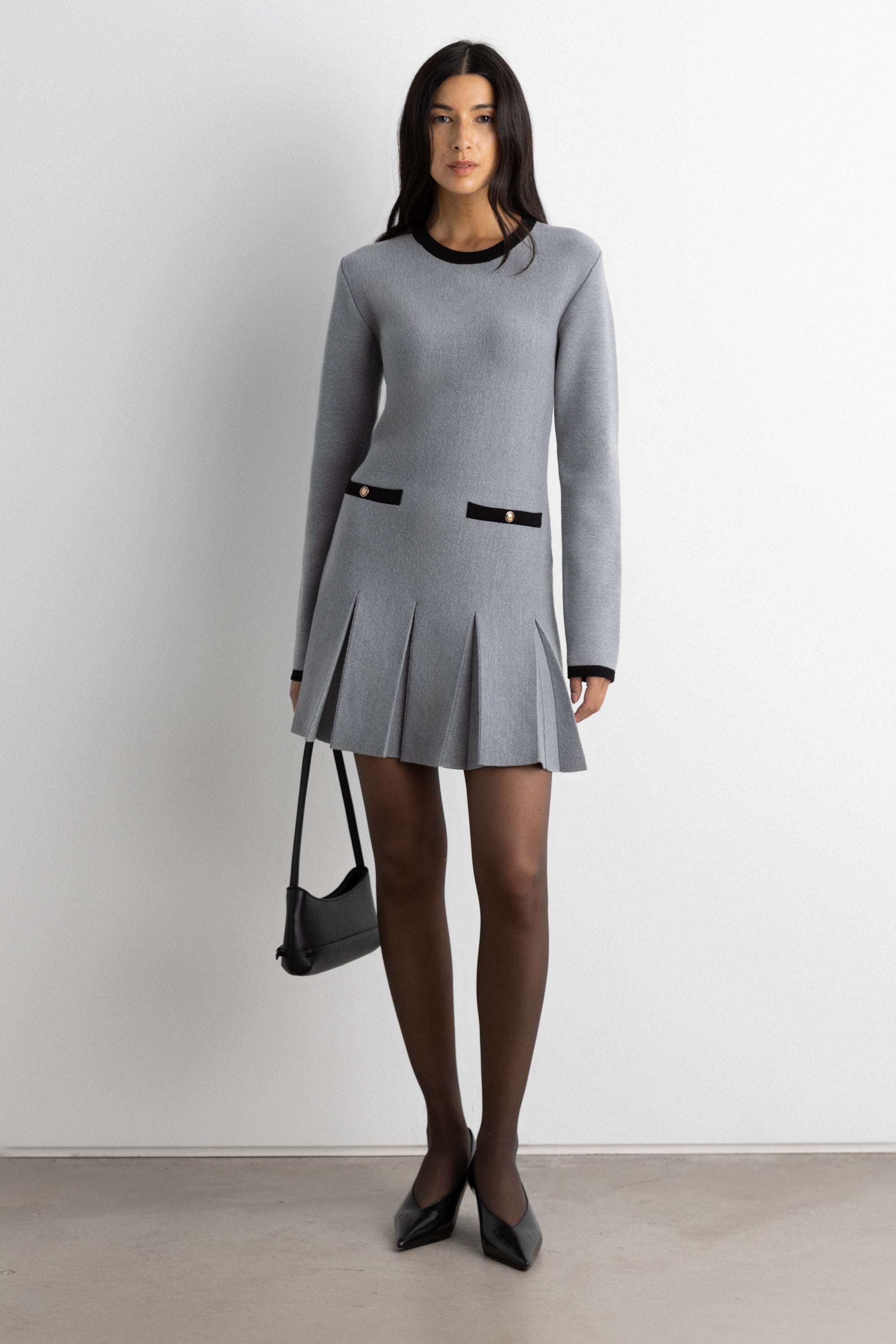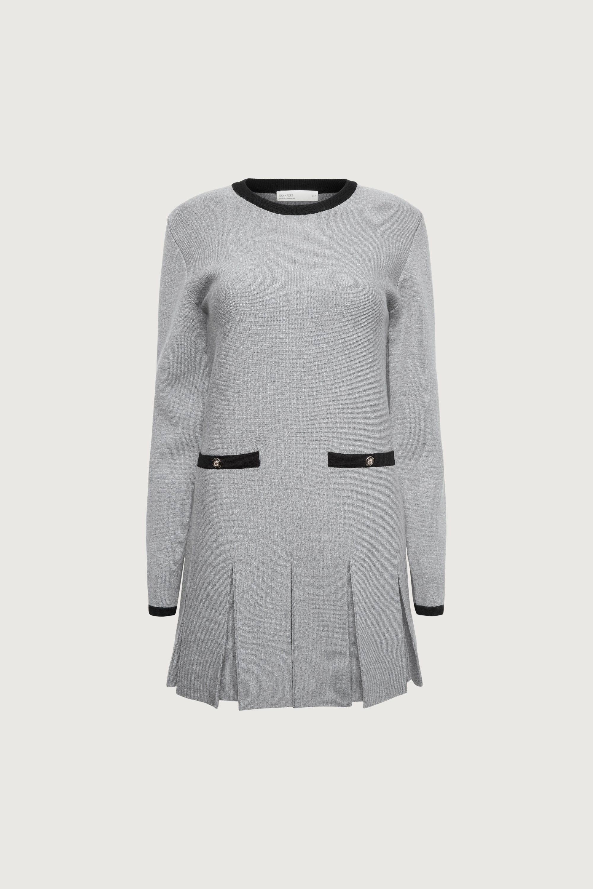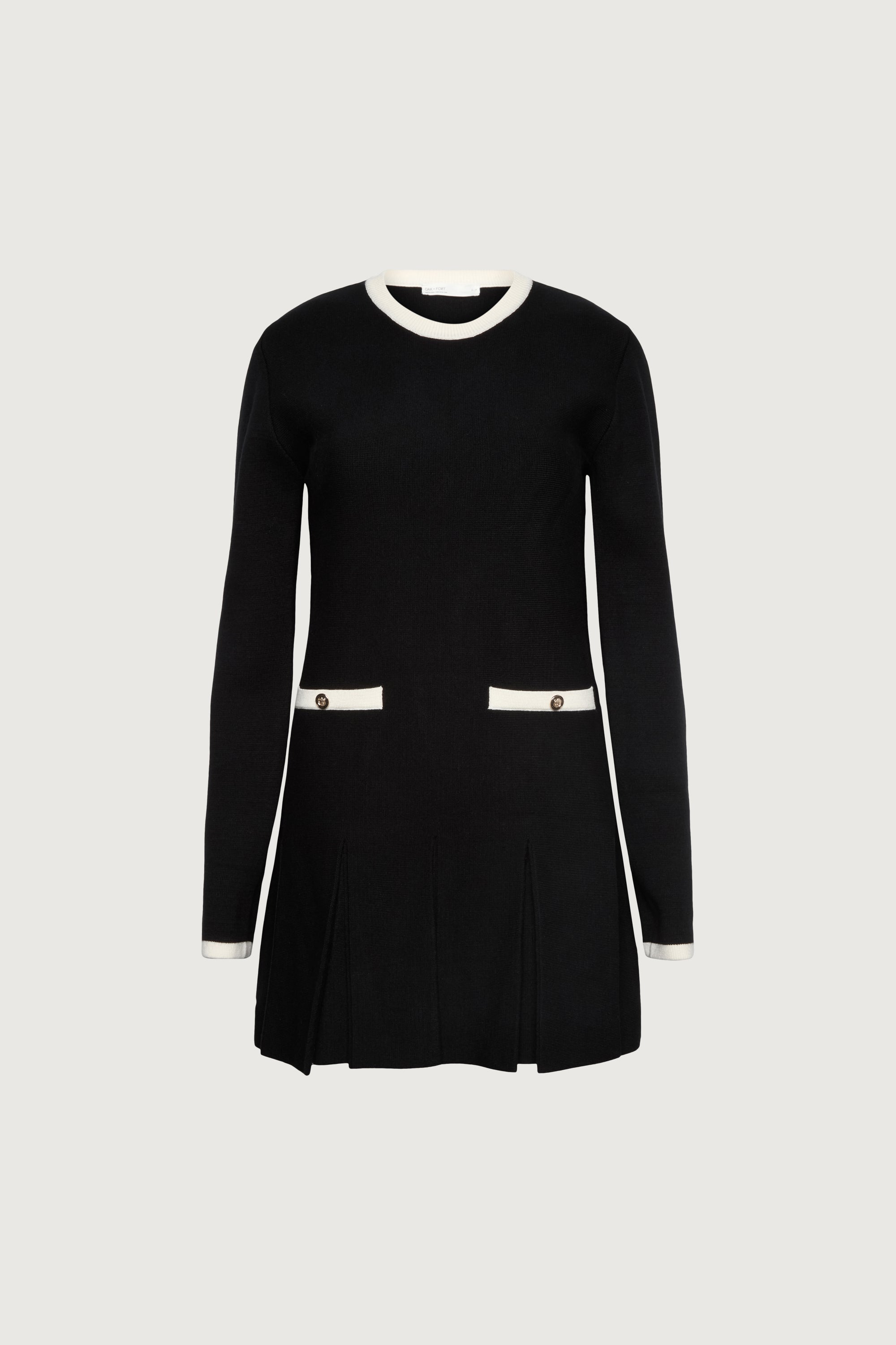This contrast trim mini dress is made from structured jacquard knit in a slim fit. It's detailed with welt pocket designs, metal crest buttons and a pleated skirt. Pair yours with leather boots.