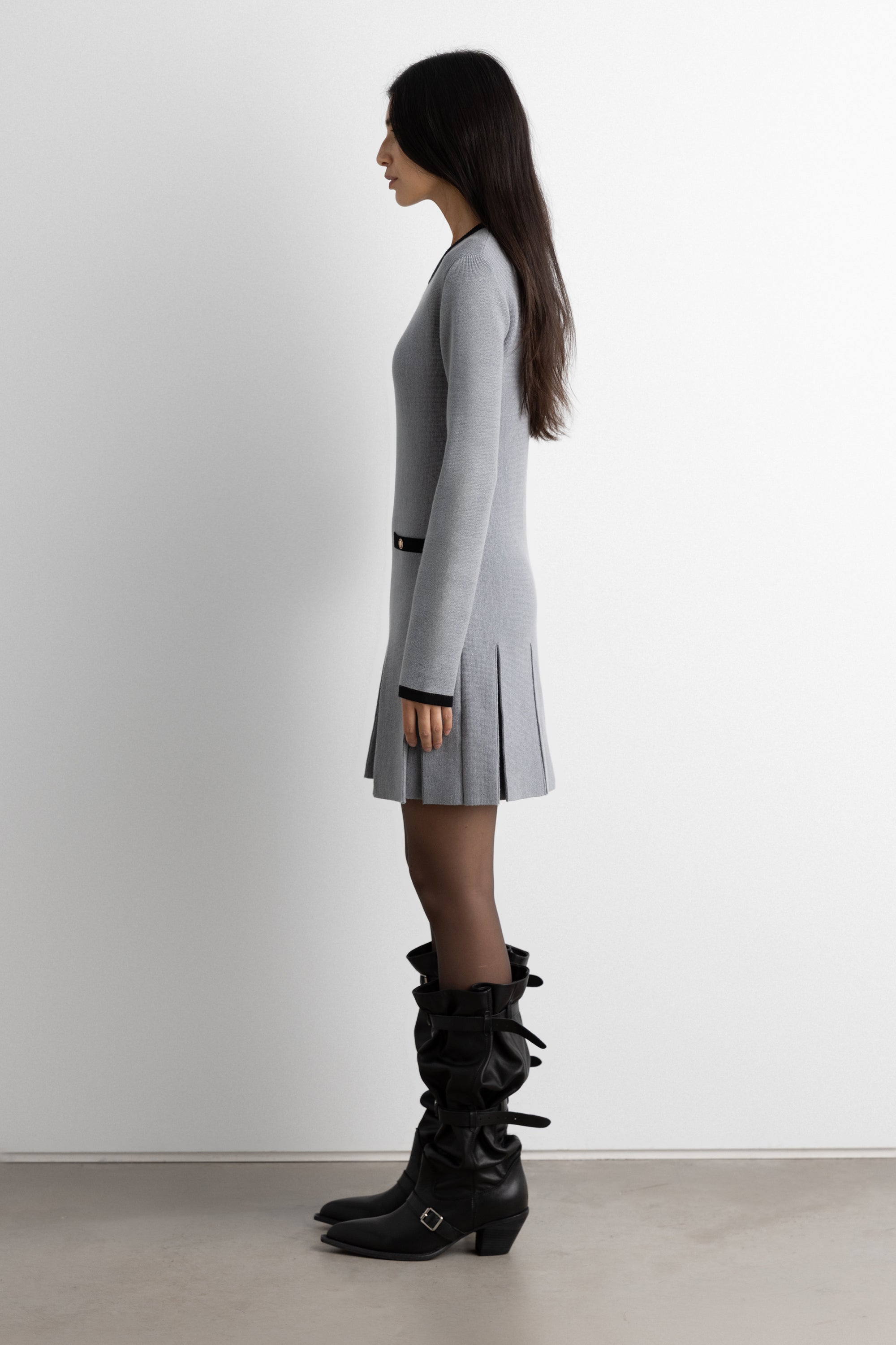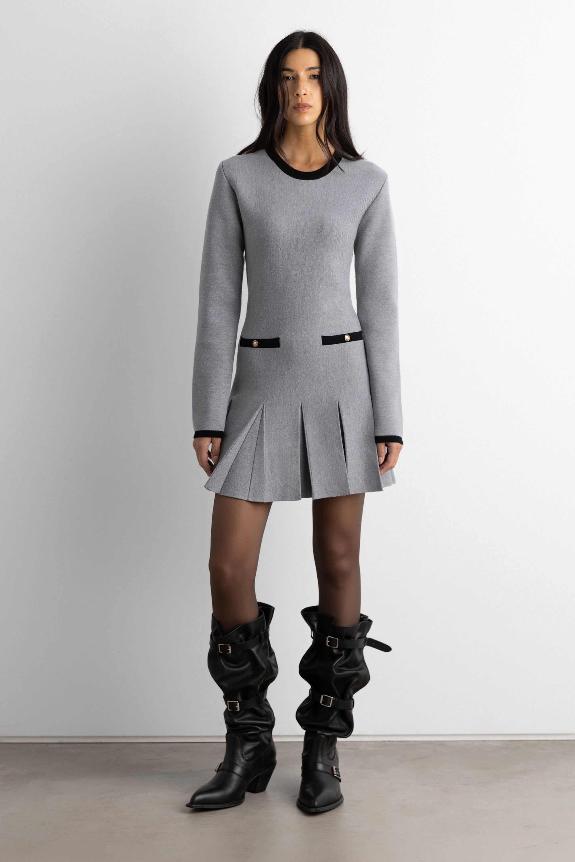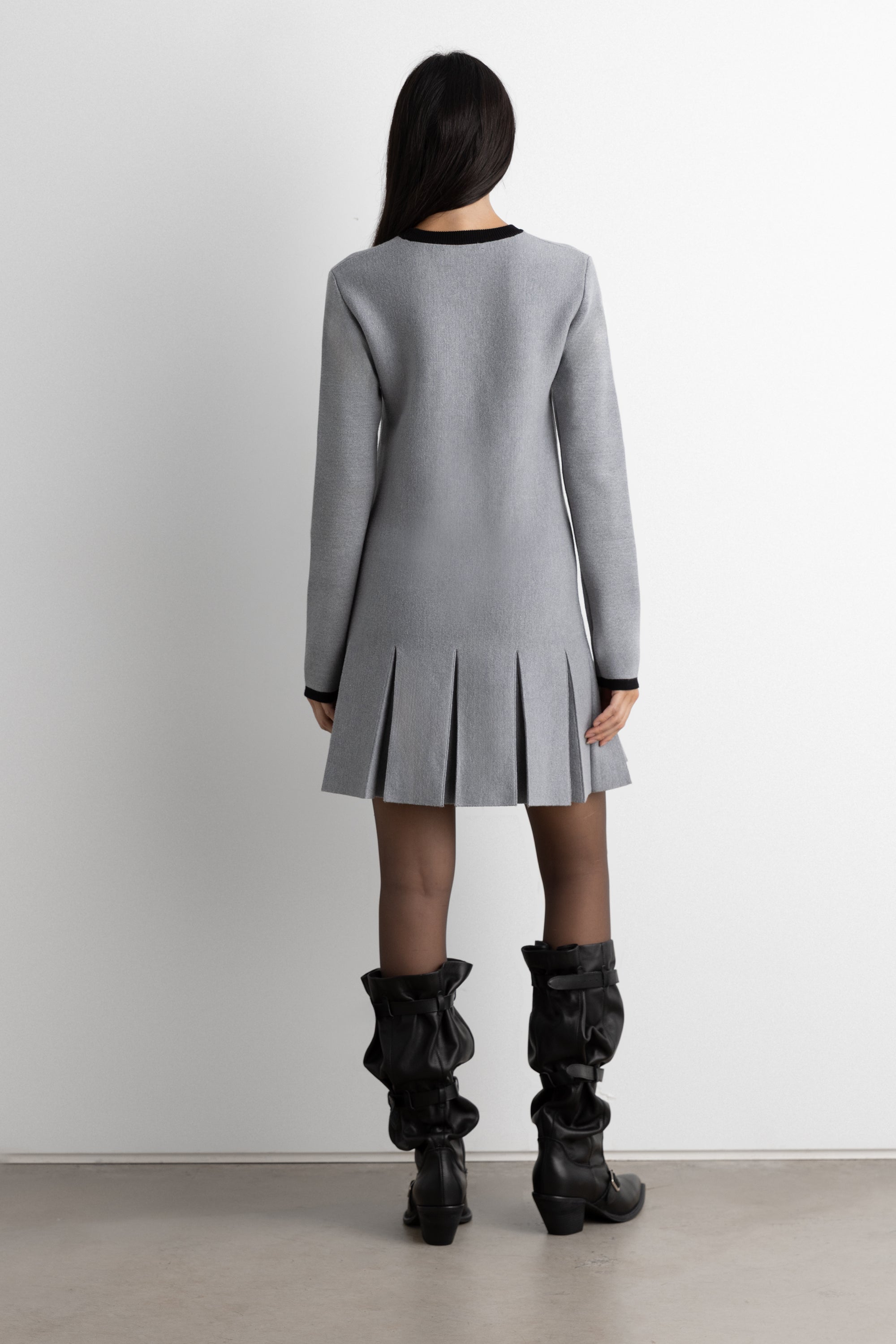 This contrast trim mini dress is made from structured jacquard knit in a slim fit. It's detailed with welt pocket designs, metal crest buttons and a pleated skirt. Pair yours with leather boots.