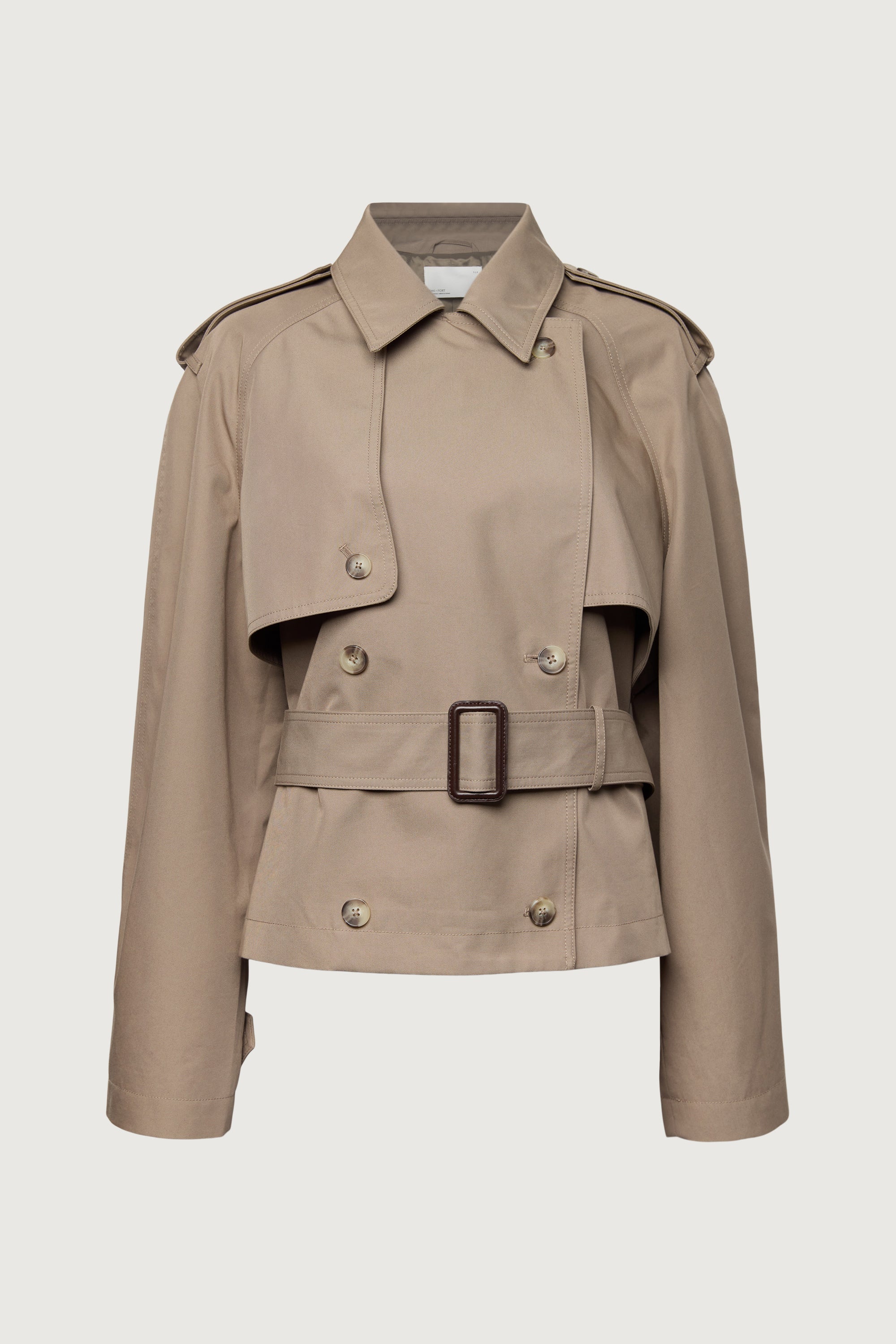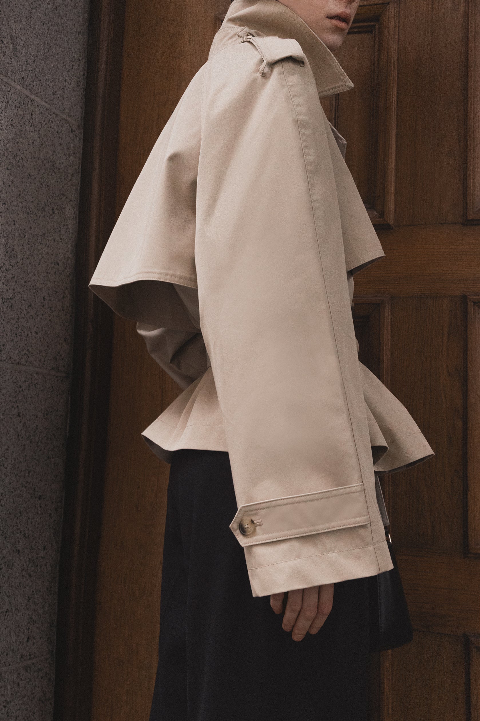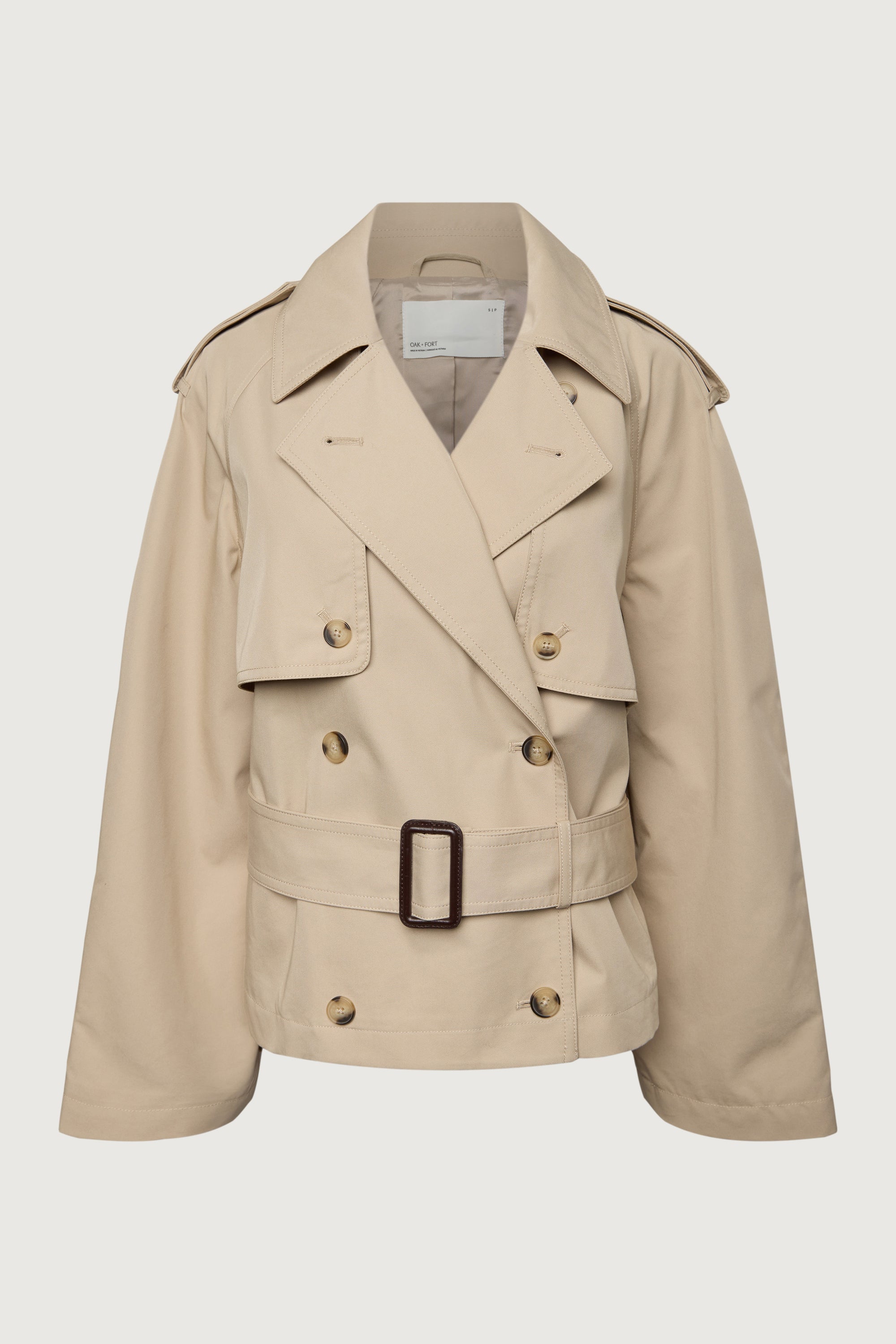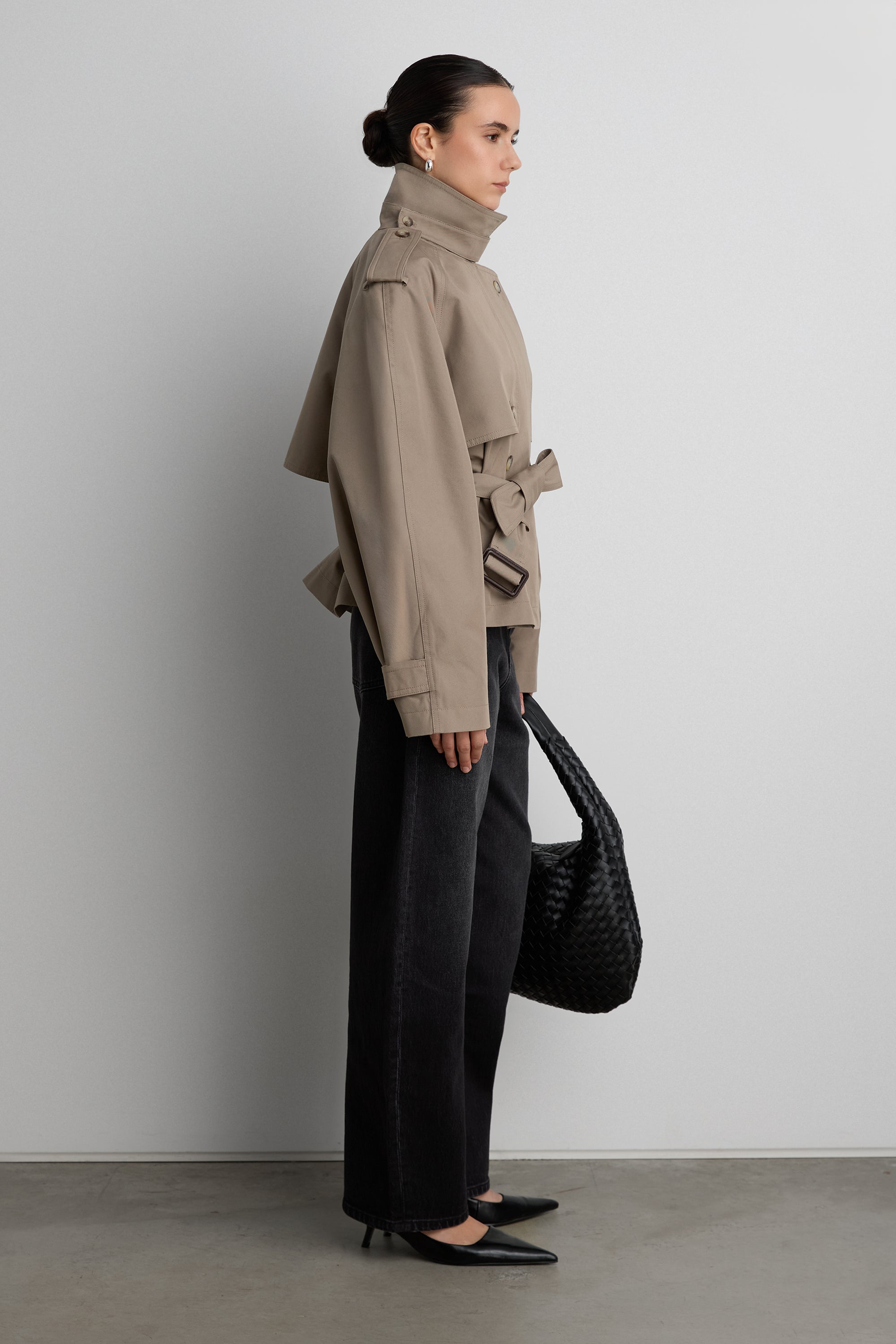 This cotton blend trench coat is crafted from a cotton blend with a clean, tailored silhouette. It’s made in a short length to keep things simple and it features the classics—epaulettes, a double-breasted front and a belt at the waist. It’s updated with a collar that can be worn as a funnel neck and is detailed with a removable buckle strap.