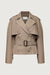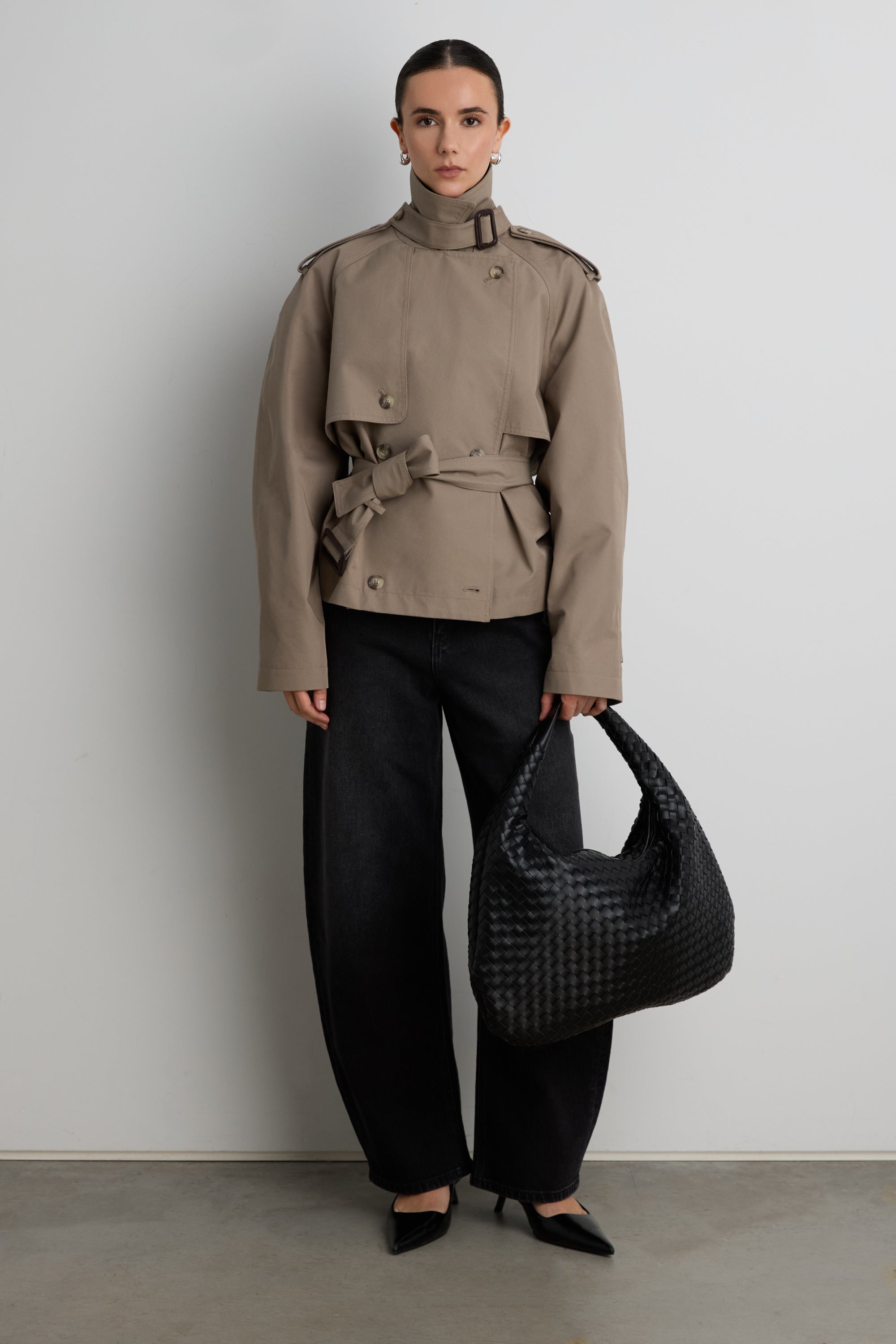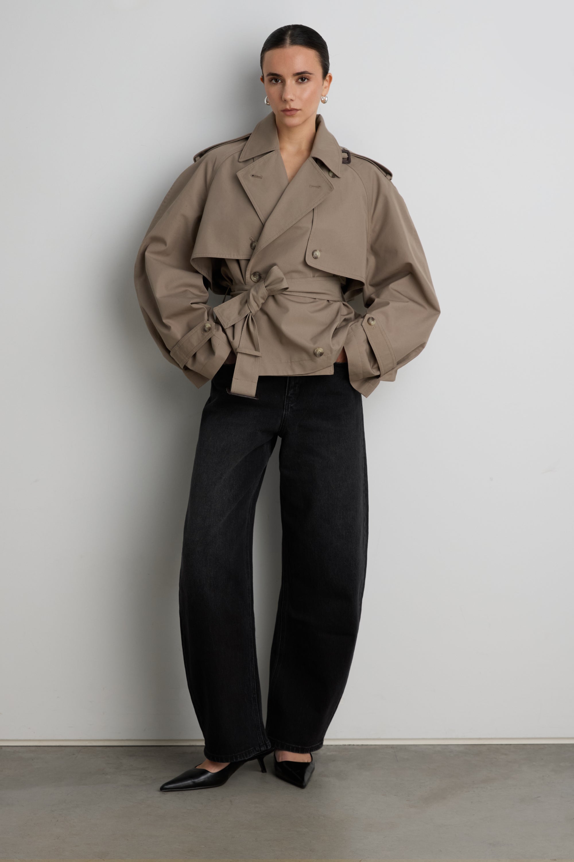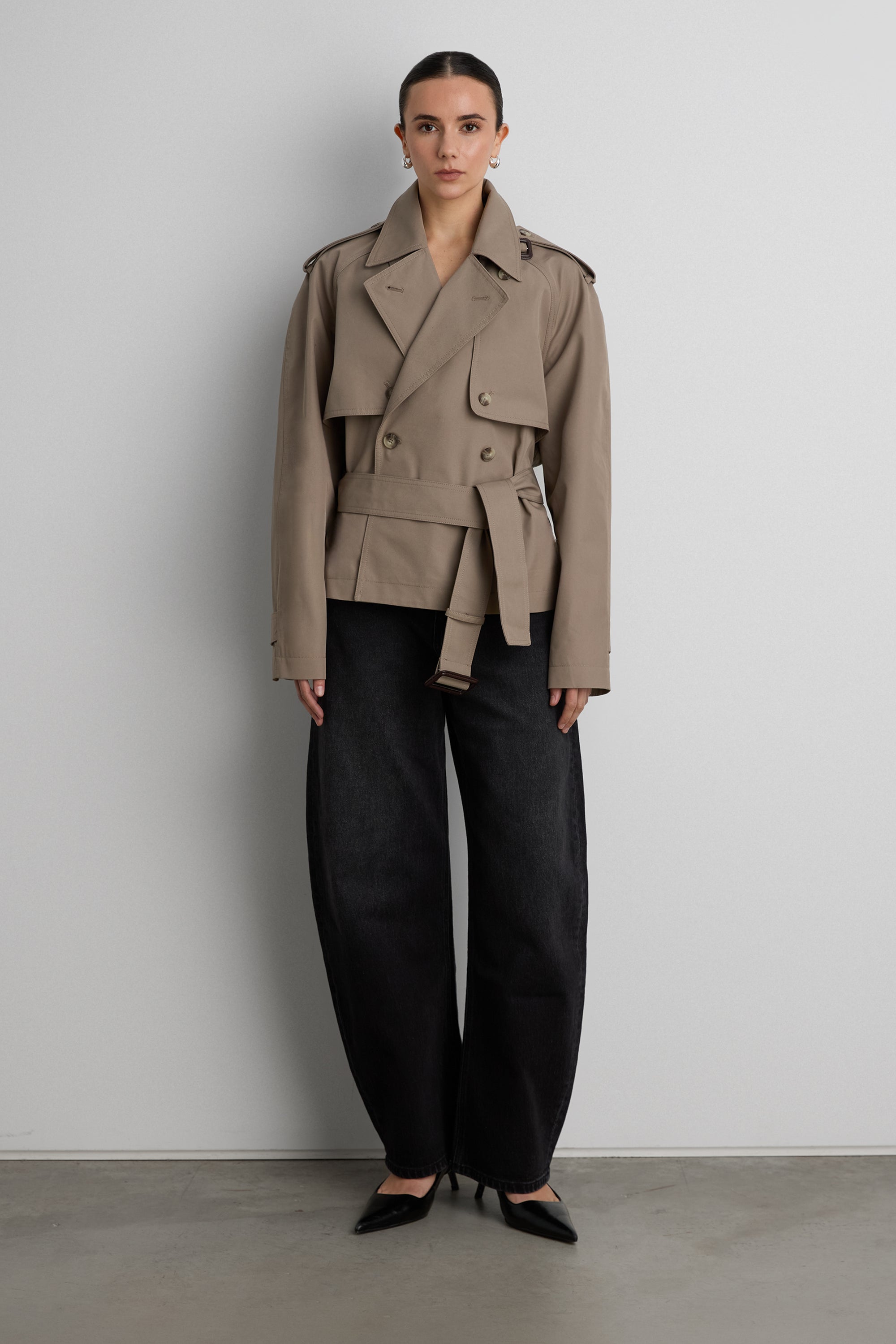 This cotton blend trench coat is crafted from a cotton blend with a clean, tailored silhouette. It’s made in a short length to keep things simple and it features the classics—epaulettes, a double-breasted front and a belt at the waist. It’s updated with a collar that can be worn as a funnel neck and is detailed with a removable buckle strap.