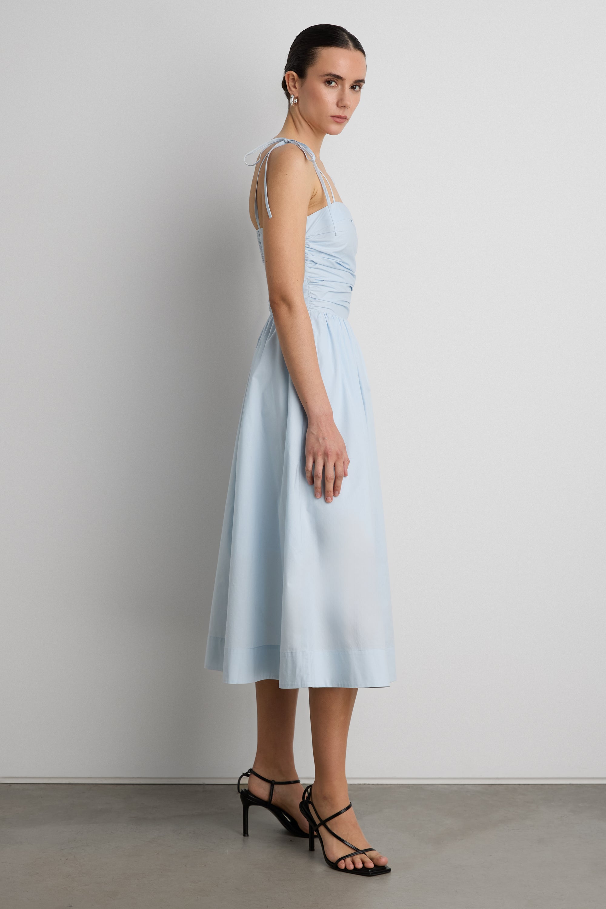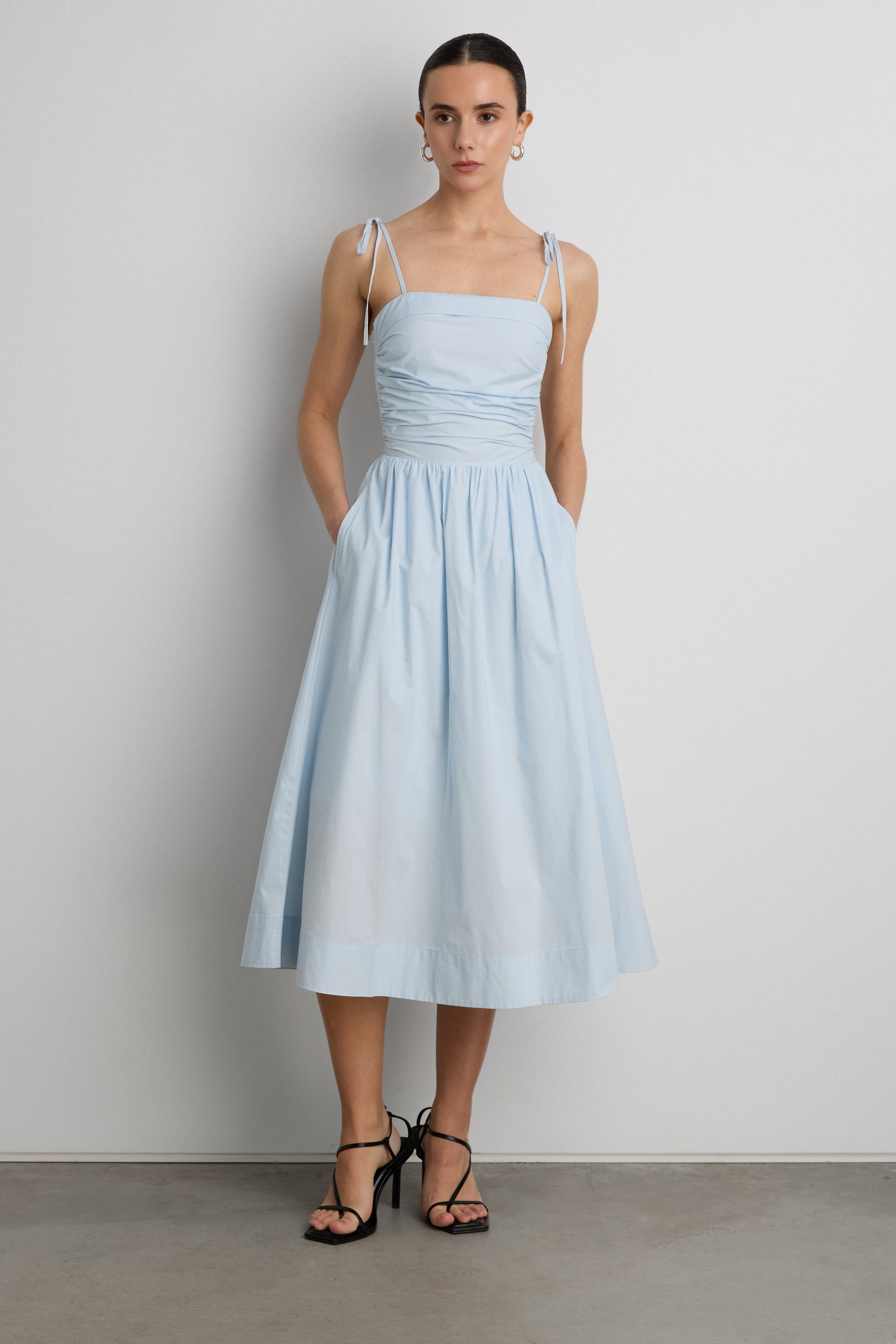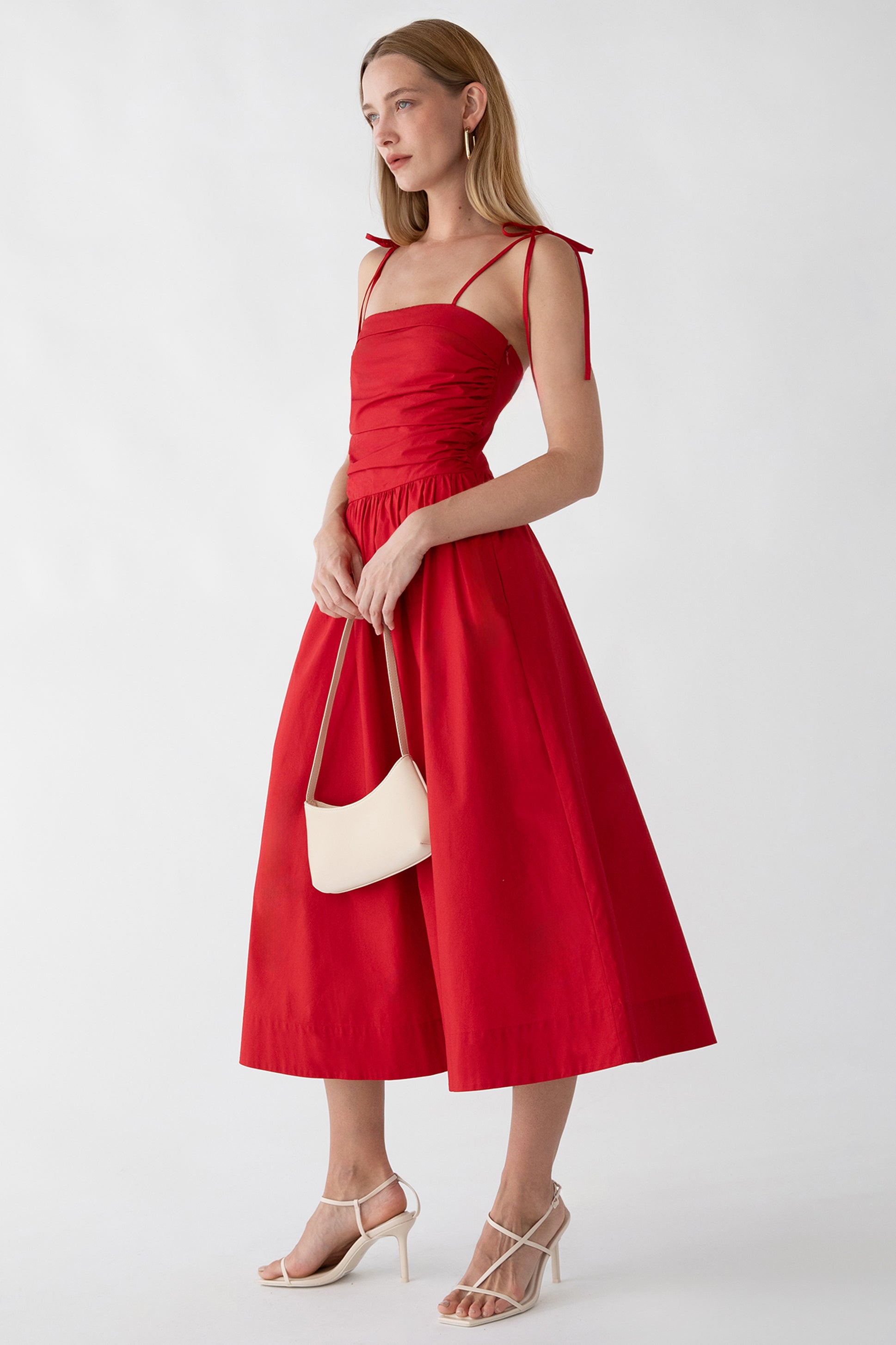This square neck midi dress is made from cotton poplin in a classic fit. It's detailed with a ruched bodice smocked at the back, shoulder ties and a gathered waist to highlight the A-line skirt. Pair yours with sandals and your fave jewelry.