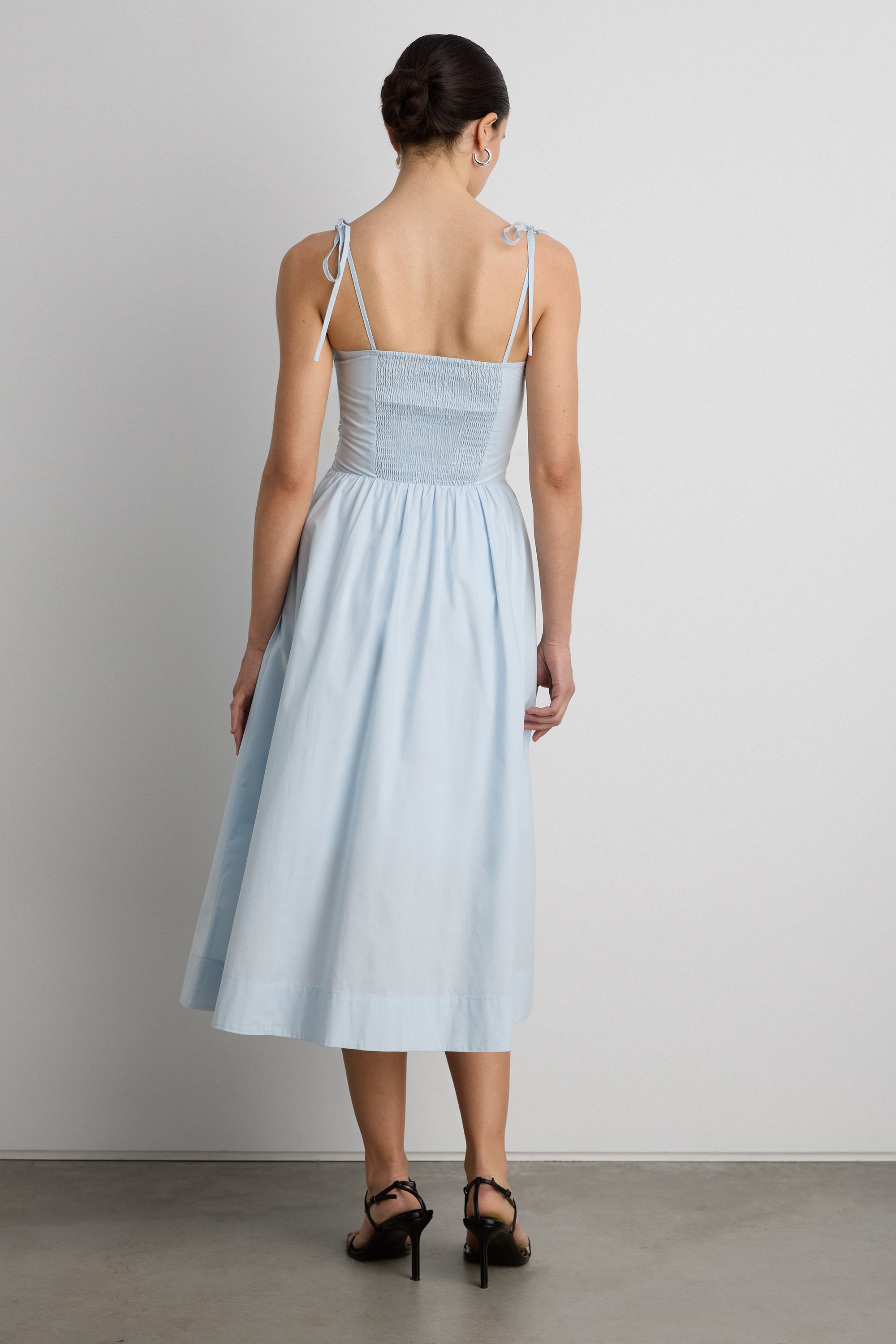 Lightweight cotton poplin. Square neckline. Ruched bodice. Smocked back with zipper. Shoulder ties. Gathered A-line skirt.