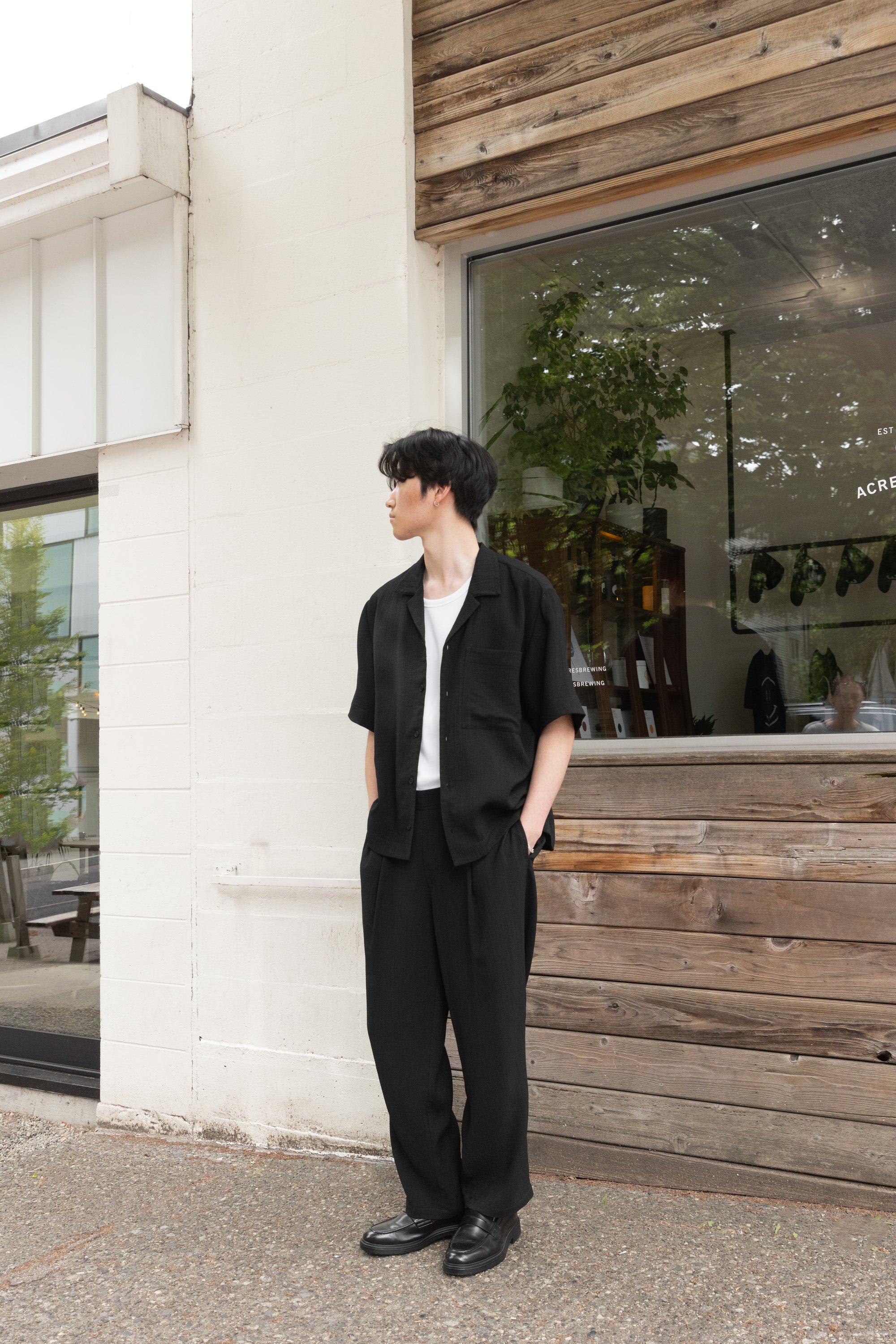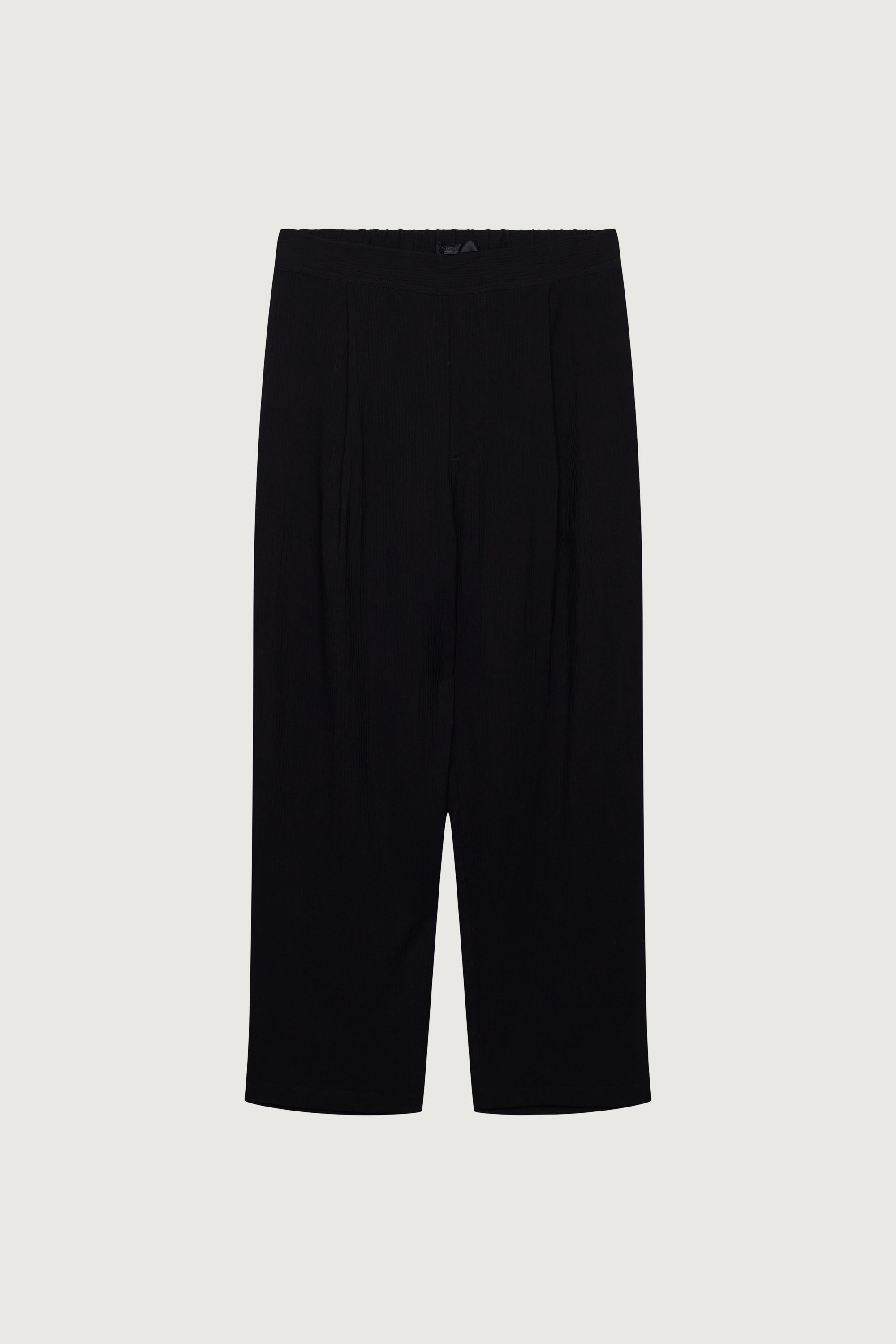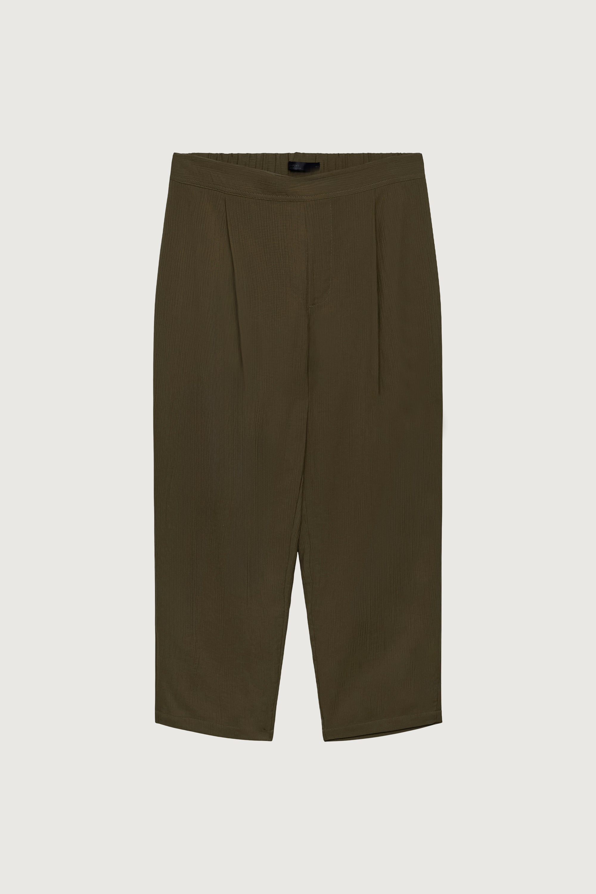 Soft. Lightweight. Pleats. Crinkled texture. Pockets. Elasticated rear waistband. Wide ankle. 28" Inseam length based on size M.
