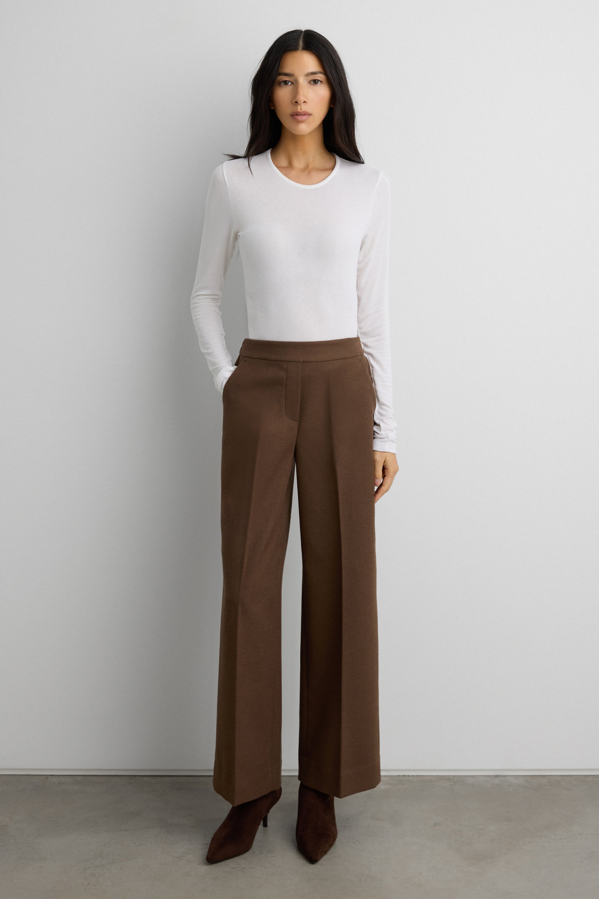 Thick brushed suiting fabric. Elasticated waist at the back. Pressed seams. Side pockets. Back welt pockets.
