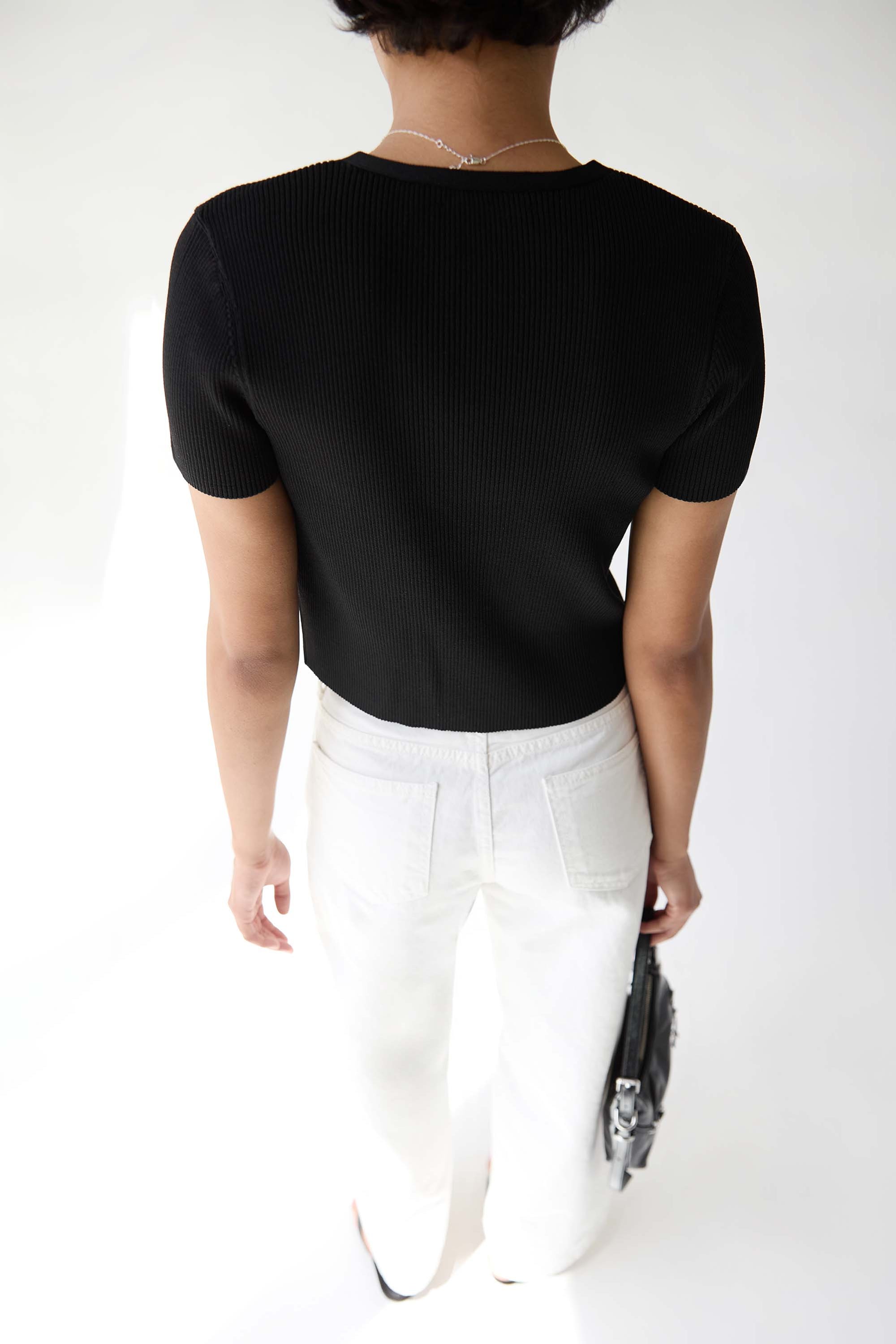 Rib-knit fabric. Short sleeves. Front tie closures.