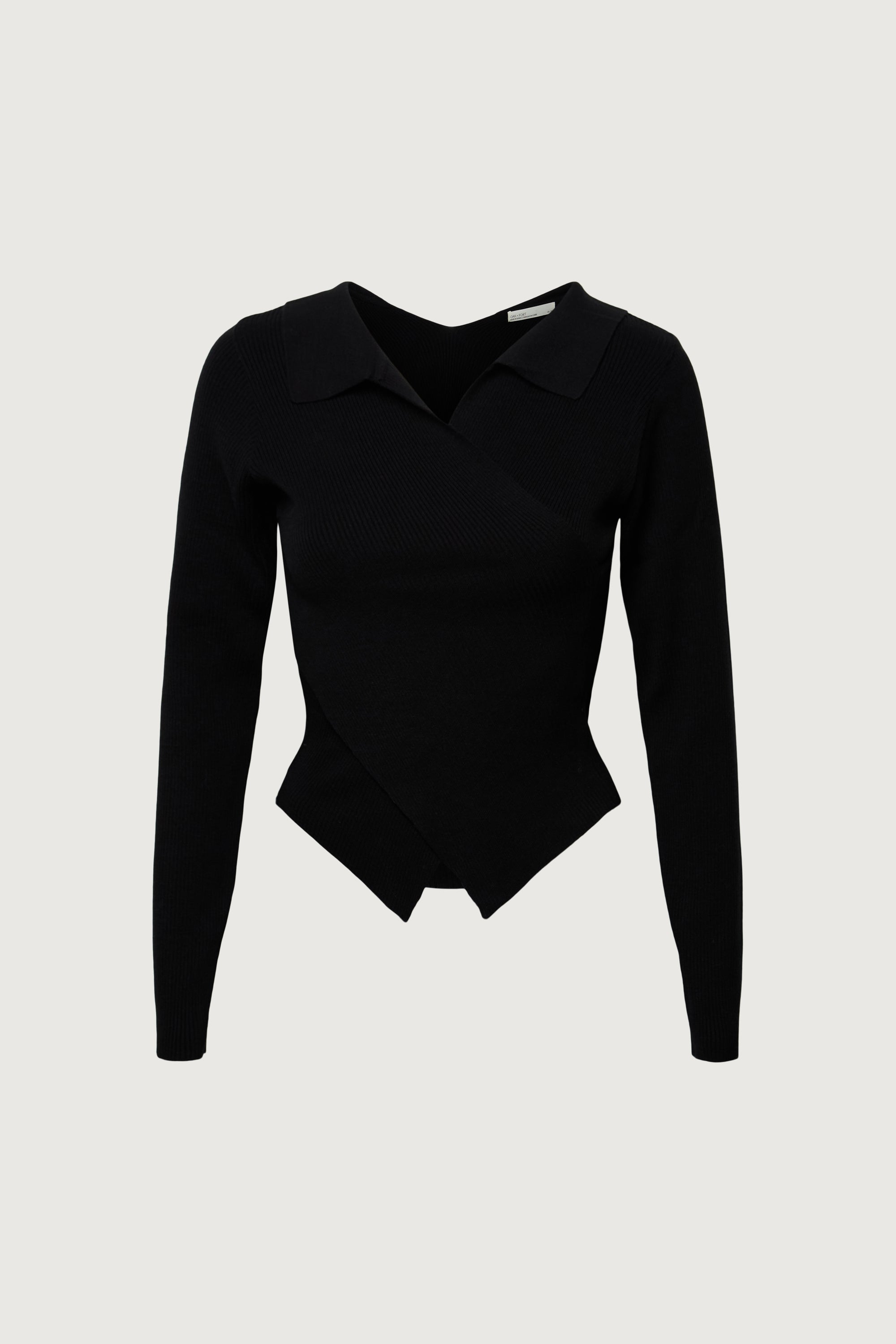 Ribbed knit. Collared V-neckline. Crossover design. Asymmetric hem.