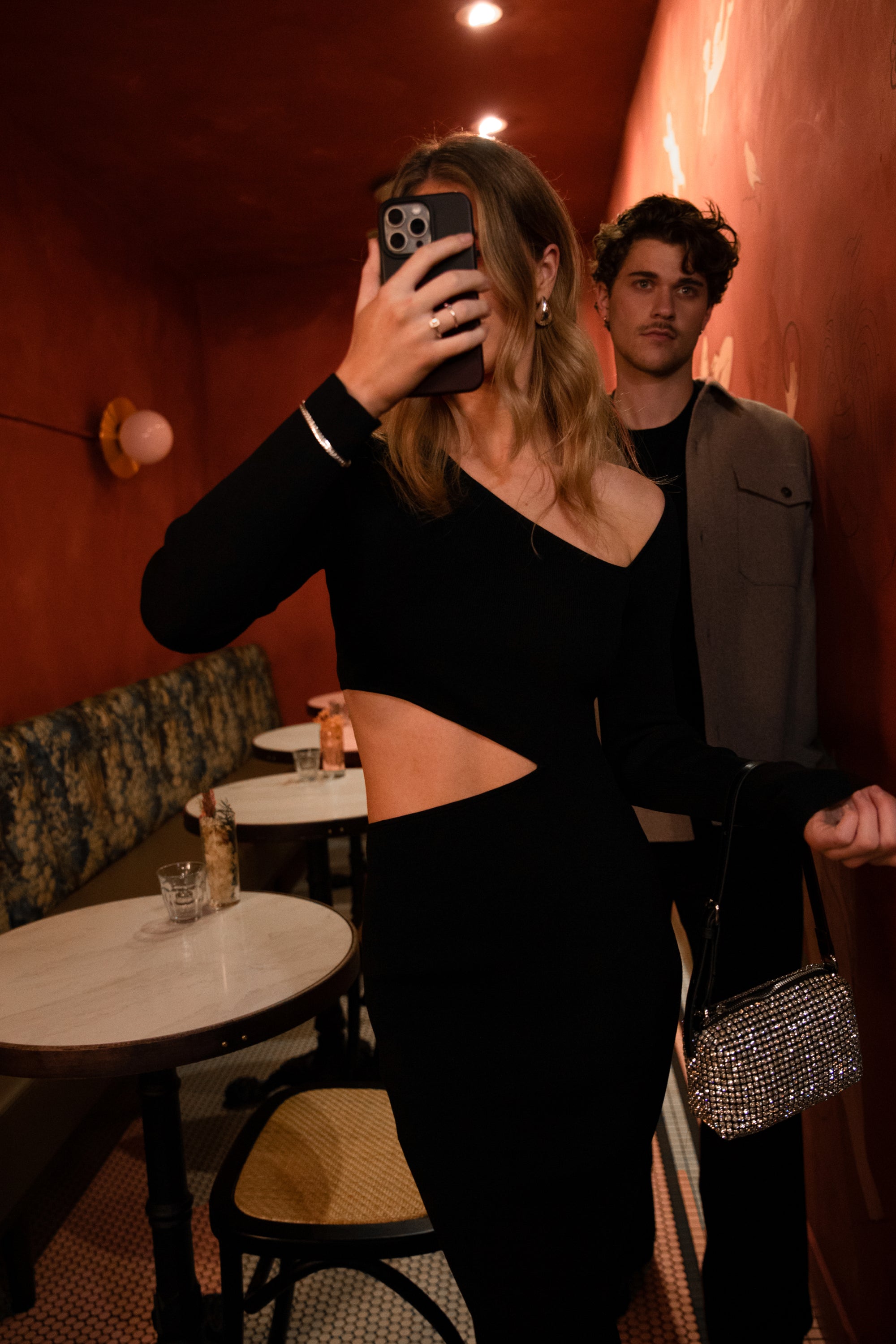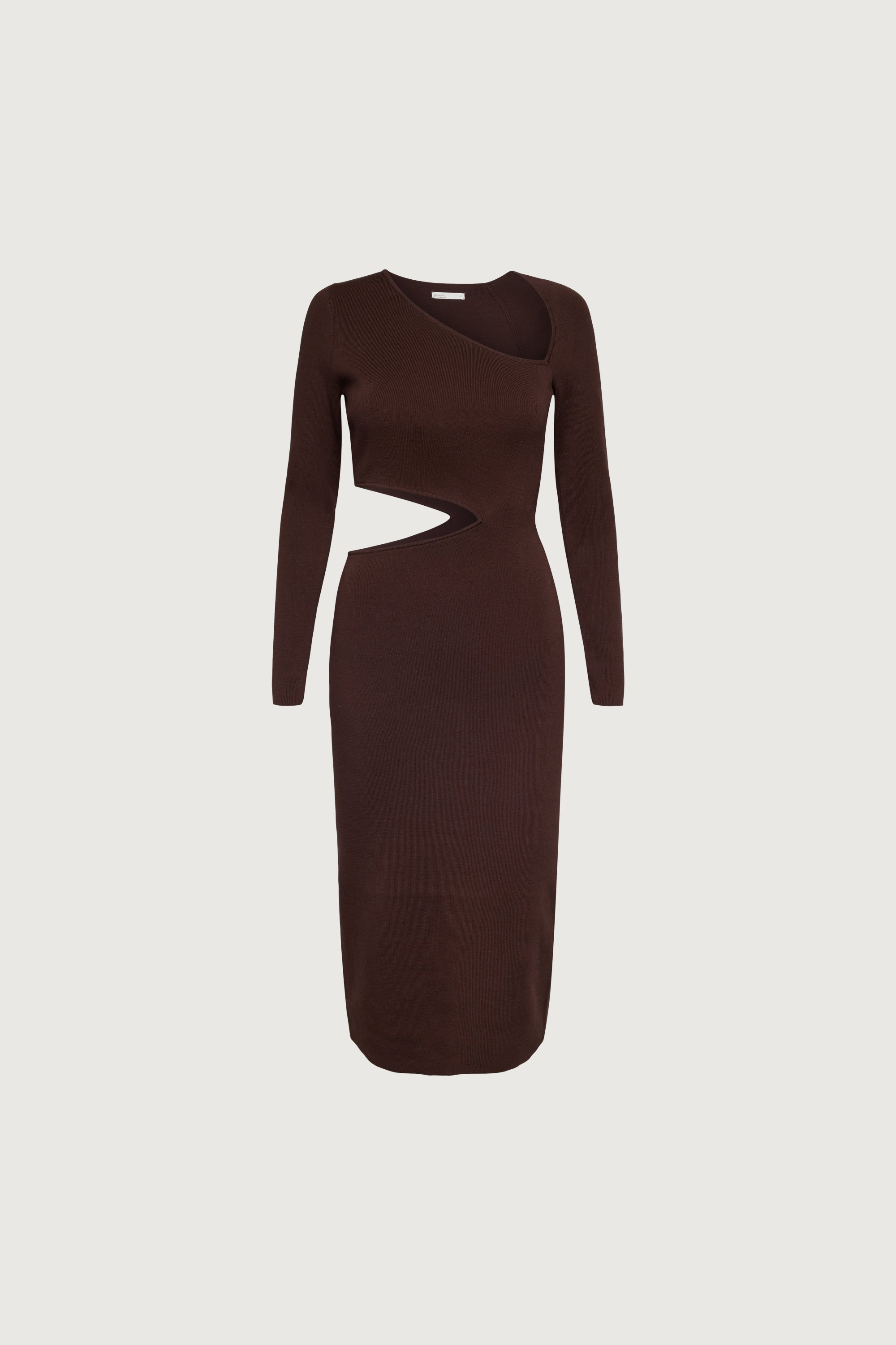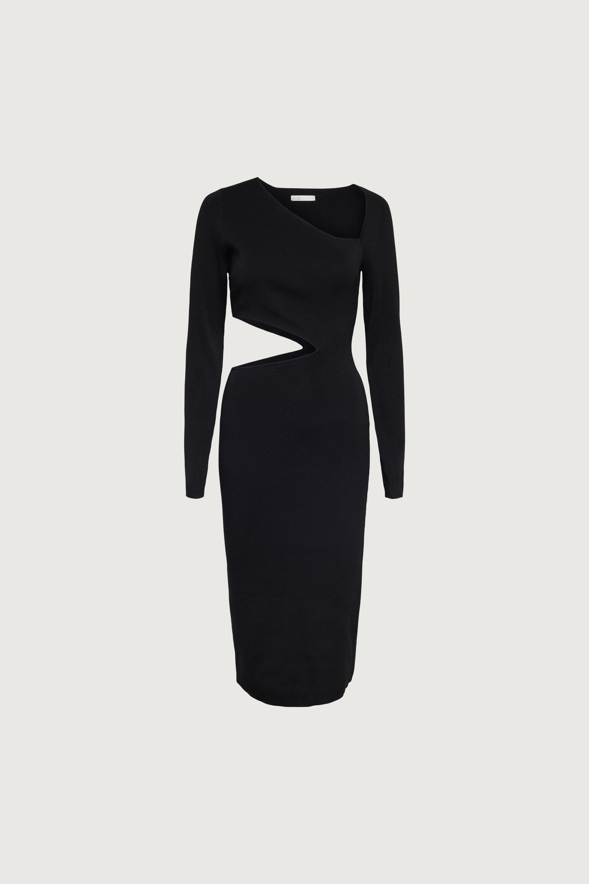 This long sleeve midi dress is made in a slim fit with an asymmetric neckline and a cut-out at the side. Attend your upcoming holiday parties in this dress and style it with pointed heels and bold earrings.