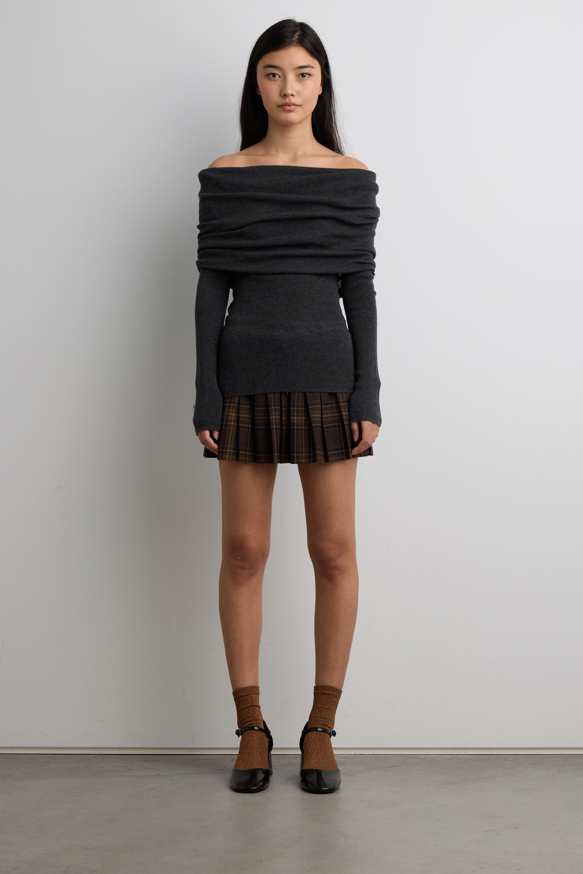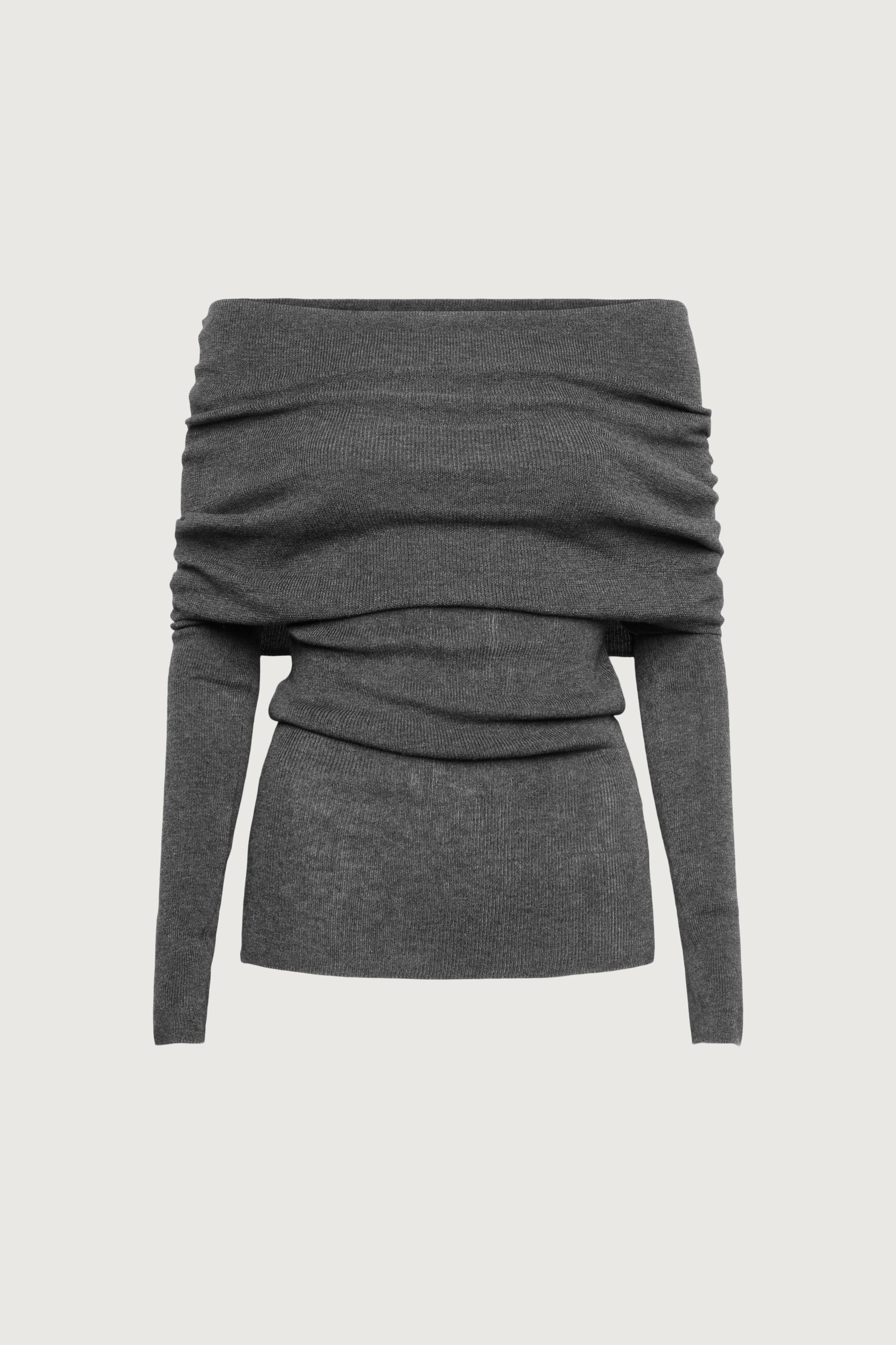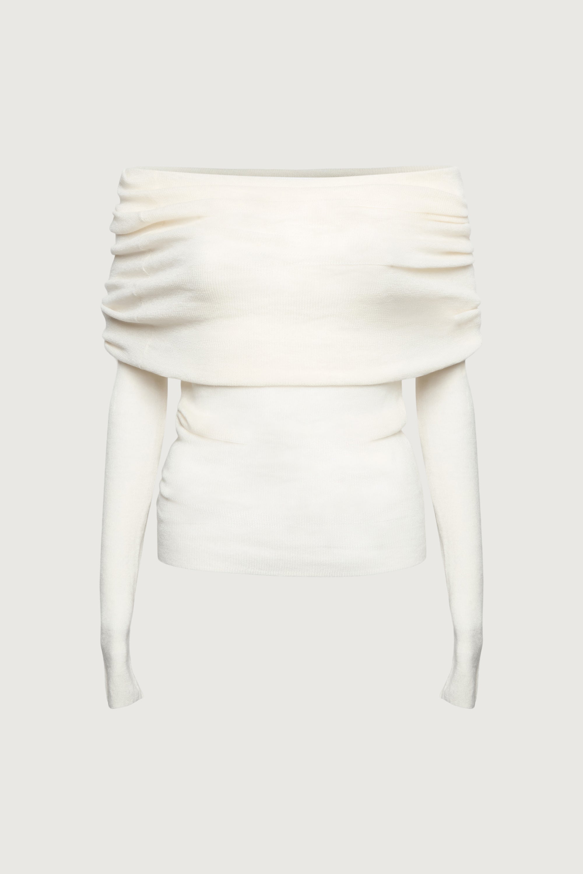 This off-shoulder sweater has draped design and has a fitted silhouette. A great occasion piece for any wardrobe.