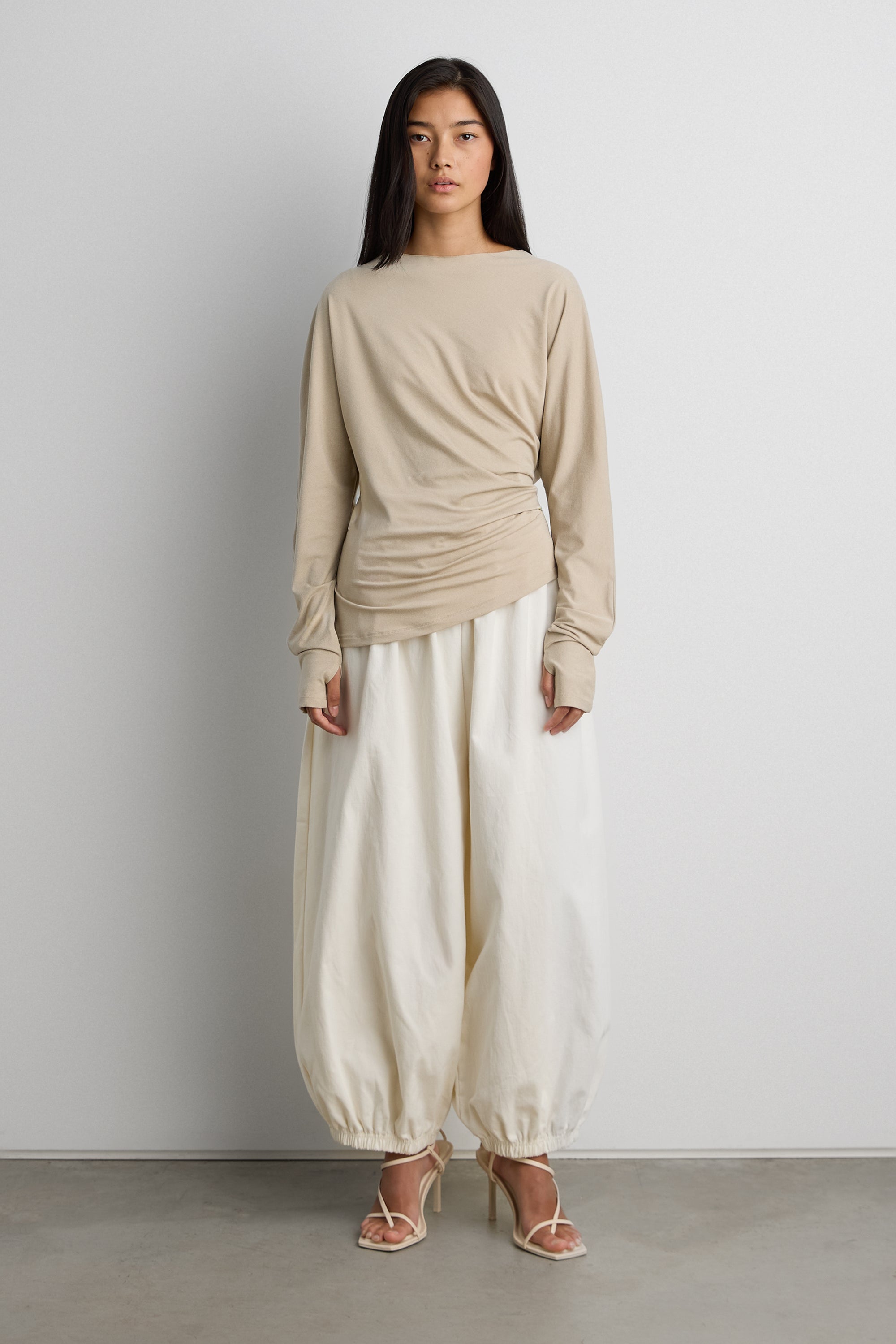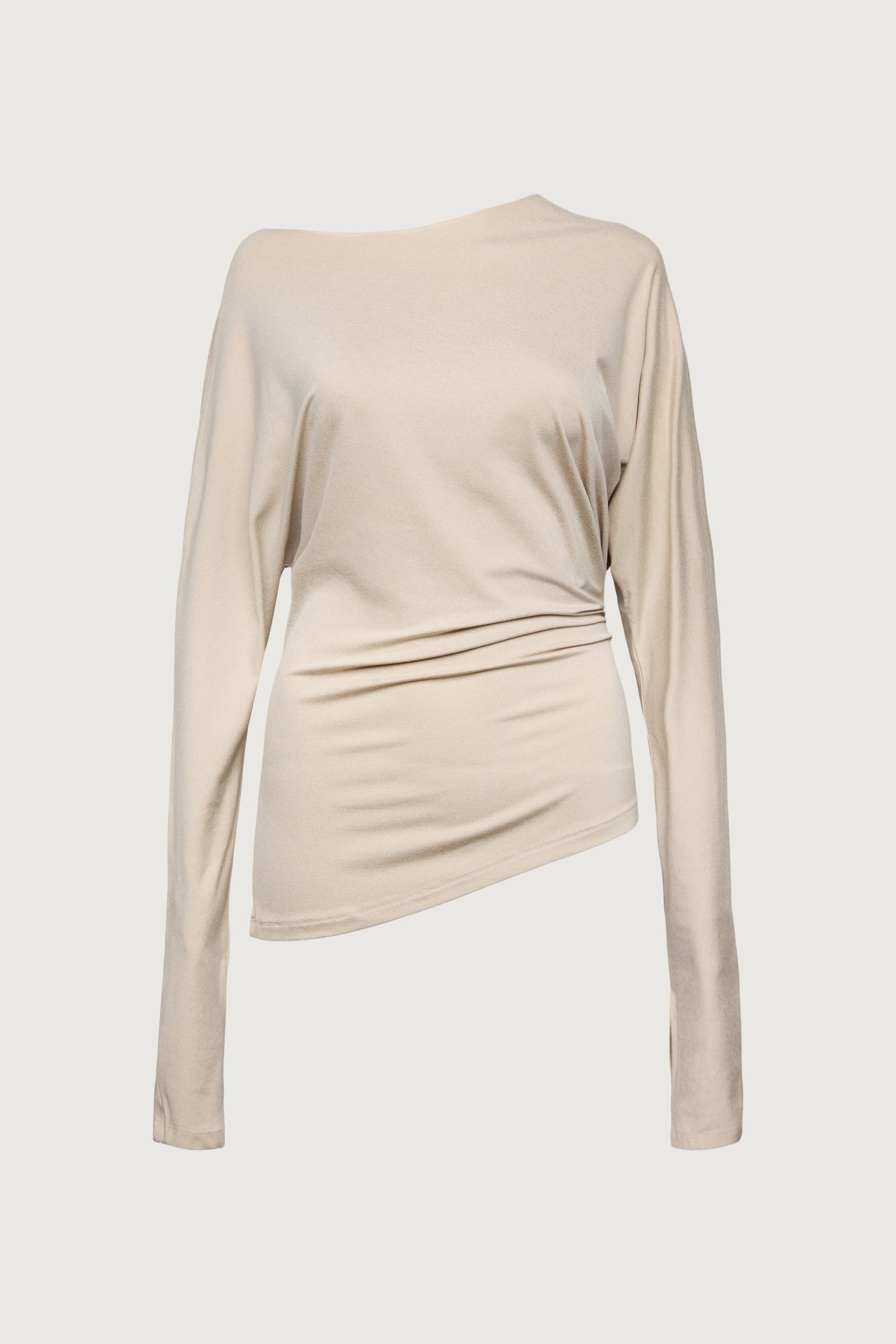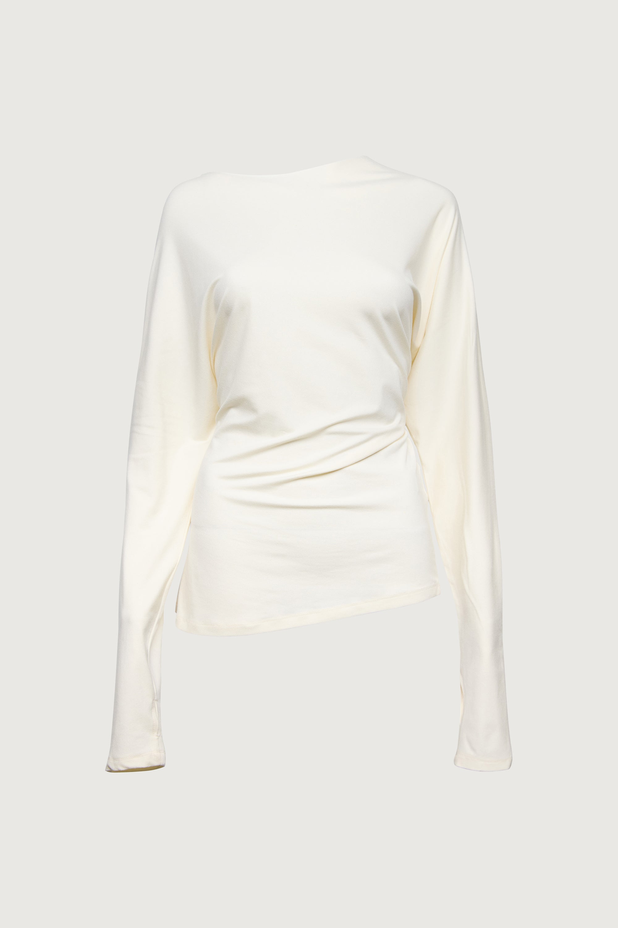 Draped silhouette. Long sleeves. Thumb holes.