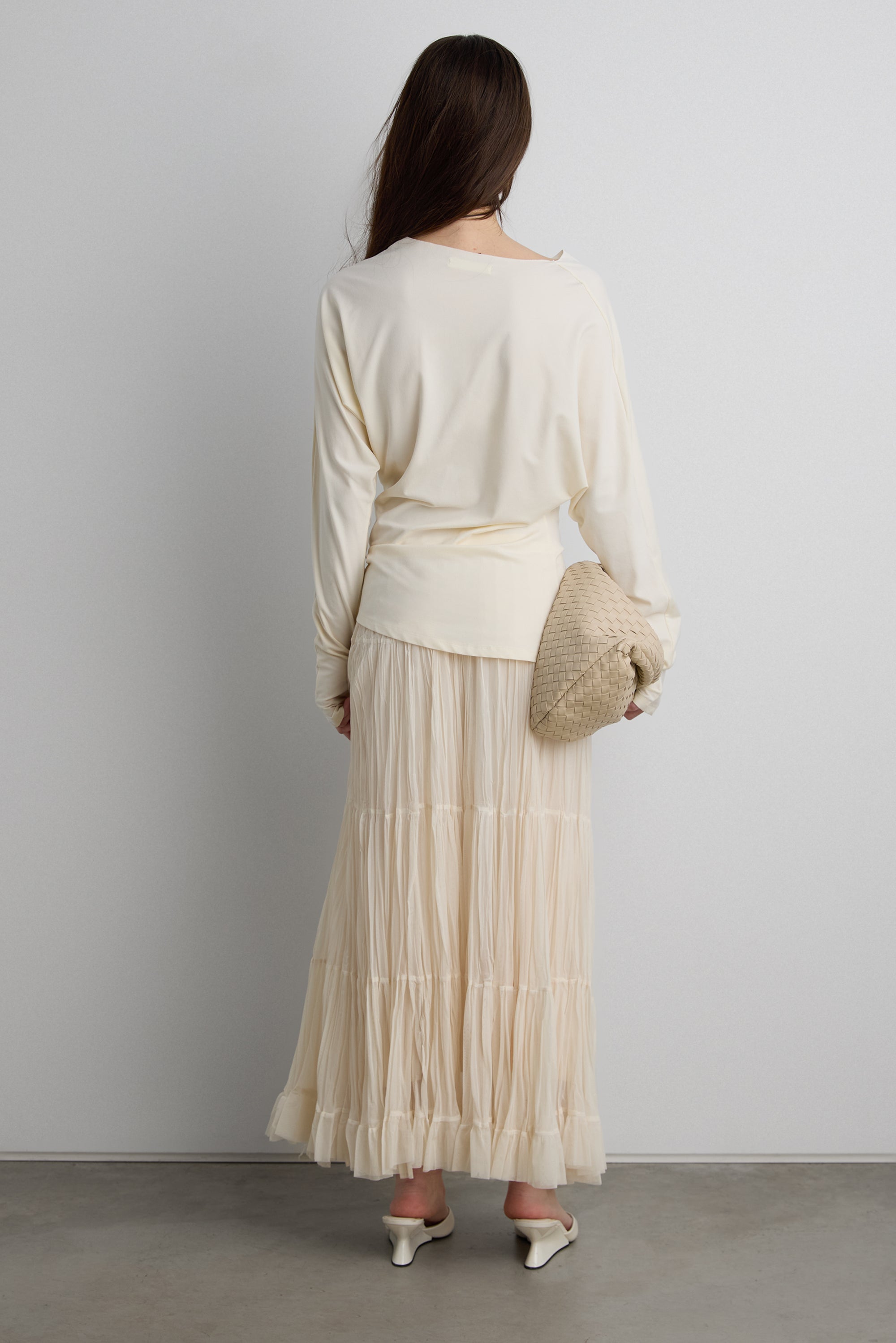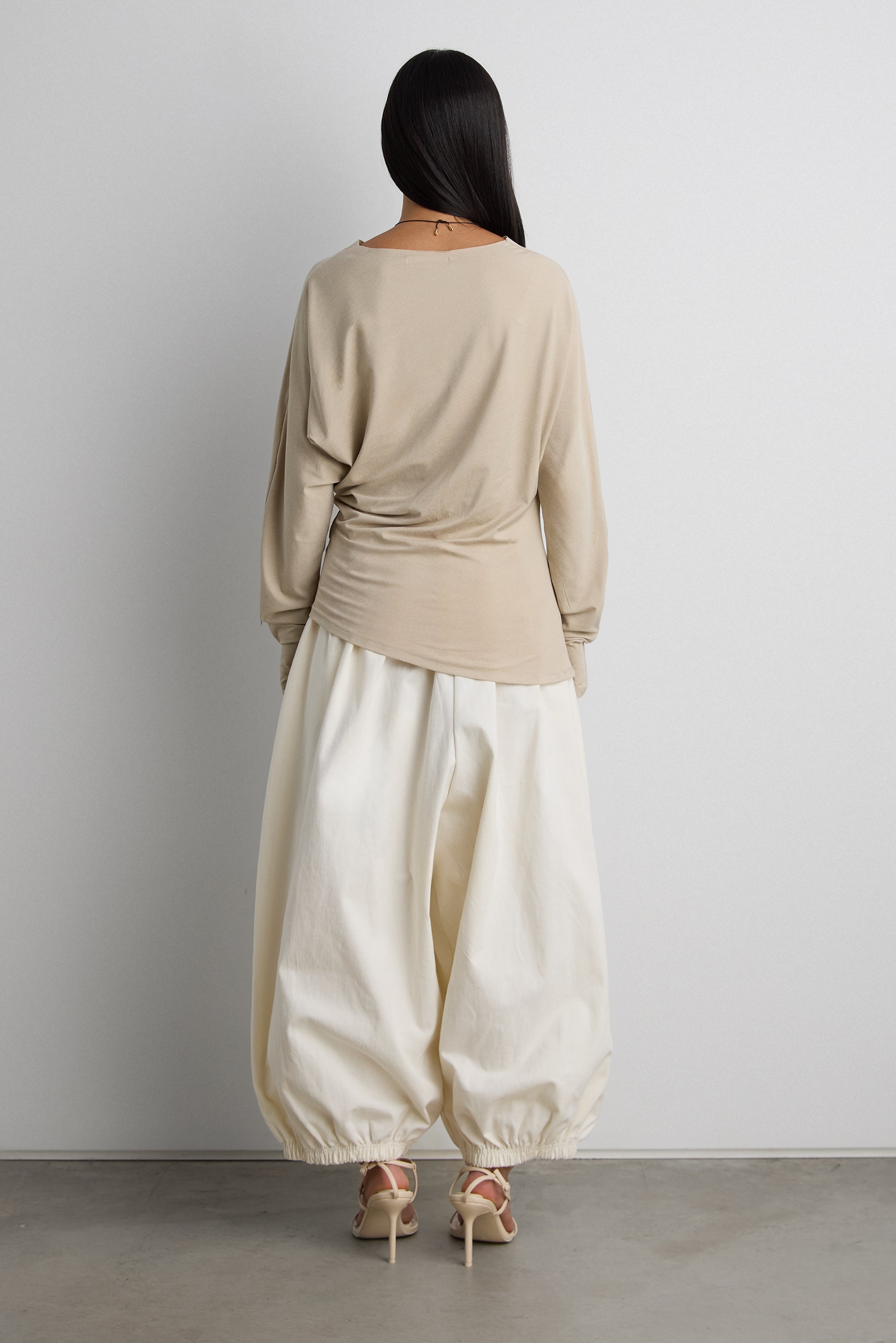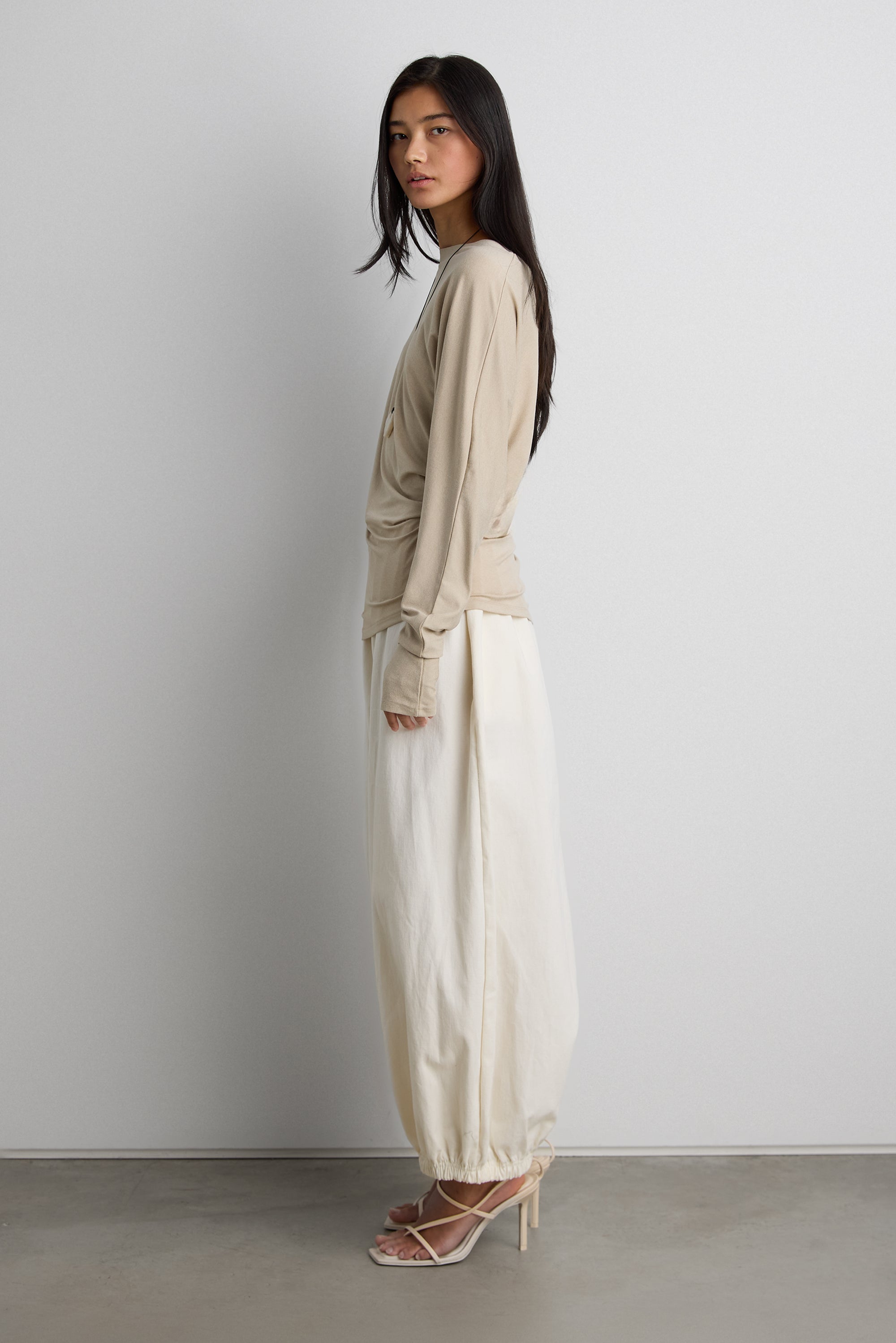 Draped silhouette. Long sleeves. Thumb holes.