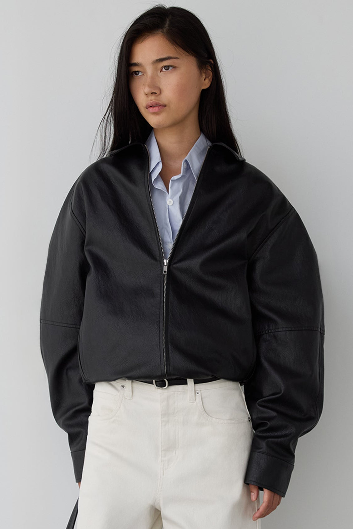Our best-selling vegan leather bomber jacket is back. A wardrobe must-have made in an oversized fit and is detailed with a collared neckline, elasticated trims, a quilted interior and side pockets. A wardrobe staple to wear year after year.